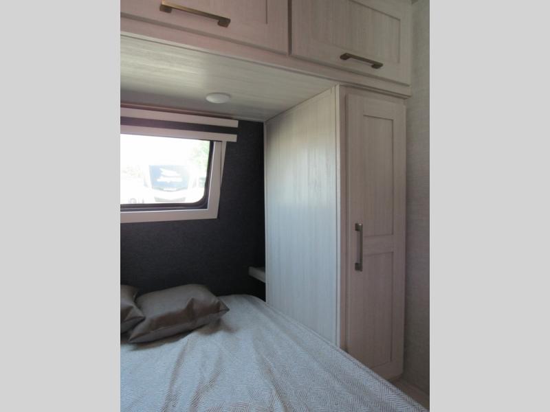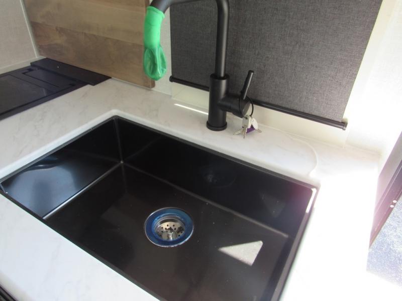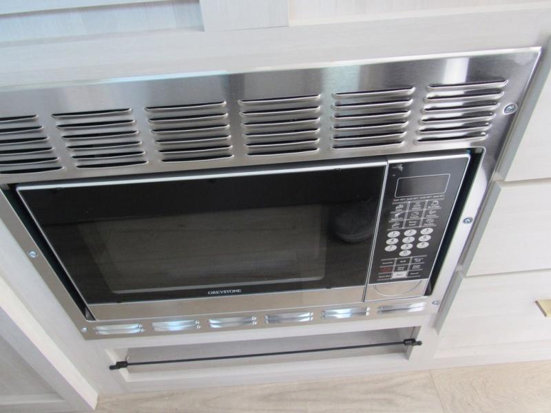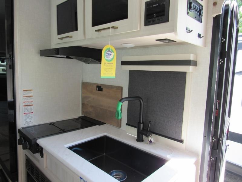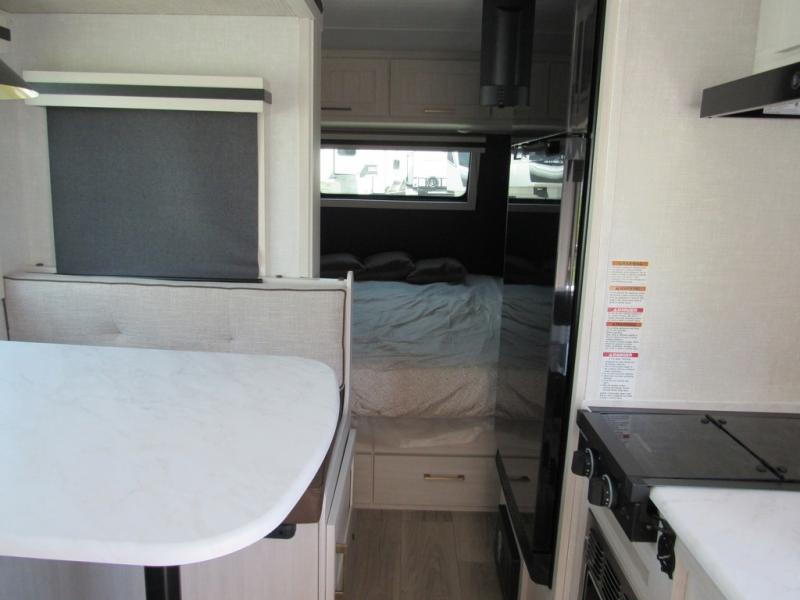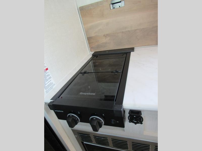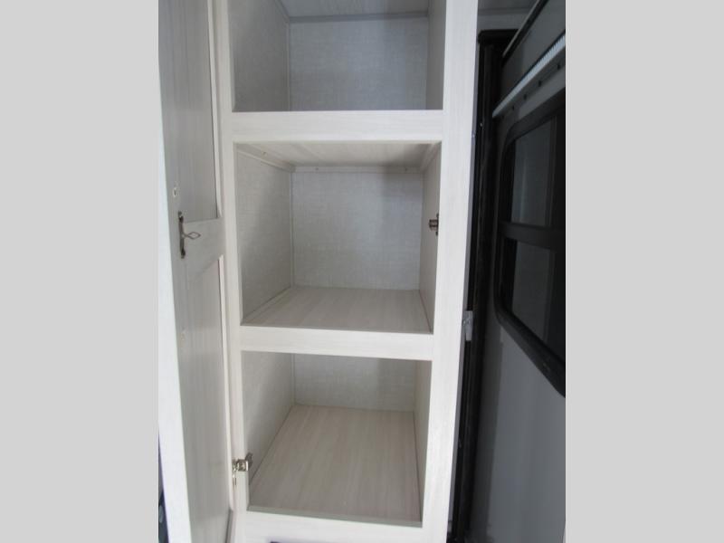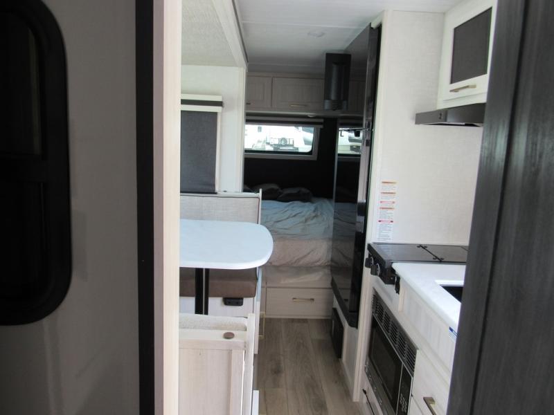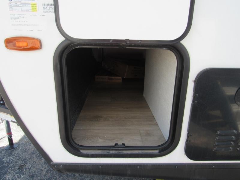 This couple's trailer resembles the layout of model 19MBLE, but with a queen-size bed up front instead of a Murphy bed. If you have an overnight guest or two little ones, they can sleep on the dinette slide, and everyone will appreciate the privacy of the full rear bath. You will have everything needed each day to prepare meals, including a two burner cooktop, a convection microwave, plus an outside kitchen. The pass-through storage will be be perfect for fishing poles, tackle boxes, or lawn chairs, and there is a 15' electric awning with LED lights to relax under!
