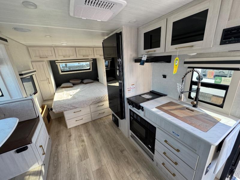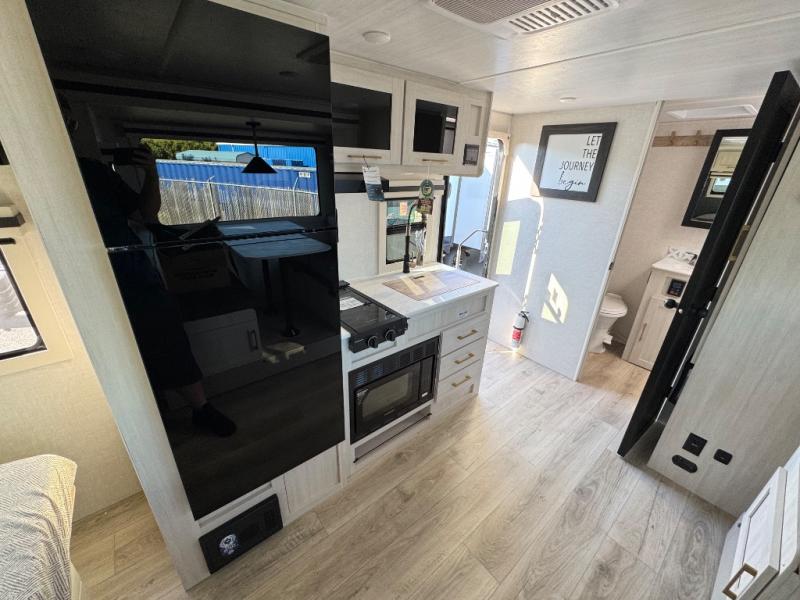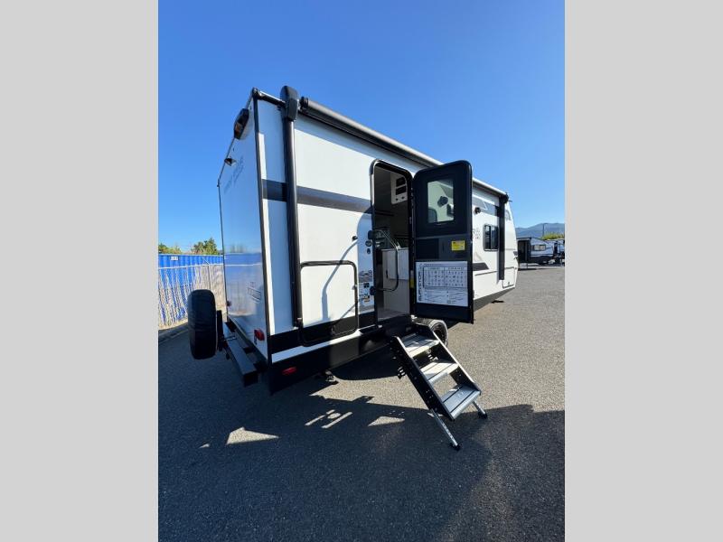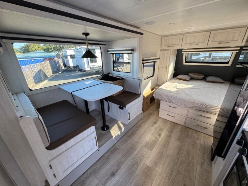 This couple's trailer resembles the layout of model 19MBLE, but with a queen-size bed up front instead of a Murphy bed. If you have an overnight guest or two little ones, they can sleep on the dinette slide, and everyone will appreciate the privacy of the full rear bath. You will have everything needed each day to prepare meals, including a two burner cooktop, a convection microwave, plus an outside kitchen. The pass-through storage will be be perfect for fishing poles, tackle boxes, or lawn chairs, and there is a 15' electric awning with LED lights to relax under!