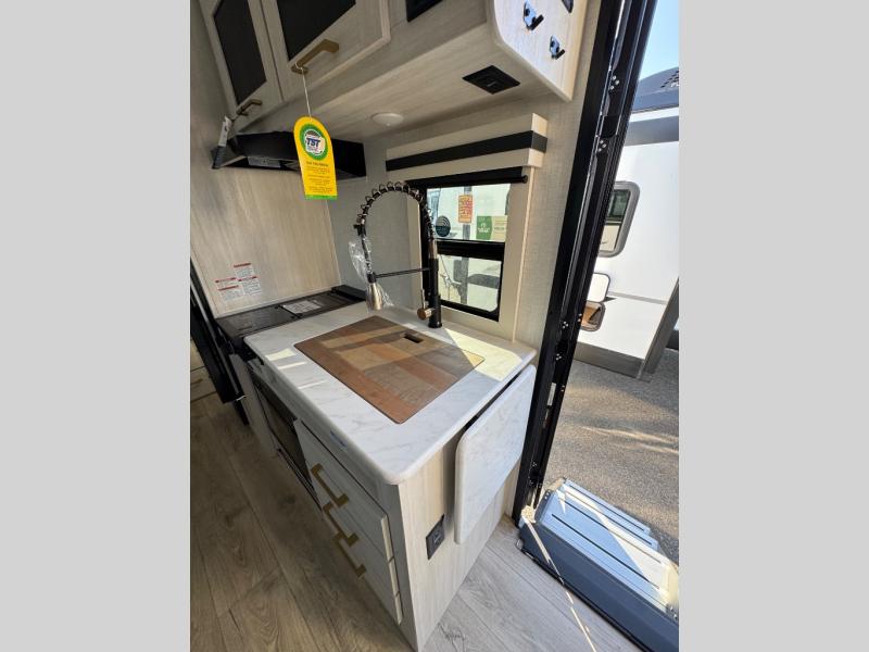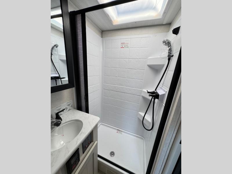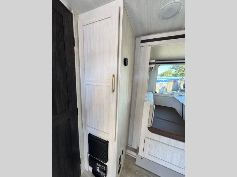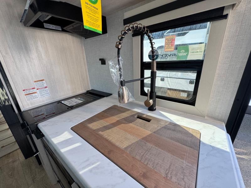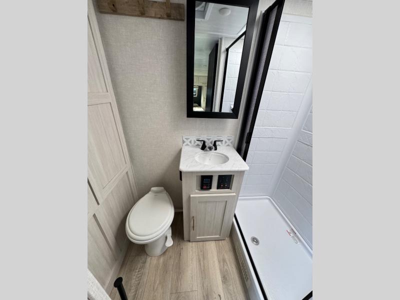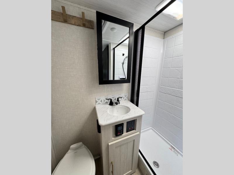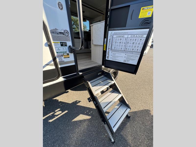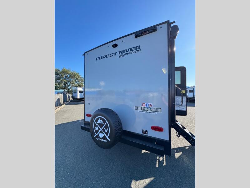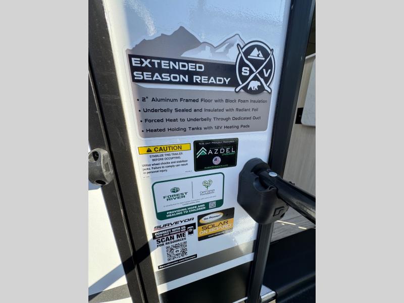 With any Surveyor Legend travel trailer by Forest River you will enjoy quality craftsmanship, convenient amenities, and at-home comforts. The Azdel composite walls provide a longer-lasting trailer, and the power tongue jack with a hitch light will get you back on the road in no-time. There are also Goodyear tires and a tire pressure monitoring system for hassle-free towing. Each model includes the Surveyor Legend Package that comes standard with oversized dinette storage access doors, front slam latch baggage doors, plus an automotive style tinted front windshield. You'll appreciate camping with a tankless water heater for endless hot showers, a 2" accessory hitch to bring bikes along, plus carpet-free interiors and a central vacuum system for easy clean up.