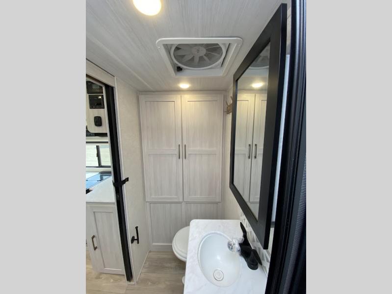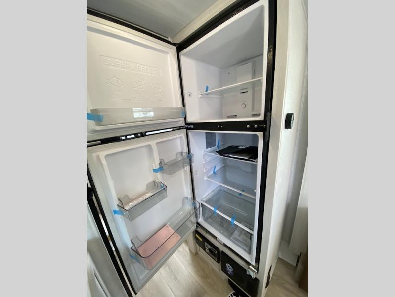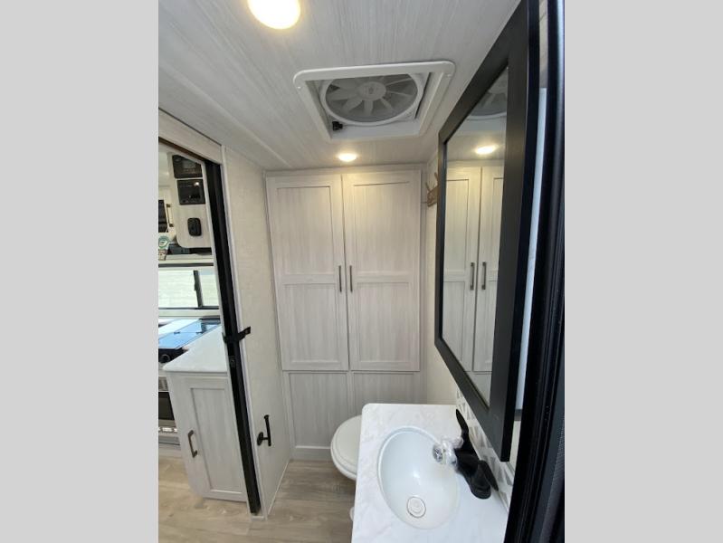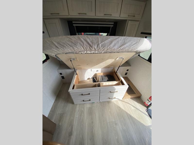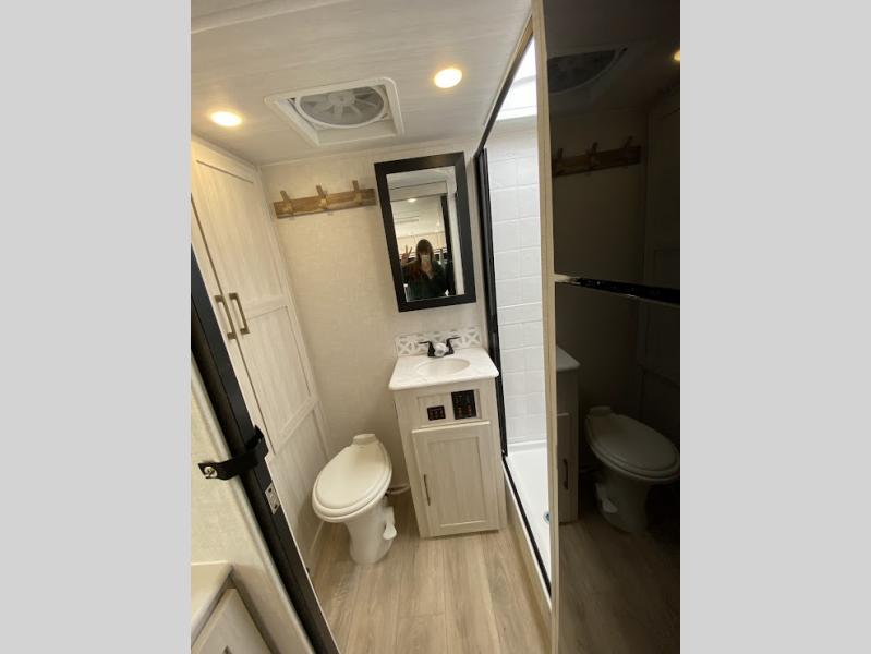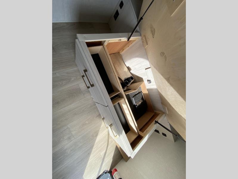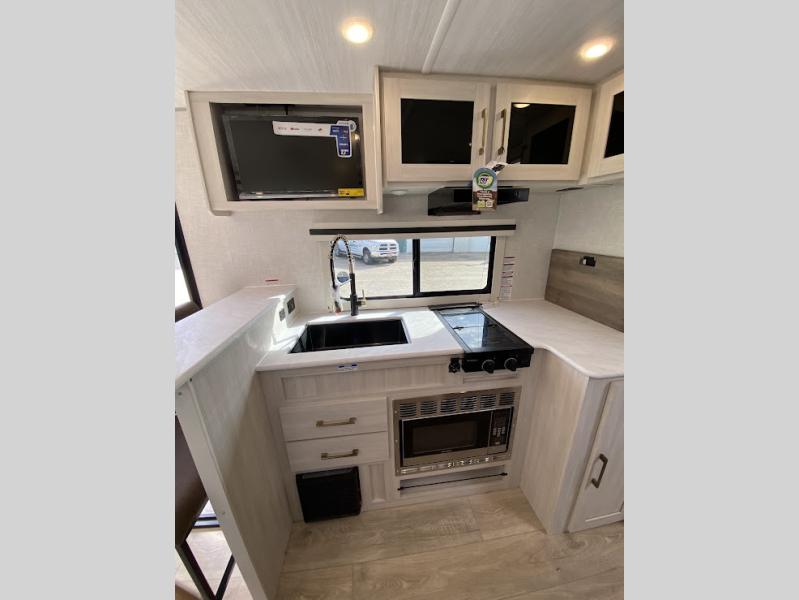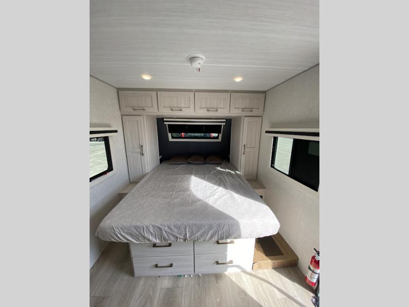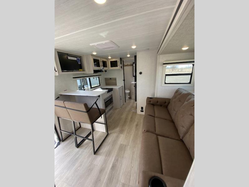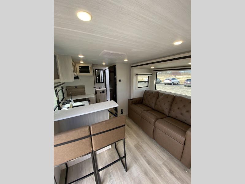 Hit the road with this Surveyor Legend trailer in tow, featuring a tri-fold sofa slide for added seating, sleeping, and interior space. You will also love the breakfast bar with two stools for dining. The queen bed up front will provide a great night's rest, and there is overhead storage at the head of the bed along with dual wardrobes for your things on either side. If you have an overnight guest or two little ones, they can sleep on the tri-fold sofa slide, and everyone will appreciate the privacy of the full rear bath. You will have everything needed each day to prepare meals, including a two burner cooktop, a convection microwave, and refrigerator for your perishables. The pass-through storage will be be perfect for fishing poles, outdoor chairs, yard games, plus there is additional outdoor storage along the rear curbside for your hiking gear!