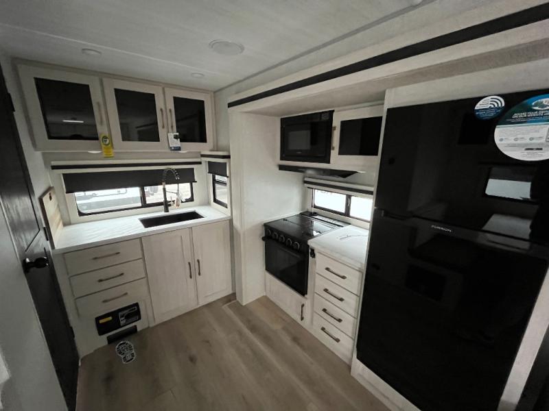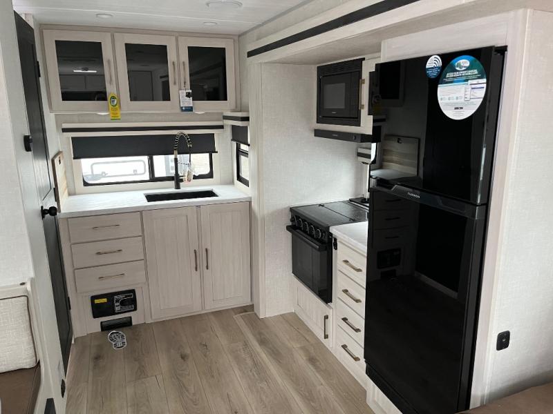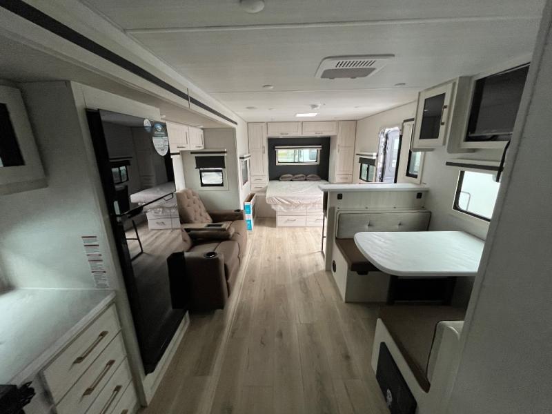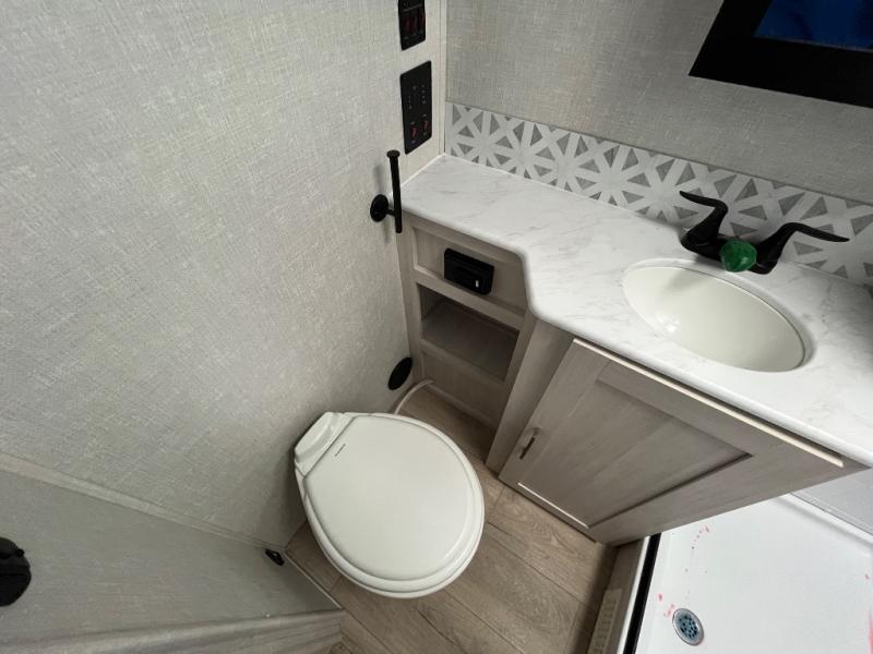 You'll love camping and spending time with loved ones in this spacious travel trailer. The 18' power awning with LED lights can be set up once you arrive at the campground, and you can unload camp gear from the pass-through storage. Head inside to make lunch on the residential range top or in the microwave oven. There is a booth dinette and tri-fold sofa for seating space, plus an additional counter with bar stools beside the dinette. A full bath onboard lets you clean up each day, and the front queen bed is sure to bring a great night's rest. There are also dual wardrobes to keep your space tidy and overhead storage for even more belongings.