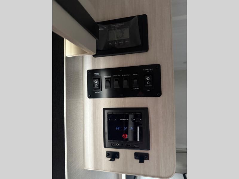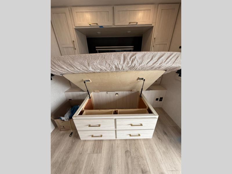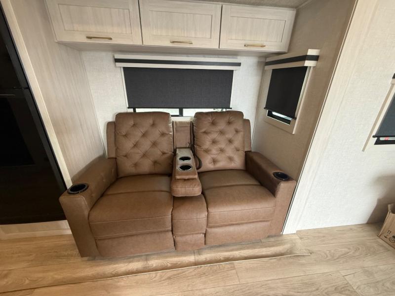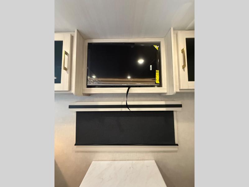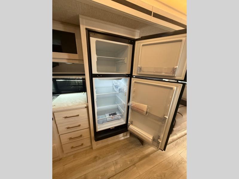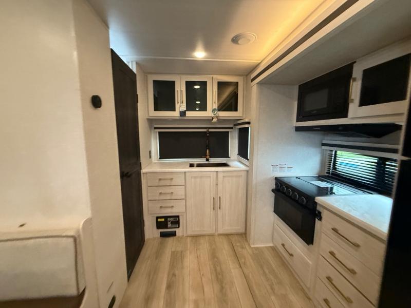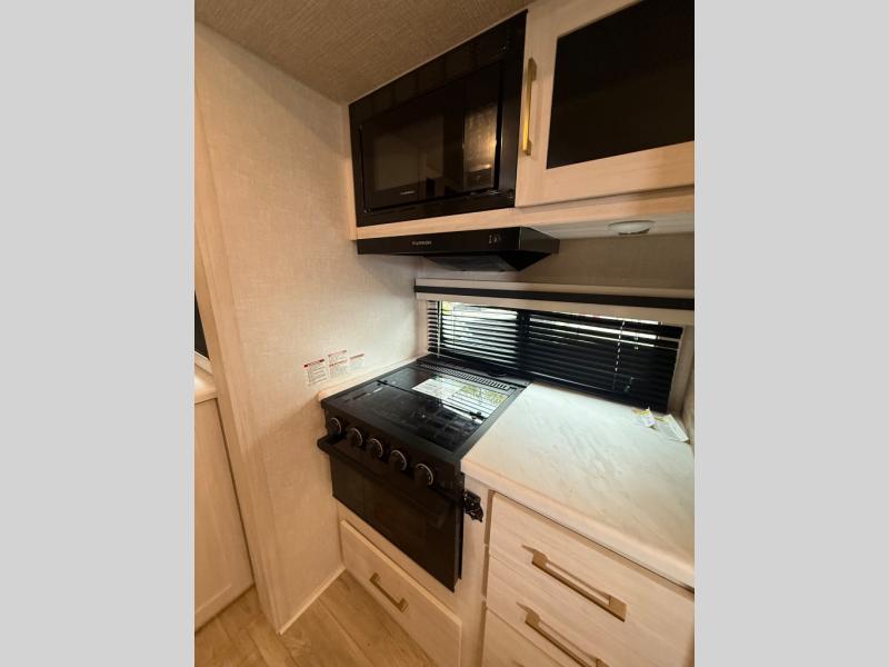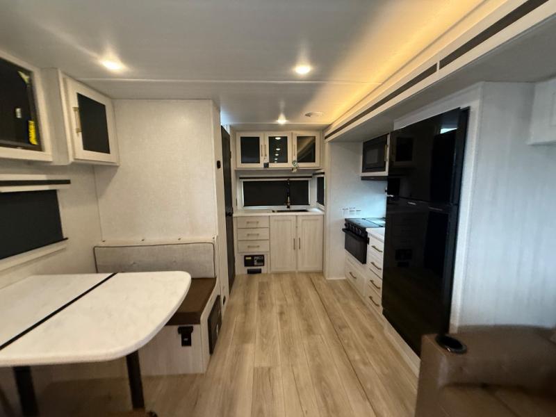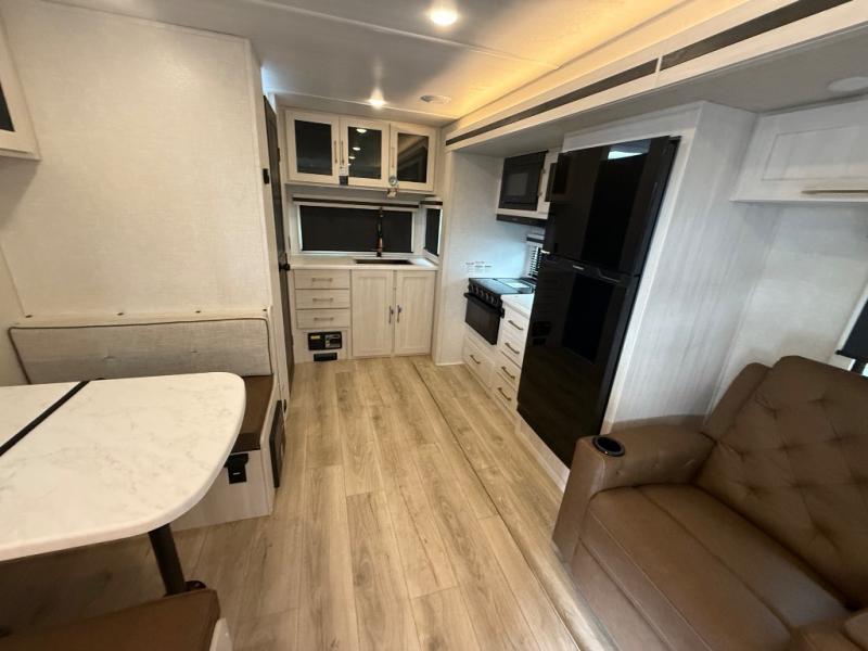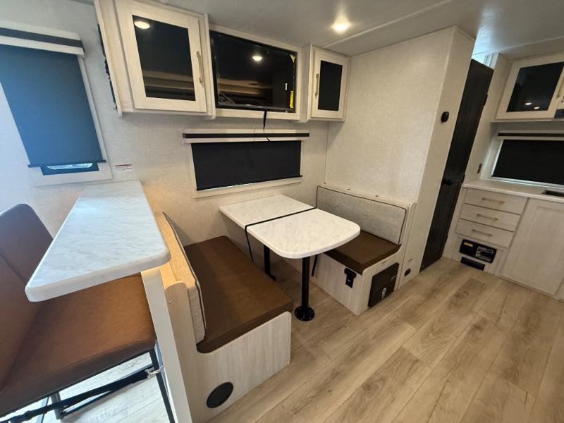 You'll love camping and spending time with loved ones in this spacious travel trailer. The 18' power awning with LED lights can be set up once you arrive at the campground, and you can unload camp gear from the pass-through storage. Head inside to make lunch on the residential range top or in the microwave oven. There is a booth dinette and tri-fold sofa for seating space, plus an additional counter with bar stools beside the dinette. A full bath onboard lets you clean up each day, and the front queen bed is sure to bring a great night's rest. There are also dual wardrobes to keep your space tidy and overhead storage for even more belongings.