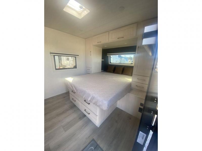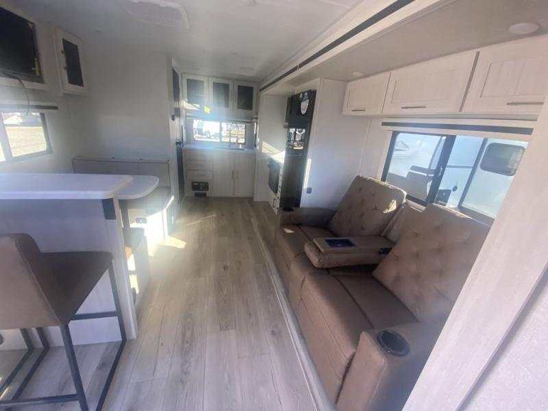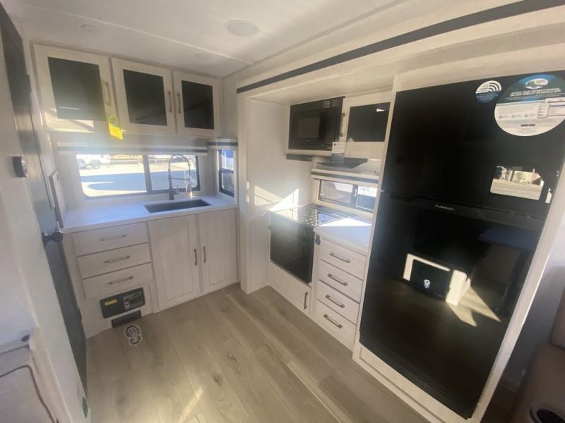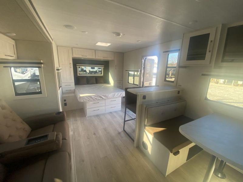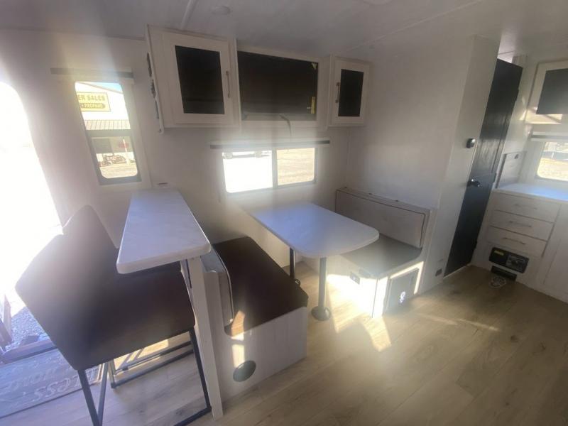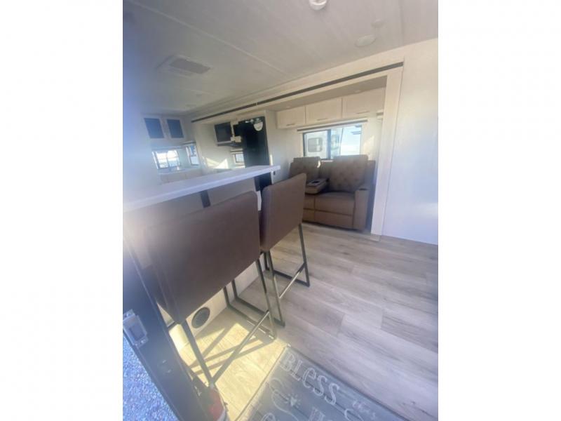 You'll love camping and spending time with loved ones in this spacious travel trailer. The 18' power awning with LED lights can be set up once you arrive at the campground, and you can unload camp gear from the pass-through storage. Head inside to make lunch on the residential range top or in the microwave oven. There is a booth dinette and tri-fold sofa for seating space, plus an additional counter with bar stools beside the dinette. A full bath onboard lets you clean up each day, and the front queen bed is sure to bring a great night's rest. There are also dual wardrobes to keep your space tidy and overhead storage for even more belongings.