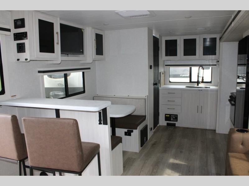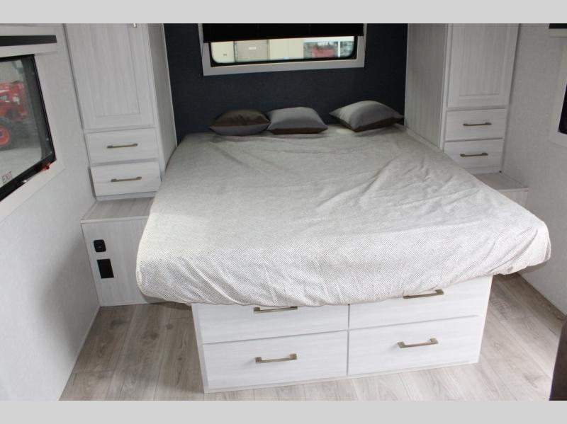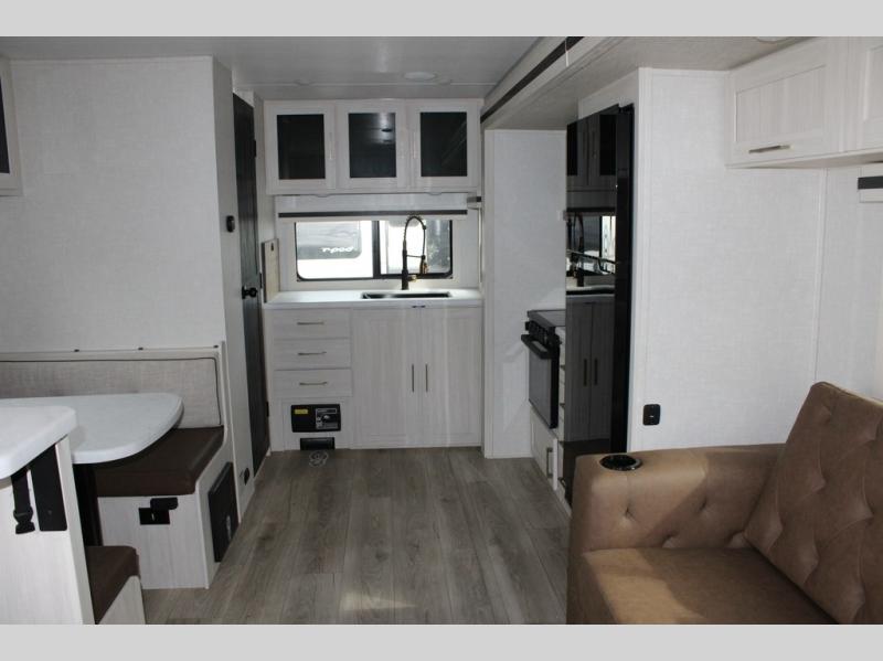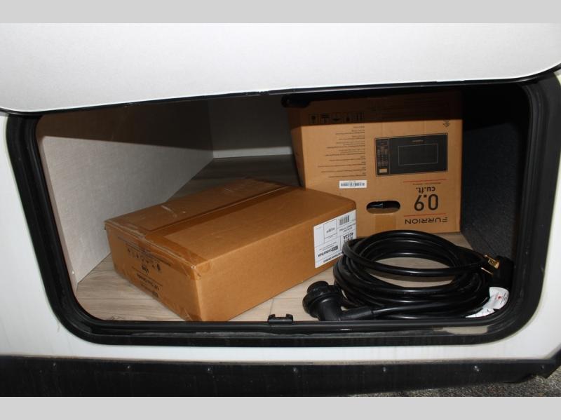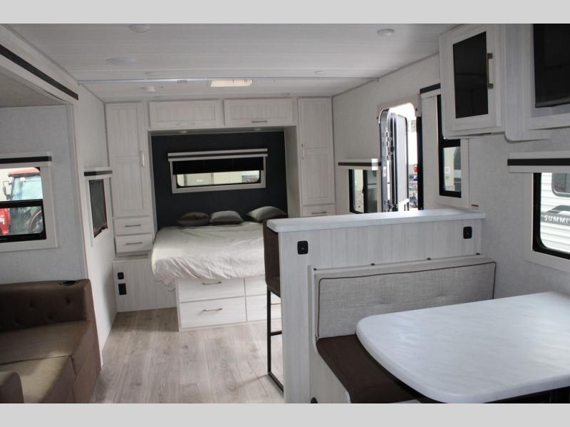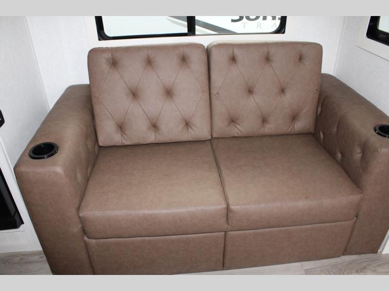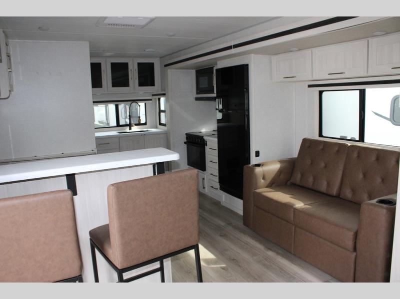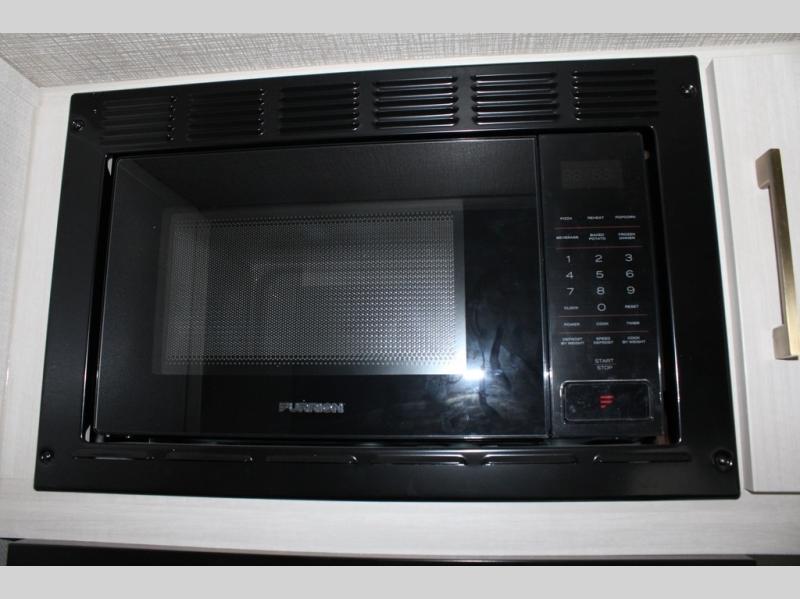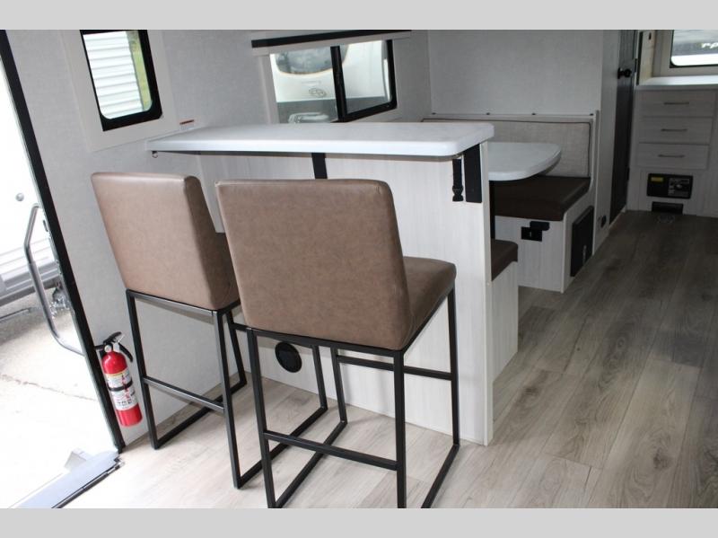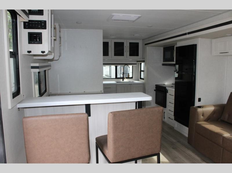 You'll love camping and spending time with loved ones in this spacious travel trailer. The 18' power awning with LED lights can be set up once you arrive at the campground, and you can unload camp gear from the pass-through storage. Head inside to make lunch on the residential range top or in the microwave oven. There is a booth dinette and tri-fold sofa for seating space, plus an additional counter with bar stools beside the dinette. A full bath onboard lets you clean up each day, and the front queen bed is sure to bring a great night's rest. There are also dual wardrobes to keep your space tidy and overhead storage for even more belongings.