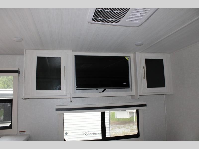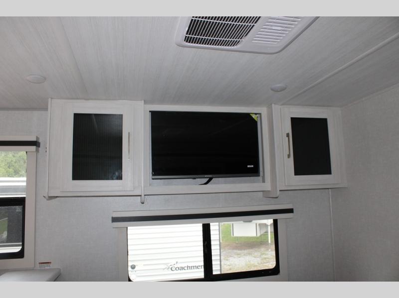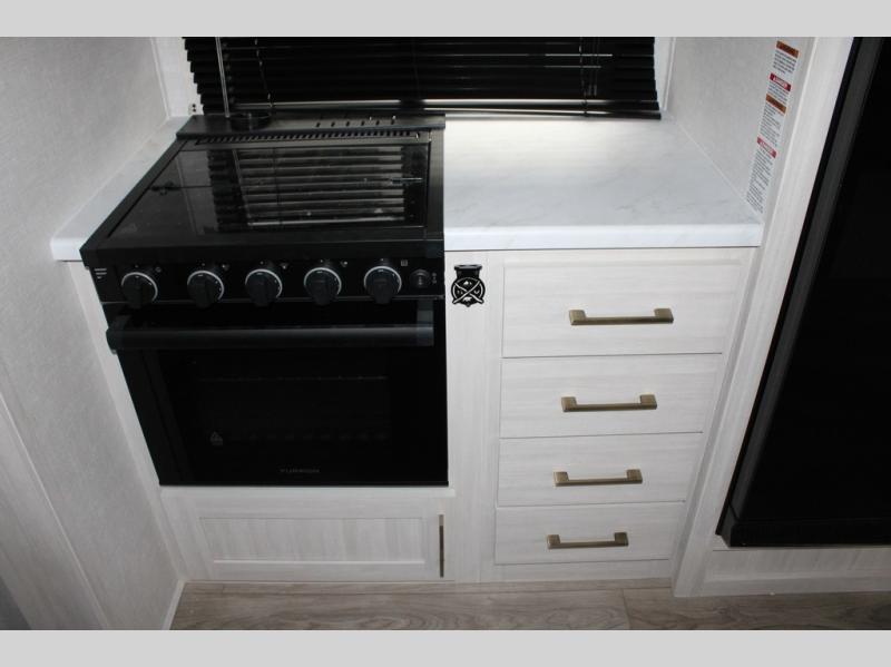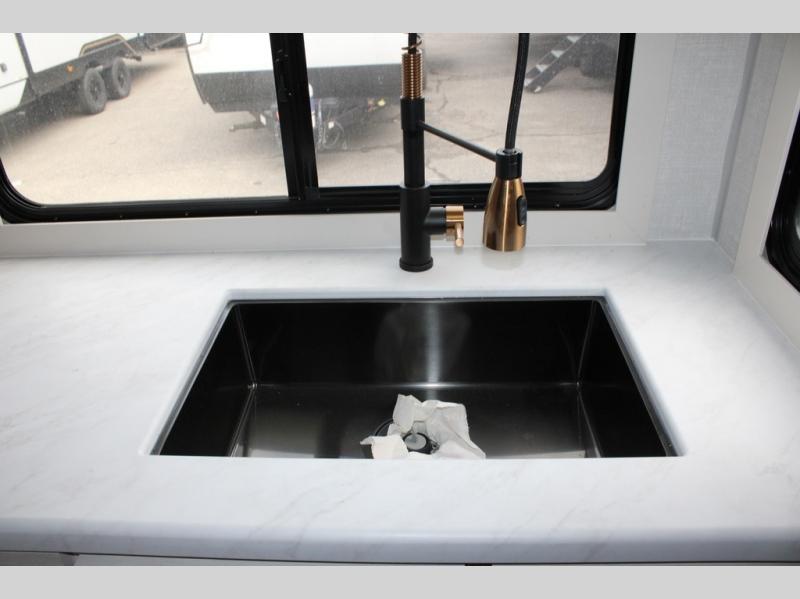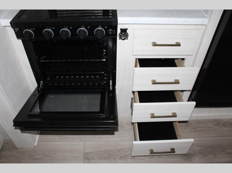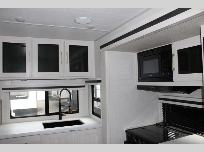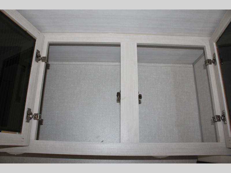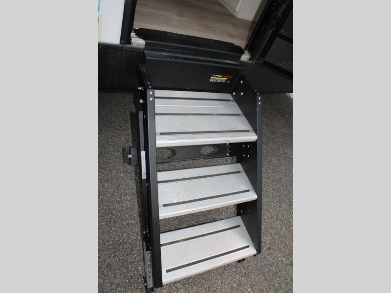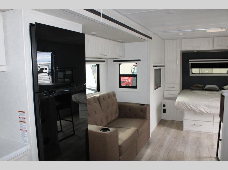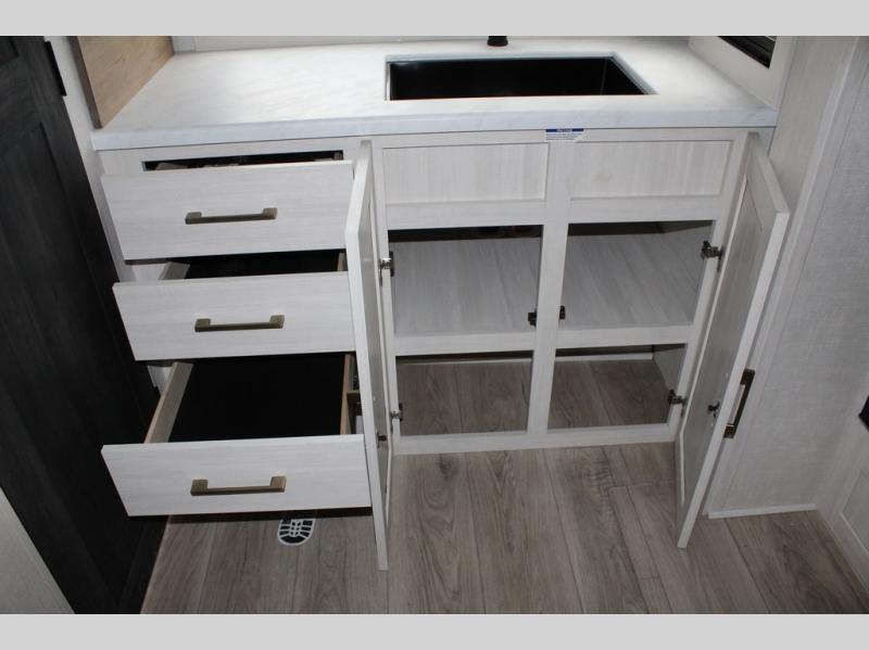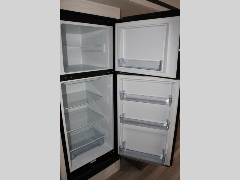 You'll love camping and spending time with loved ones in this spacious travel trailer. The 18' power awning with LED lights can be set up once you arrive at the campground, and you can unload camp gear from the pass-through storage. Head inside to make lunch on the residential range top or in the microwave oven. There is a booth dinette and tri-fold sofa for seating space, plus an additional counter with bar stools beside the dinette. A full bath onboard lets you clean up each day, and the front queen bed is sure to bring a great night's rest. There are also dual wardrobes to keep your space tidy and overhead storage for even more belongings.
