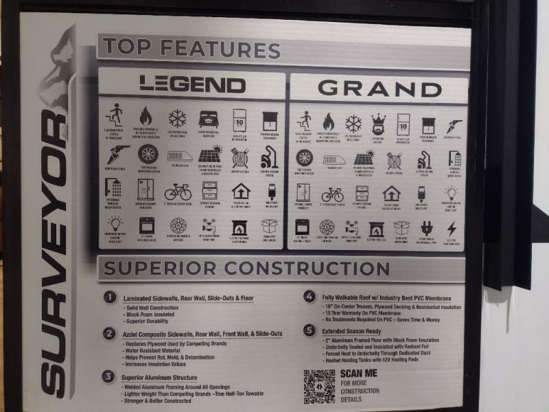 With any Surveyor Legend travel trailer by Forest River you will enjoy quality craftsmanship, convenient amenities, and at-home comforts. The Azdel composite walls provide a longer-lasting trailer, and the power tongue jack with a hitch light will get you back on the road in no-time. There are also Goodyear tires and a tire pressure monitoring system for hassle-free towing. Each model includes the Surveyor Legend Package that comes standard with oversized dinette storage access doors, front slam latch baggage doors, plus an automotive style tinted front windshield. You'll appreciate camping with a tankless water heater for endless hot showers, a 2" accessory hitch to bring bikes along, plus carpet-free interiors and a central vacuum system for easy clean up.