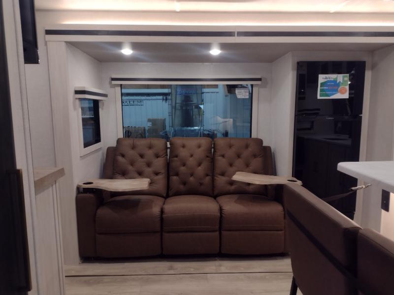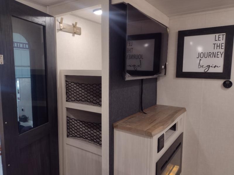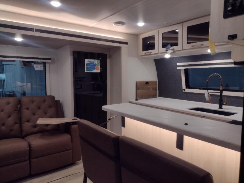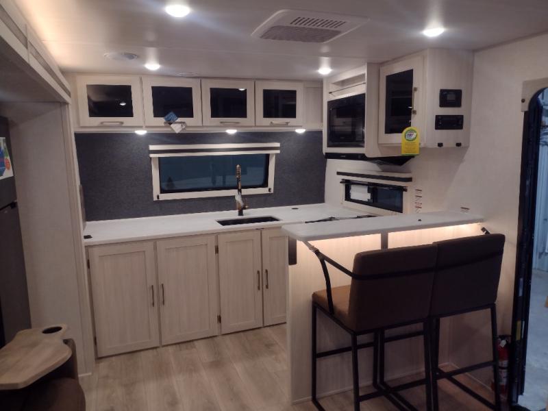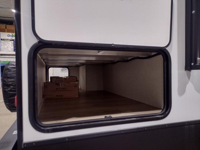 This dual entry, front kitchen travel trailer is perfect for three to four campers. You will have a rear private bedroom with a walk-around queen bed, dual wardrobes, TV prep, plus your own exterior entry door. Your guests can sleep on the booth dinette within the slide out, or you can choose the optional tri-fold sofa with a removable table. Preparing meals each day will be a breeze in the front kitchen that includes ample counter space, a residential range top with a glass cover, plus a spacious walk-in pantry. There is also an outside kitchen with a refrigerator, an 18' power awning with LED lights, and a pass-through storage for camp gear!