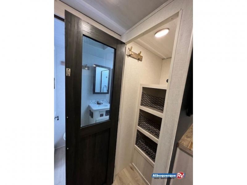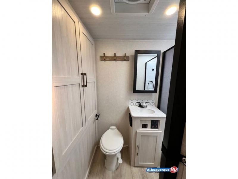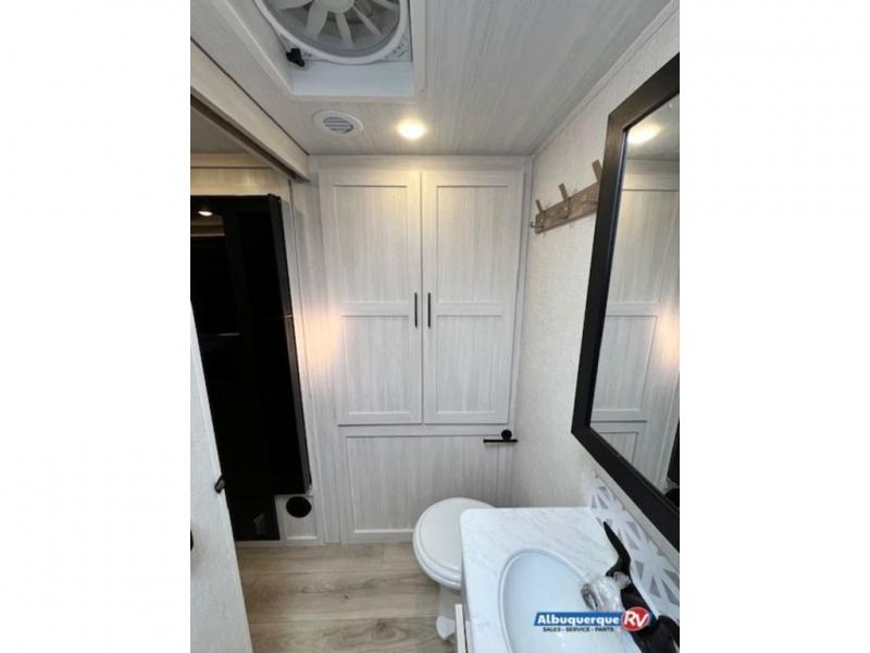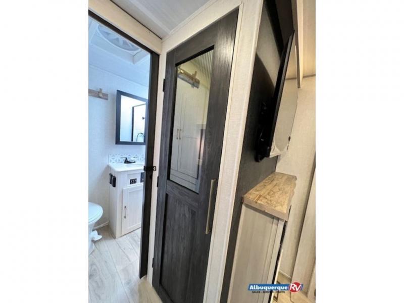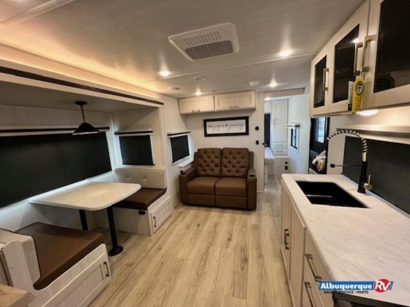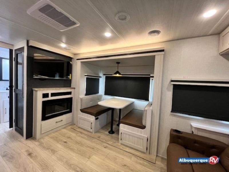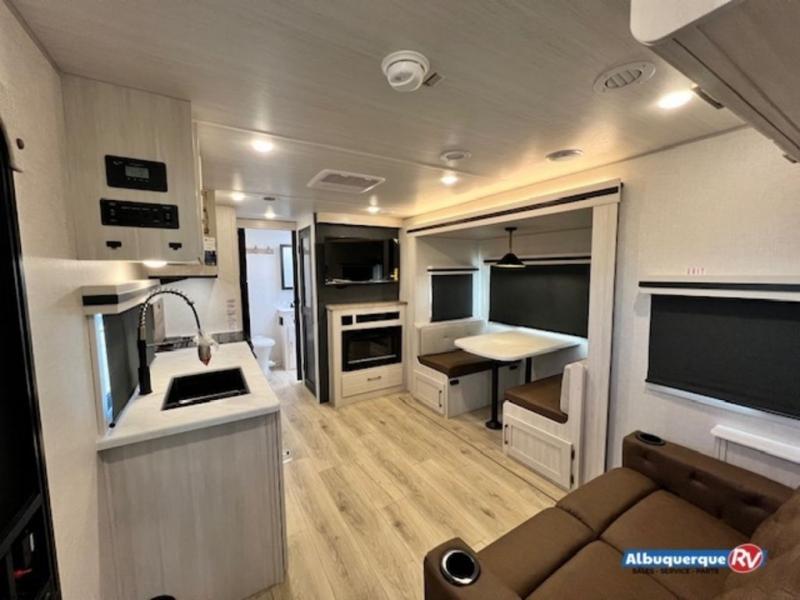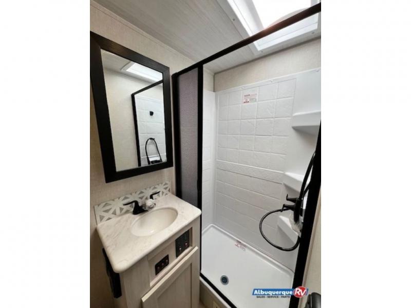 Whether you're camping with friends or family, you'll love the space and comfort found in this travel trailer. The outside kitchen is packed with features, such as a gas griddle, sink, refrigerator, and a shelf, plus there is a 21' electric awning for shade. Head inside to relax on the tri-fold sofa, or play a game at the booth dinette. You will also love the HD TV for your favorite shows at night. This model includes a full rear bath with a linen closet for clean towels and an upgraded slow-close shower door.