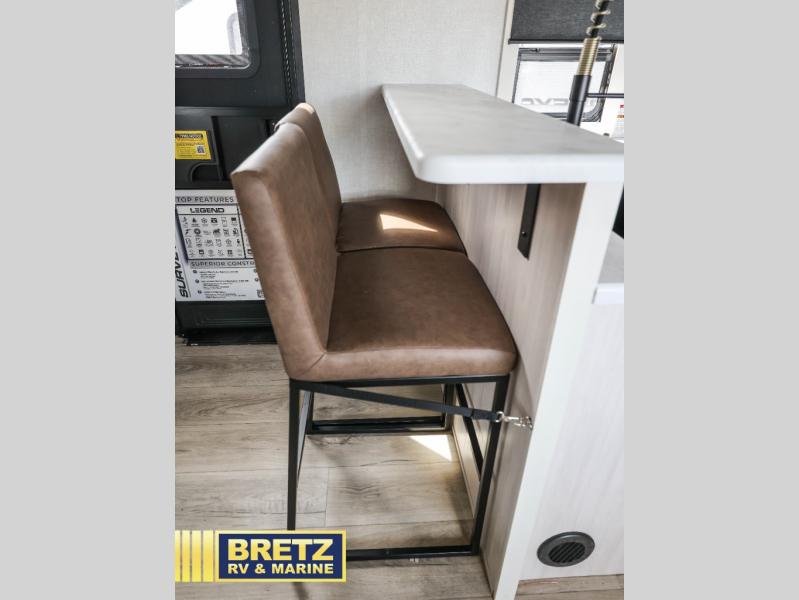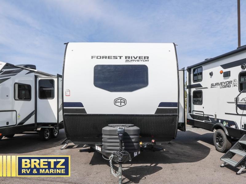 With any Surveyor Legend travel trailer by Forest River you will enjoy quality craftsmanship, convenient amenities, and at-home comforts. The Azdel composite walls provide a longer-lasting trailer, and the power tongue jack with a hitch light will get you back on the road in no-time. There are also Goodyear tires and a tire pressure monitoring system for hassle-free towing. Each model includes the Surveyor Legend Package that comes standard with oversized dinette storage access doors, front slam latch baggage doors, plus an automotive style tinted front windshield. You'll appreciate camping with a tankless water heater for endless hot showers, a 2" accessory hitch to bring bikes along, plus carpet-free interiors and a central vacuum system for easy clean up.