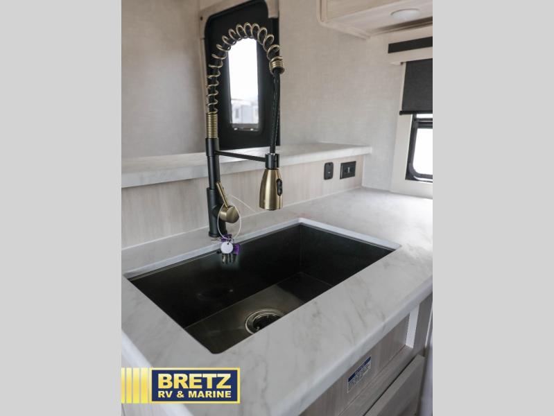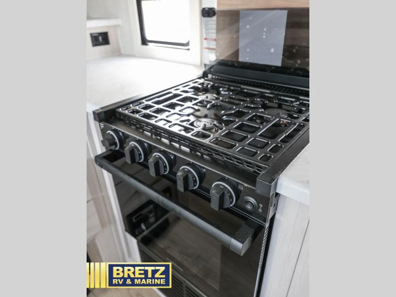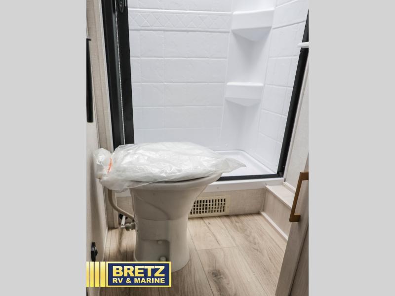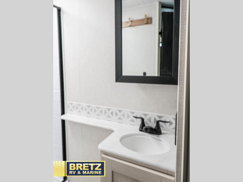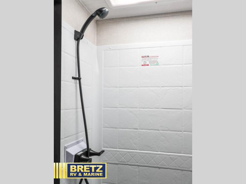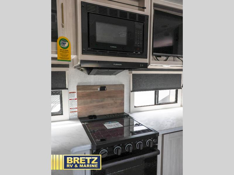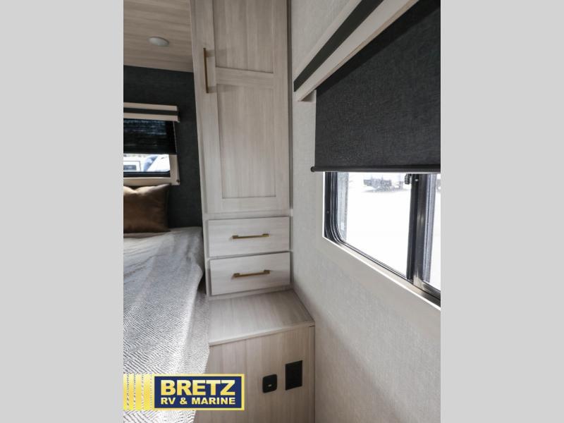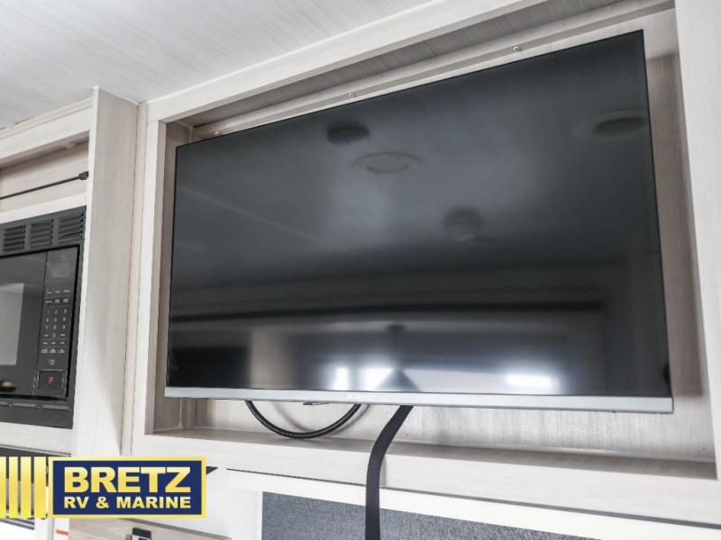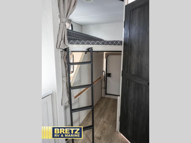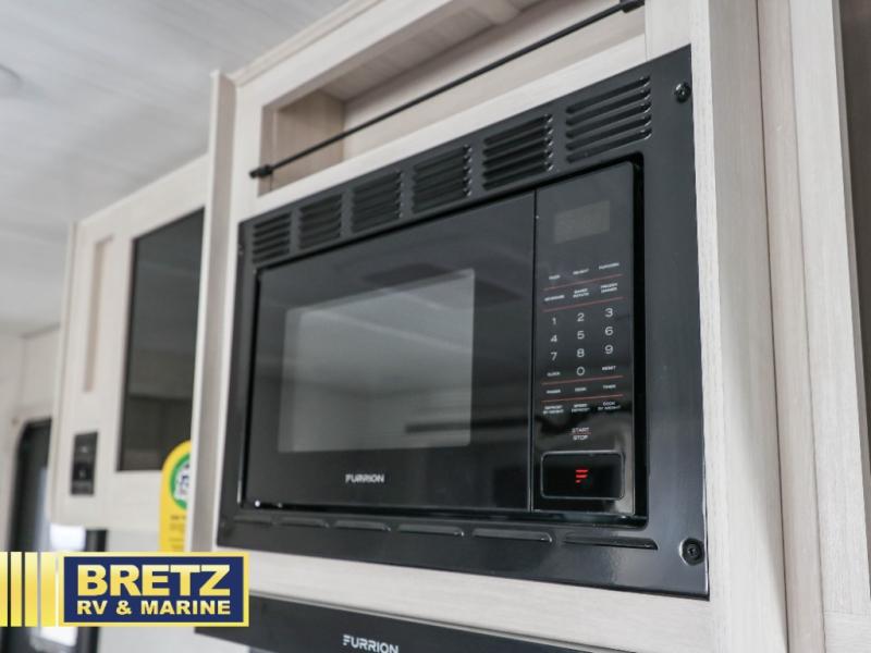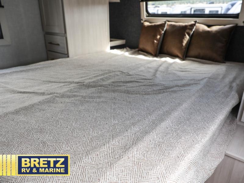 Every trip to the campground will be spent in comfort with this single slide out travel trailer. Once you arrive at the site, remove the kayaks or bikes from the rear storage door, start lunch on the outside kitchen, and put out the 15' power awning with LED lights. The interior includes a booth dinette slide with storage, a bar top with stools, plus an HD TV for movie nights. After a day of fun, head to the front private bedroom for a great night's rest on the queen bed, and you can store your belongings in the dual bedroom wardrobes!