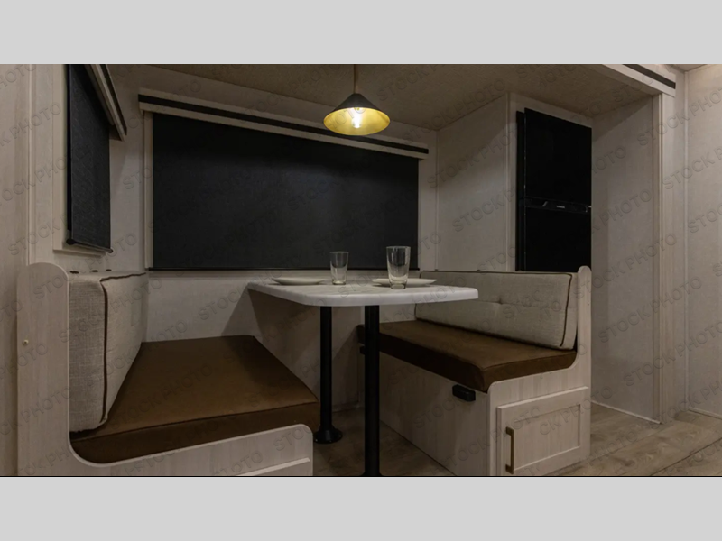 Every trip to the campground will be spent in comfort with this single slide out travel trailer. Once you arrive at the site, remove the kayaks or bikes from the rear storage door, start lunch on the outside kitchen, and put out the 15' power awning with LED lights. The interior includes a booth dinette slide with storage, a bar top with stools, plus an HD TV for movie nights. After a day of fun, head to the front private bedroom for a great night's rest on the queen bed, and you can store your belongings in the dual bedroom wardrobes!