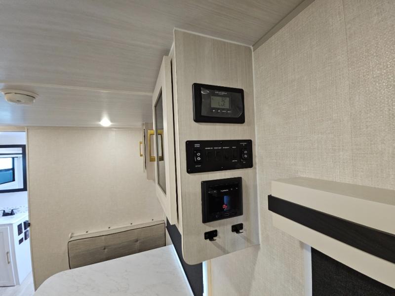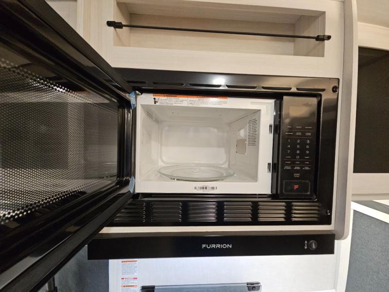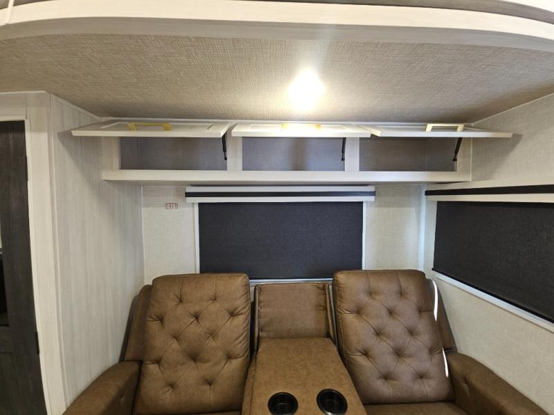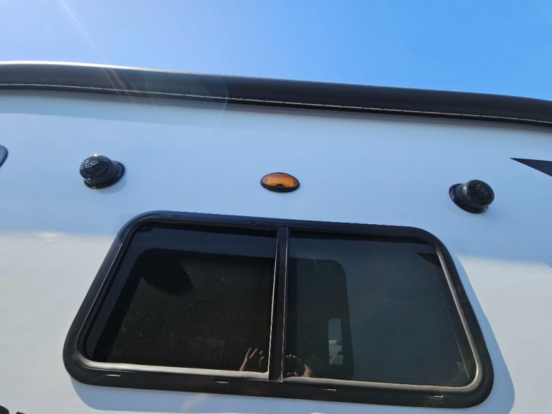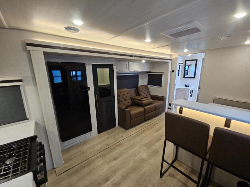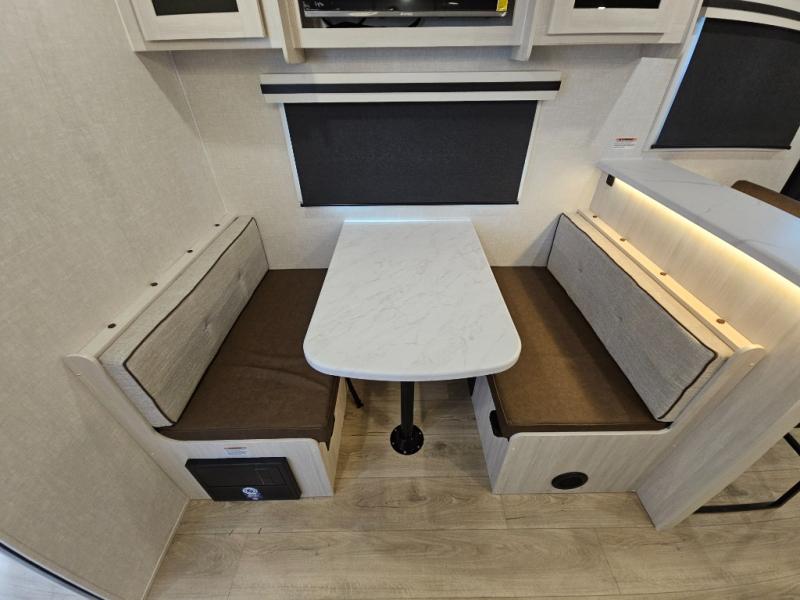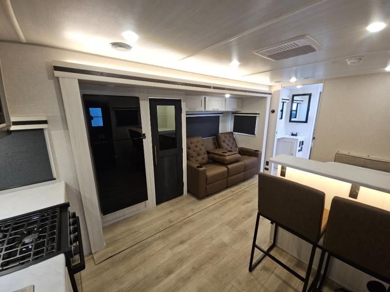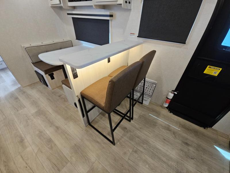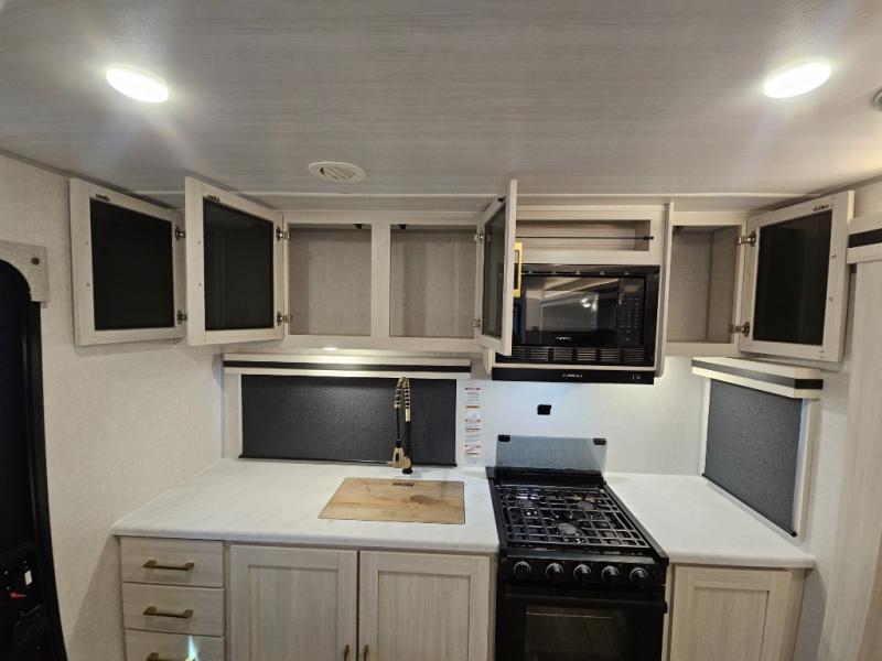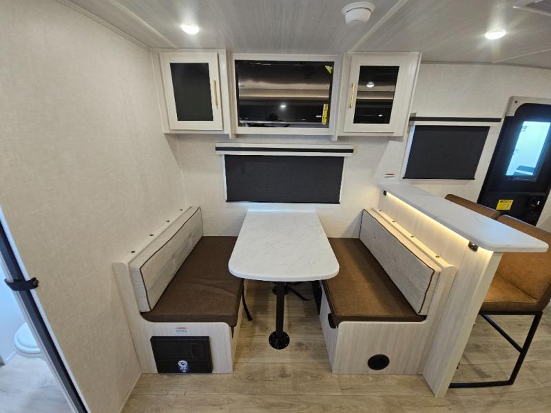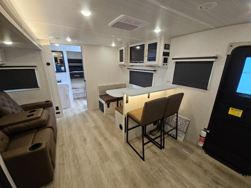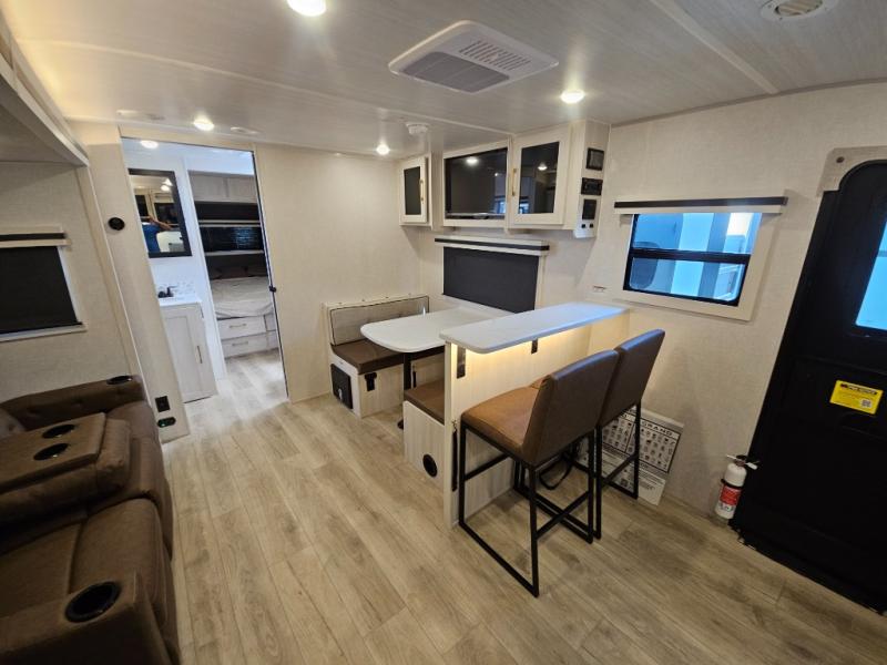 You'll love every minute spent in this cozy and convenient travel trailer. Since there are dual entry doors, you can enter in through the front master bedroom with a queen bed or the rear kitchen with ample counter space! A walk-thru bath will be easily accessible for everyone to use, and there is a night light here so you don't wake your crew up in the middle of the night. The tri-fold sofa slide in the main living area will provide a cozy seating space, as well as sleeping space for guests. And you can dine each day at the booth dinette or at the bartop with two seats that overlook the dinette!