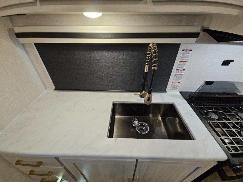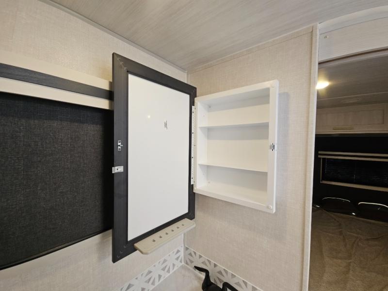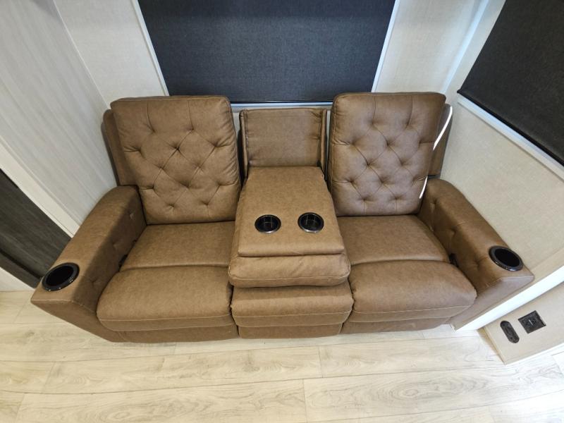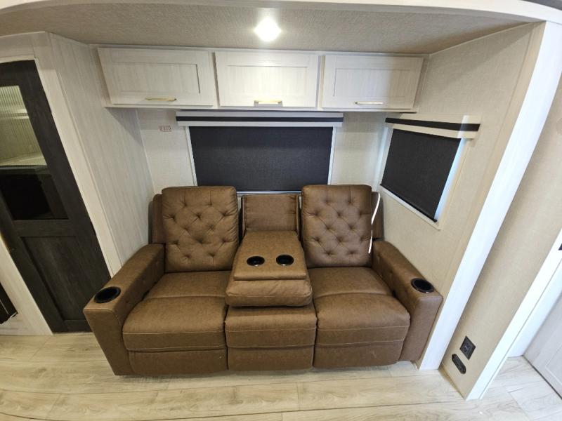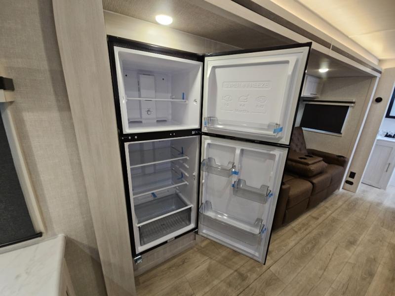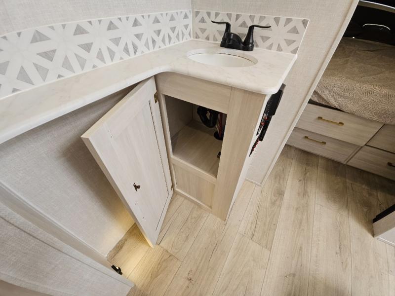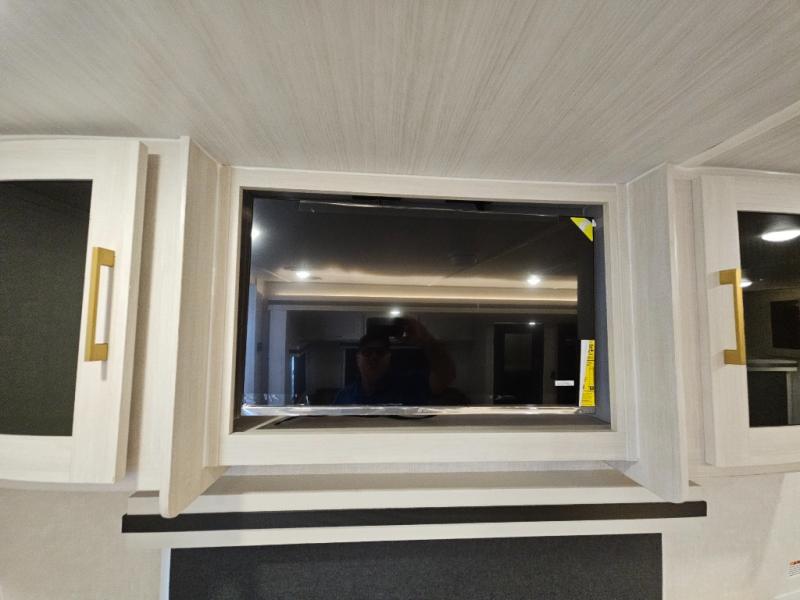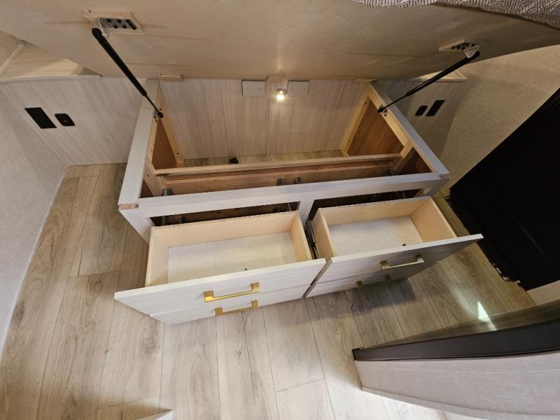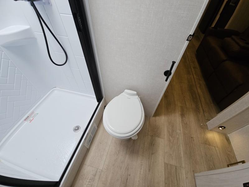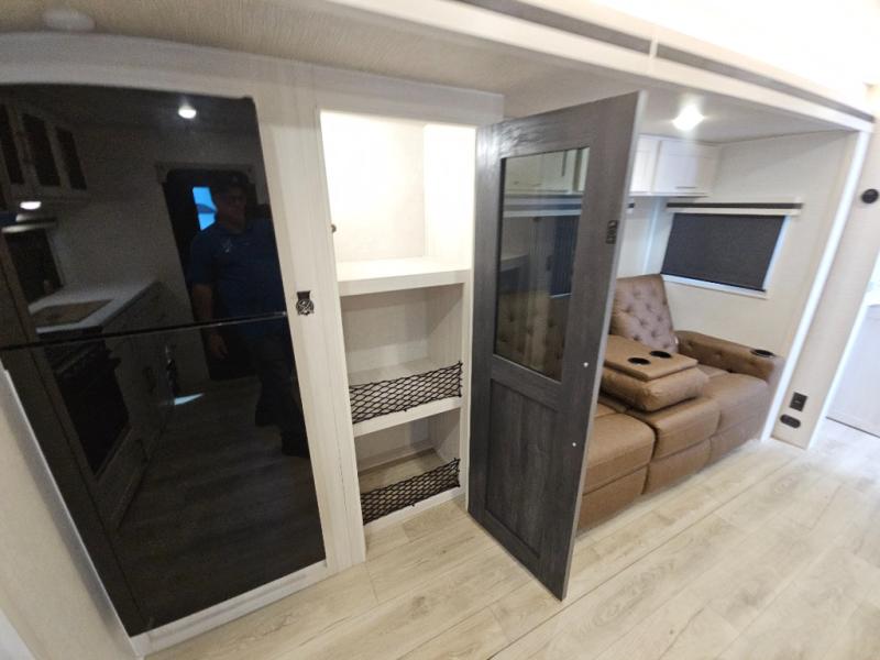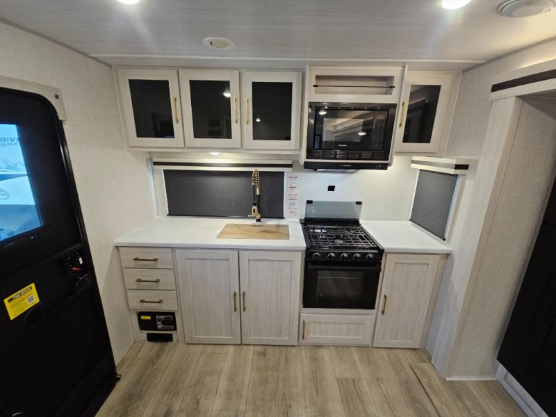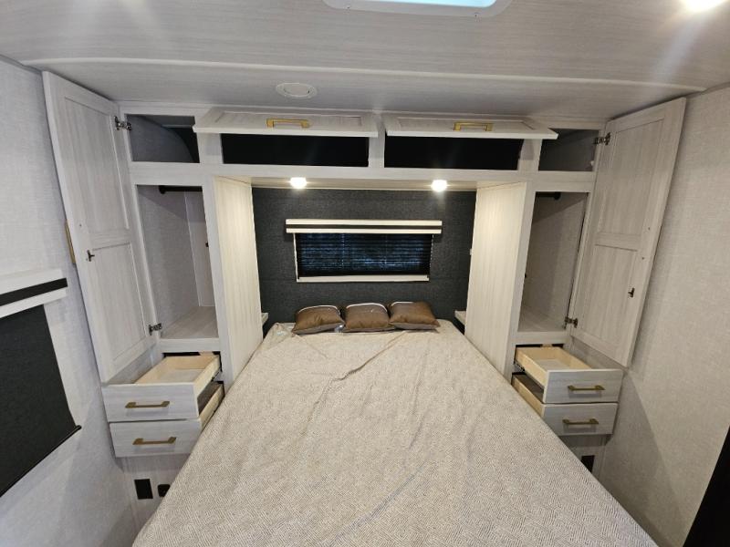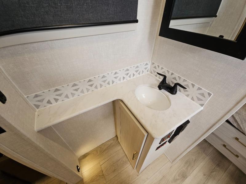 You'll love every minute spent in this cozy and convenient travel trailer. Since there are dual entry doors, you can enter in through the front master bedroom with a queen bed or the rear kitchen with ample counter space! A walk-thru bath will be easily accessible for everyone to use, and there is a night light here so you don't wake your crew up in the middle of the night. The tri-fold sofa slide in the main living area will provide a cozy seating space, as well as sleeping space for guests. And you can dine each day at the booth dinette or at the bartop with two seats that overlook the dinette!