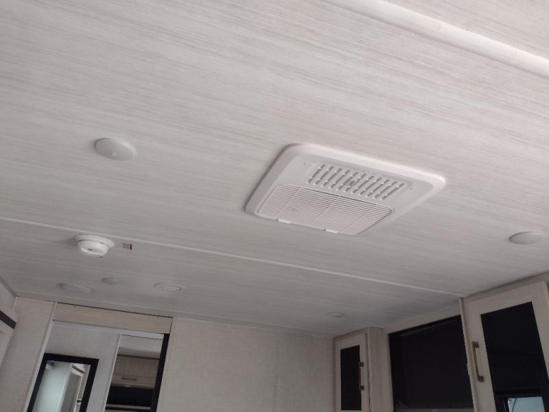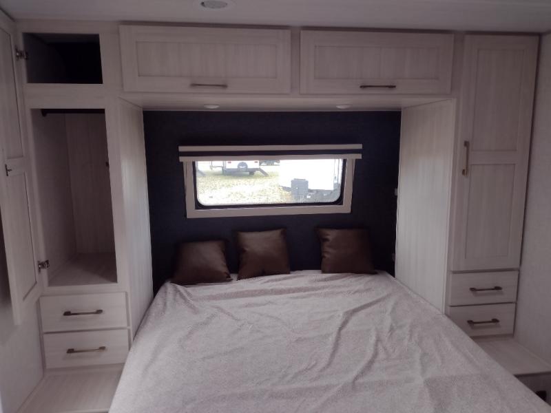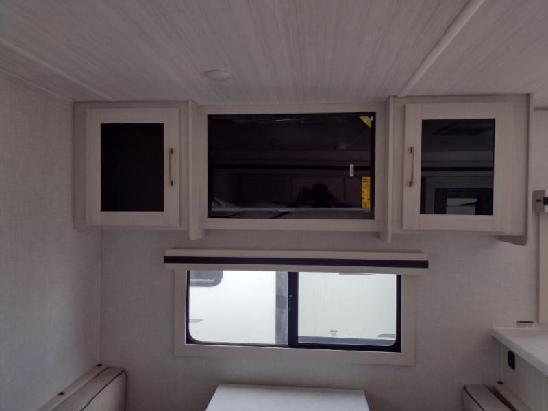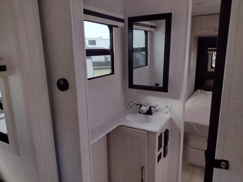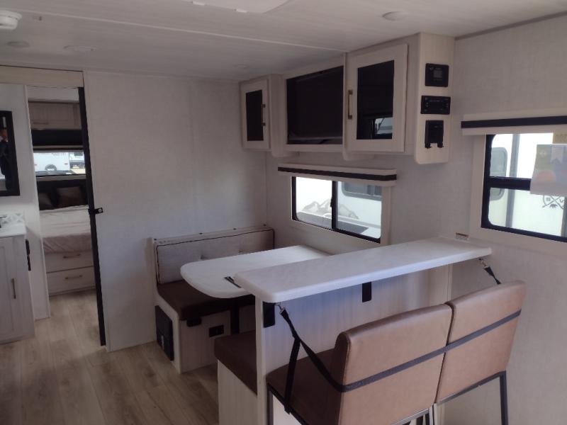 You'll love every minute spent in this cozy and convenient travel trailer. Since there are dual entry doors, you can enter in through the front master bedroom with a queen bed or the rear kitchen with ample counter space! A walk-thru bath will be easily accessible for everyone to use, and there is a night light here so you don't wake your crew up in the middle of the night. The tri-fold sofa slide in the main living area will provide a cozy seating space, as well as sleeping space for guests. And you can dine each day at the booth dinette or at the bartop with two seats that overlook the dinette!