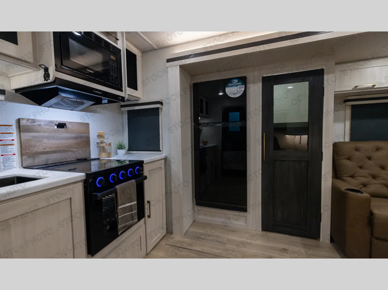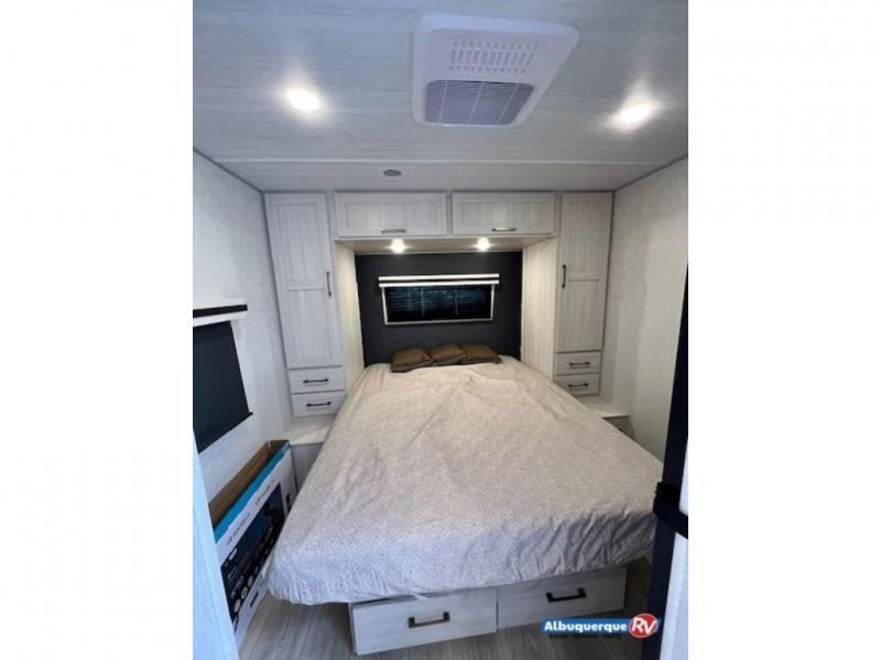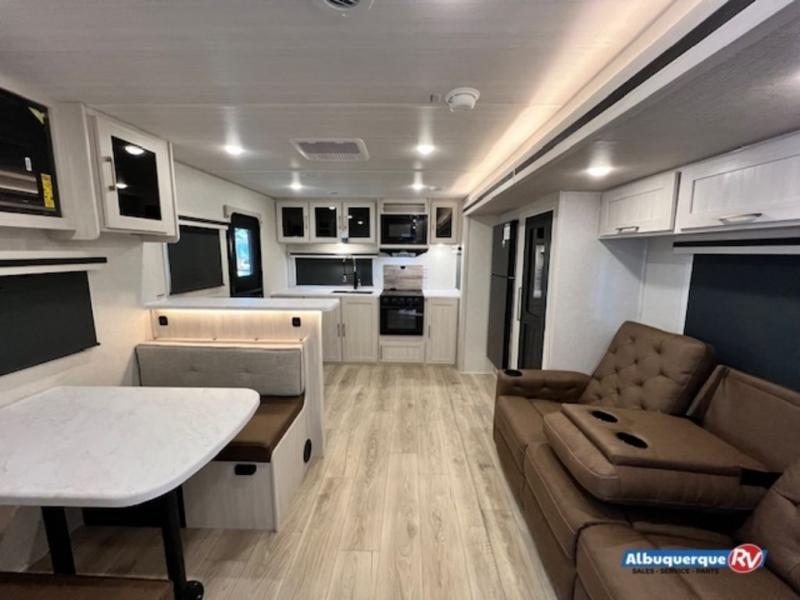You'll love every minute spent in this cozy and convenient travel trailer. Since there are dual entry doors, you can enter in through the front master bedroom with a queen bed or the rear kitchen with ample counter space! A walk-thru bath will be easily accessible for everyone to use, and there is a night light here so you don't wake your crew up in the middle of the night. The tri-fold sofa slide in the main living area will provide a cozy seating space, as well as sleeping space for guests. And you can dine each day at the booth dinette or at the bartop with two seats that overlook the dinette!