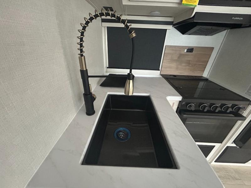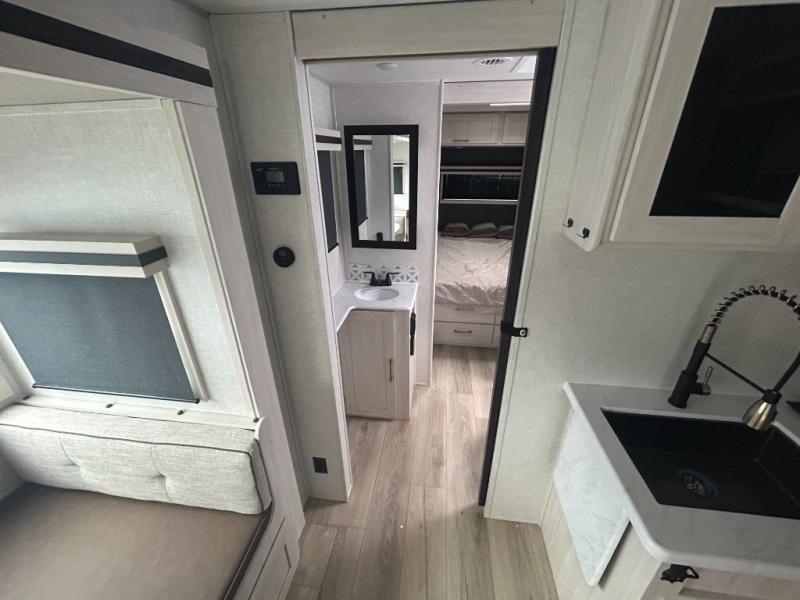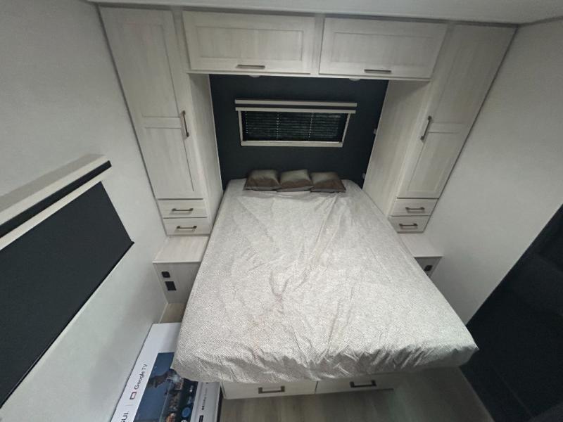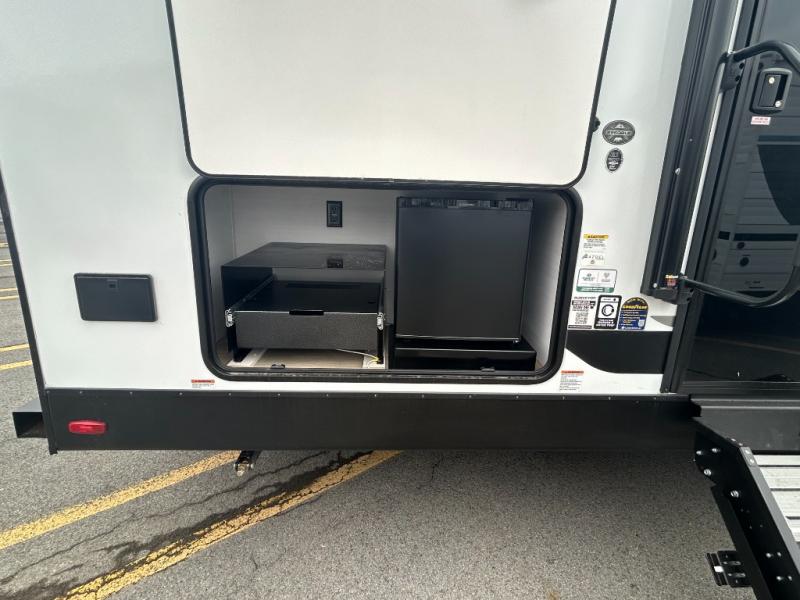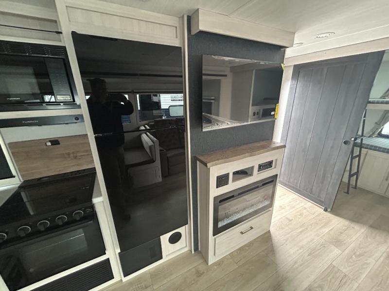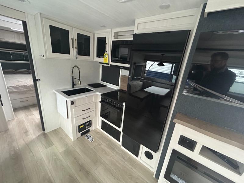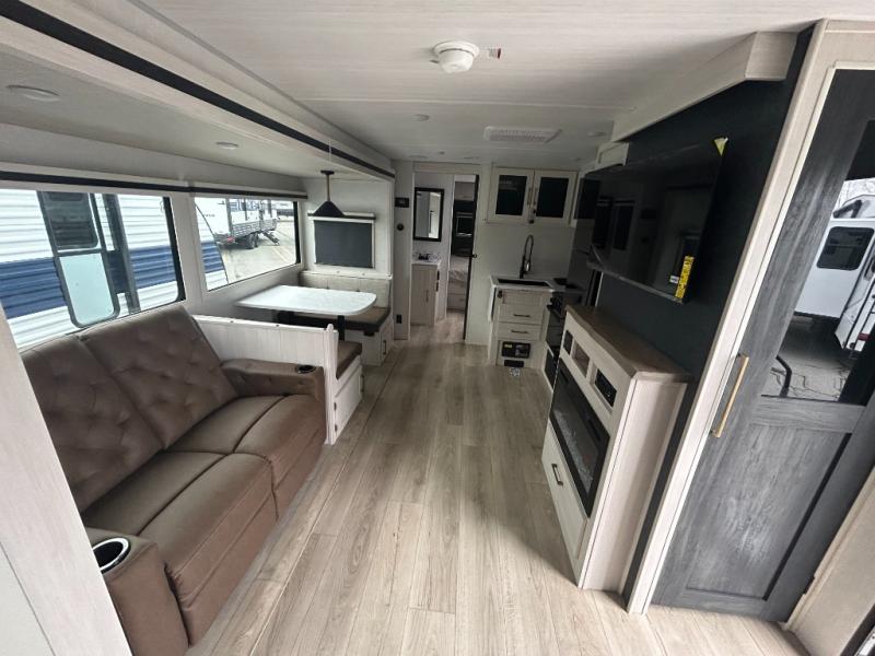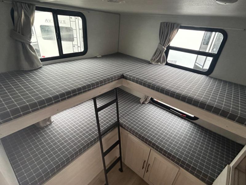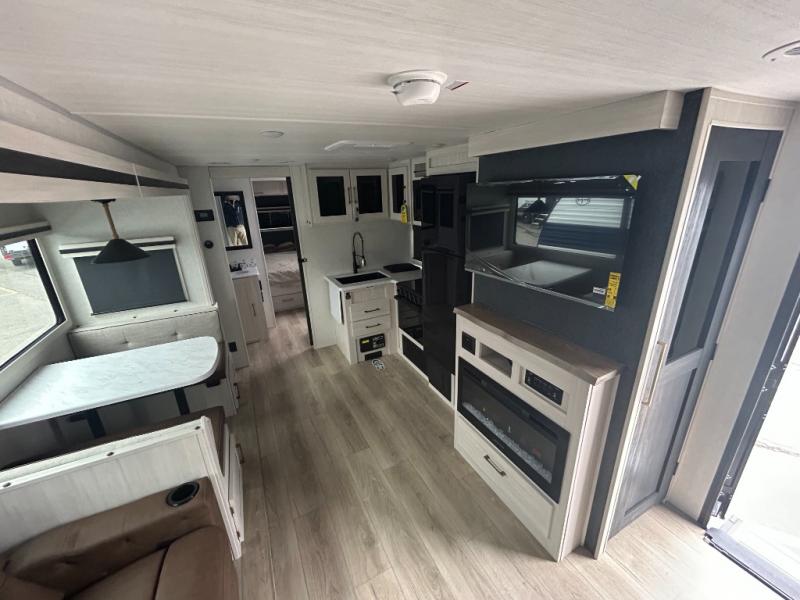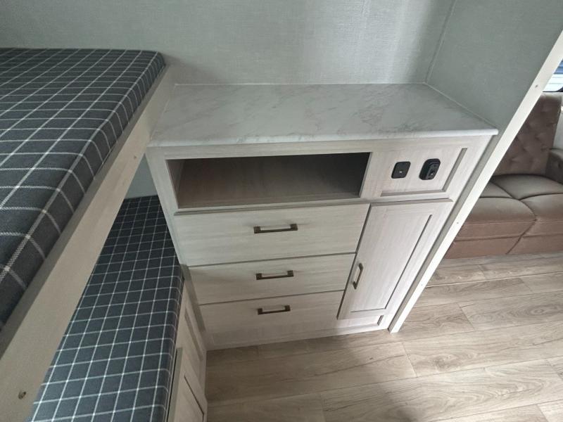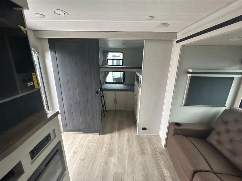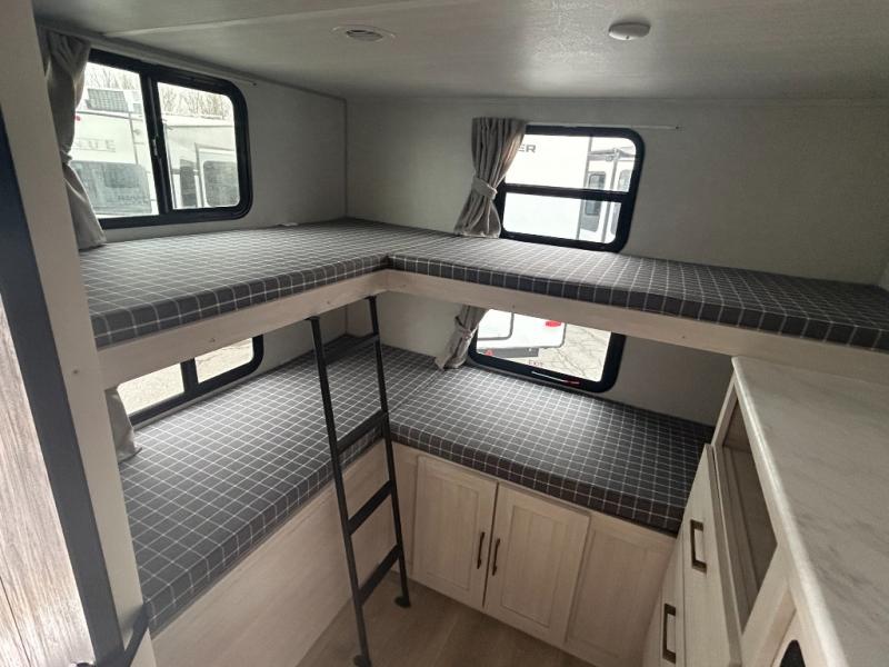 This spacious travel trailer is perfect for those who need plenty of sleeping space! There are four bunks in the bunkhouse for little ones or your friends, and the front master bedroom will feel just like home with its queen-size bed and dual drawers. You'll find a tri-fold sofa and booth dinette within the large slide in the main living area, and there is a walk-in pantry to store food, jackets, or umbrellas. And there is washer and dryer prep in the pantry if you choose to add those appliances. Don't overlook the exterior that includes an outside kitchen, a 21' electric awning, and outside storage!