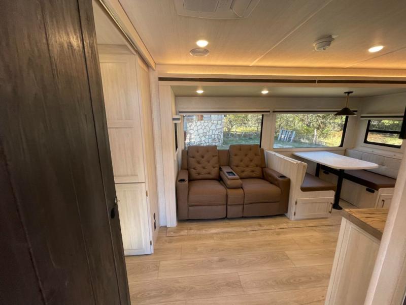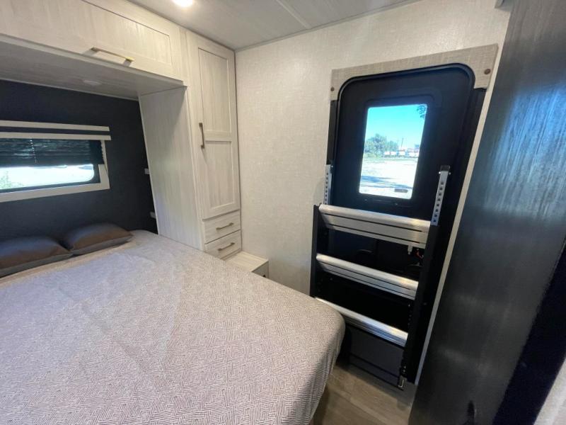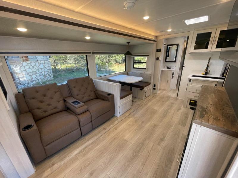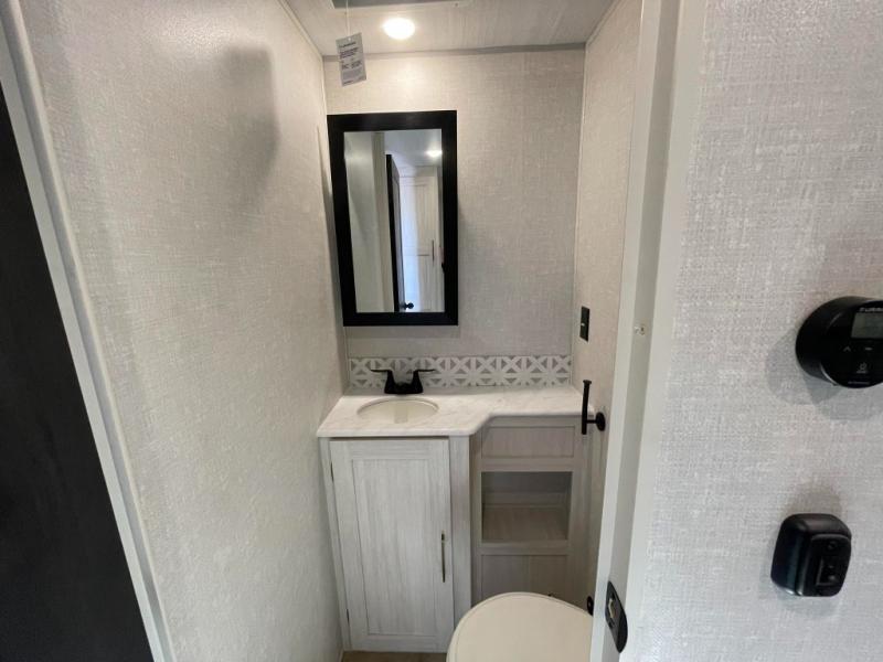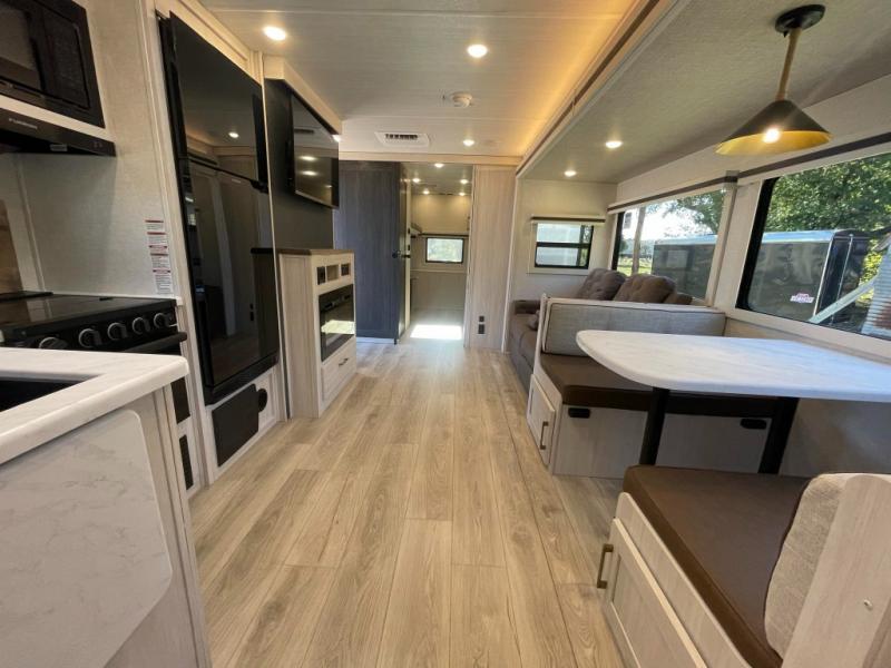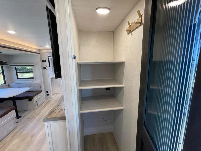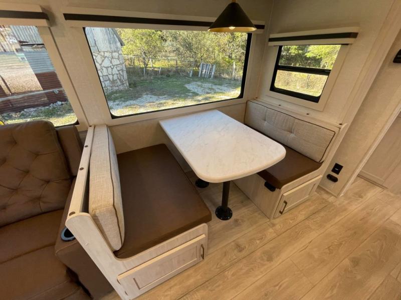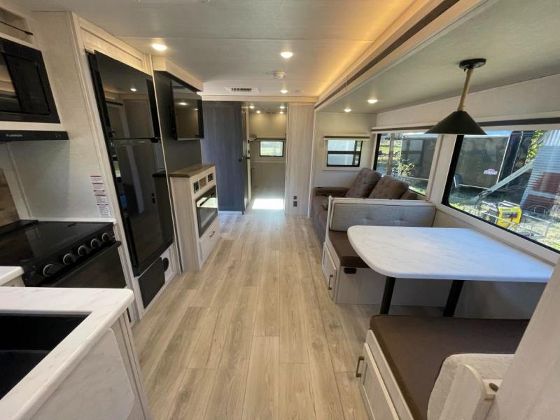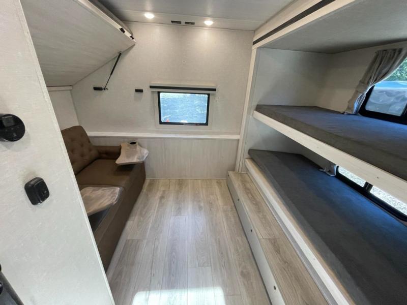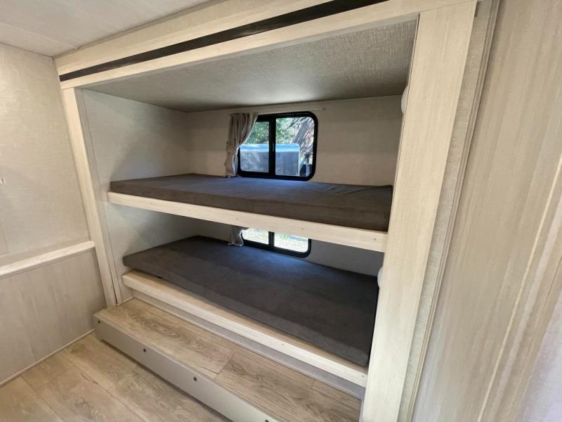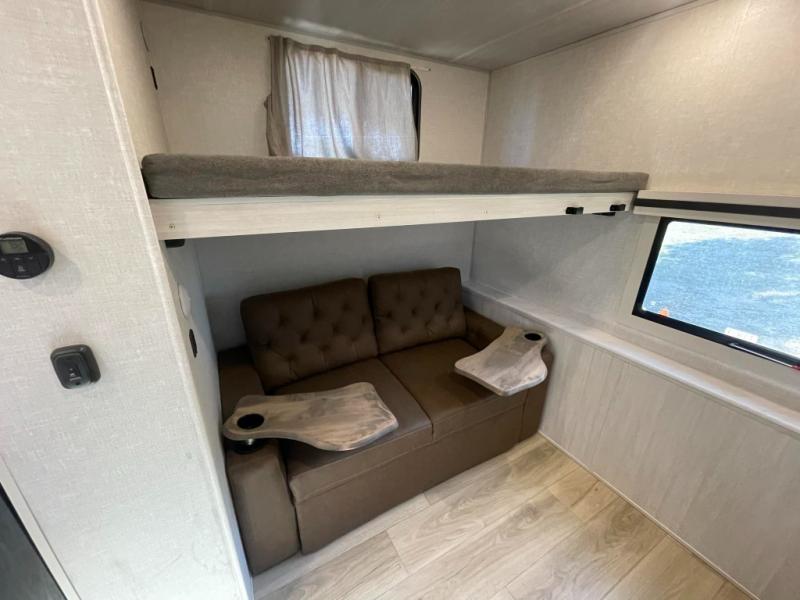 This travel trailer is perfect for larger groups or families since it can sleep up to ten people each night! There is a private bunkhouse with three bunks, a tri-fold sofa, plus storage space and a removable table! The front master bedroom is just as accommodating with its dual bedroom wardrobes, overhead cabinets, and quick access to the walk-through bath. The main living are will be a favorite hangout spot with a tri-fold sofa, a booth dinette, and an HD TV for movies. And a walk-in pantry with washer and dryer prep gives you the option to add these appliances. The chef of your group can cook meals in the fully-equipped kitchen, or head outdoors to cook on the outside kitchen. There is also a 21' electric awning here with LED lights for an inviting outdoor living space.
