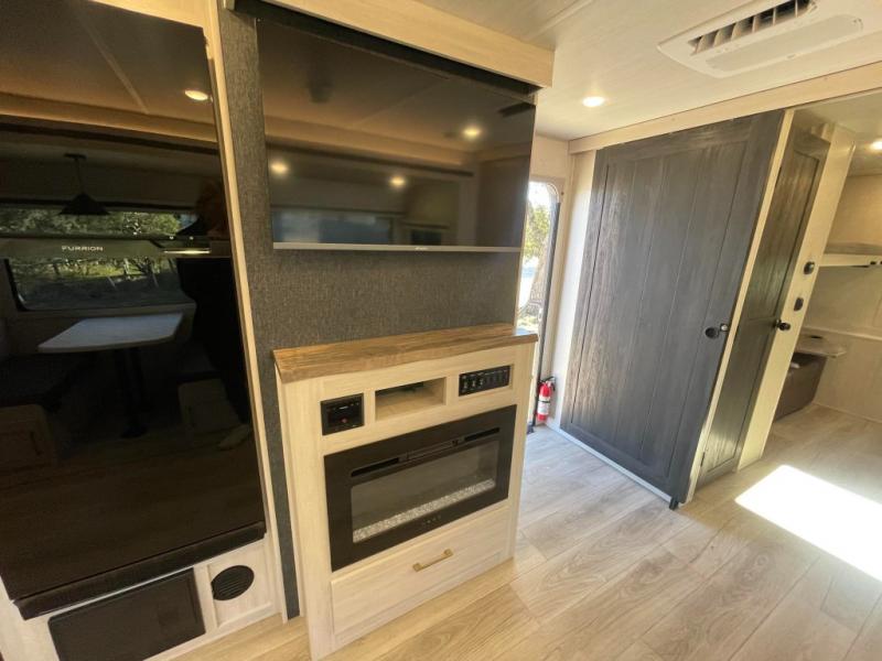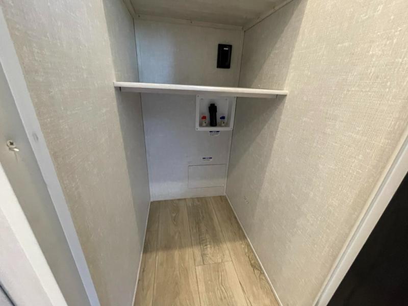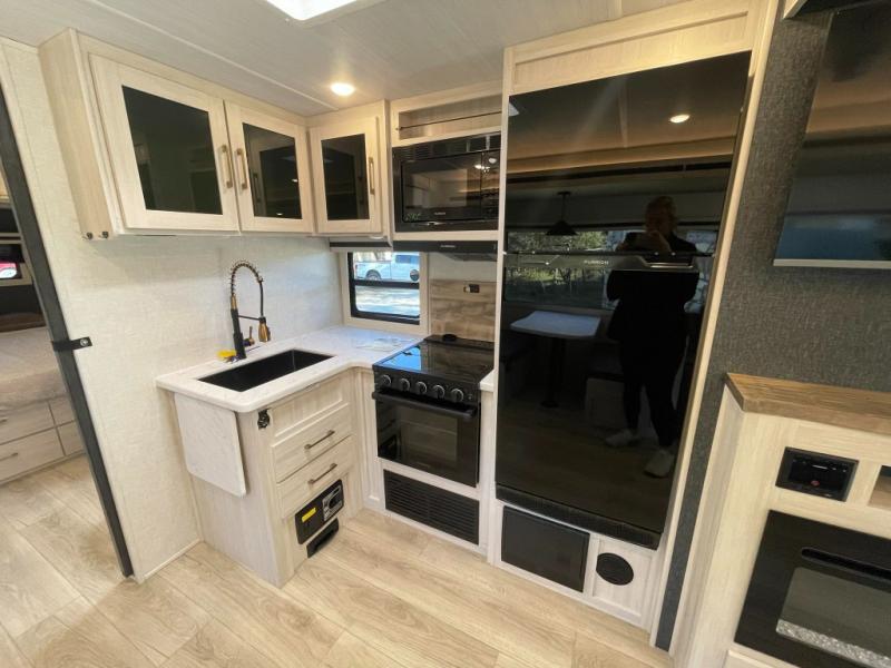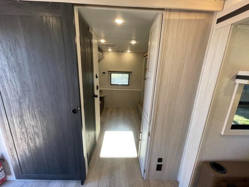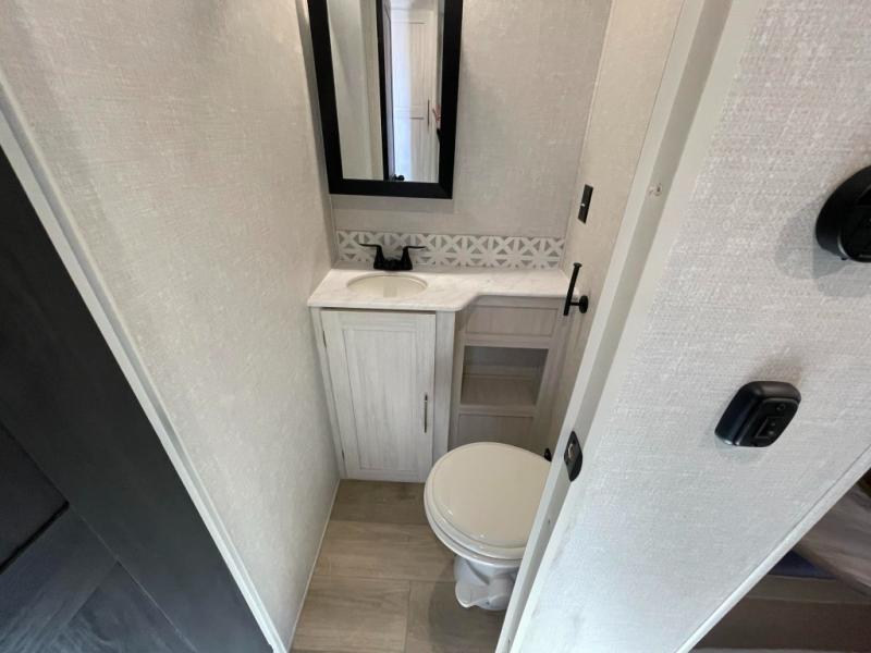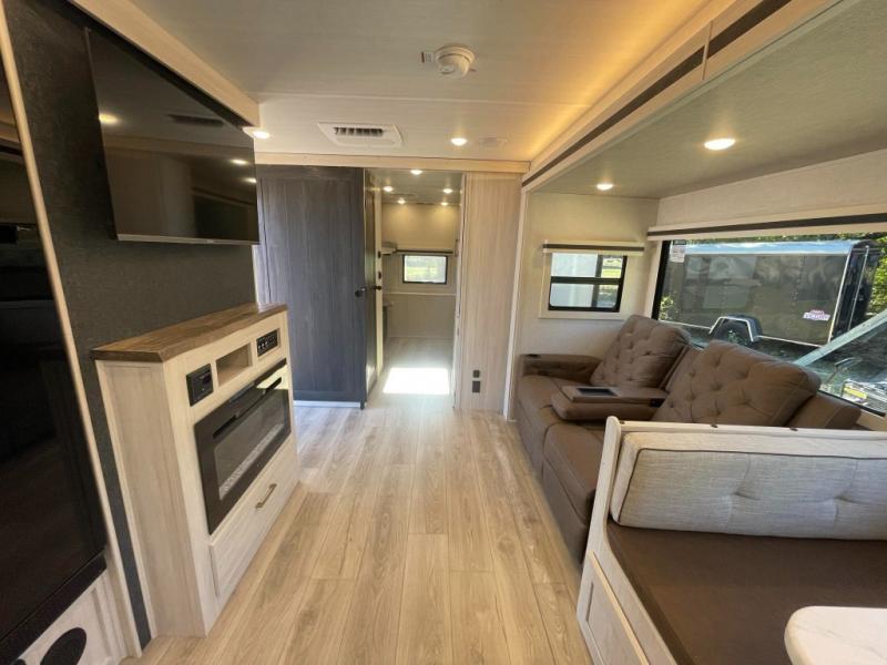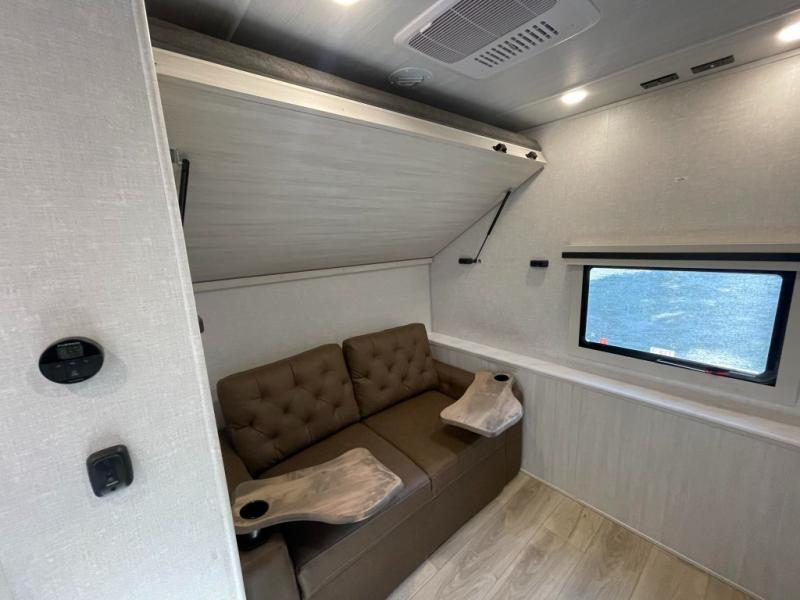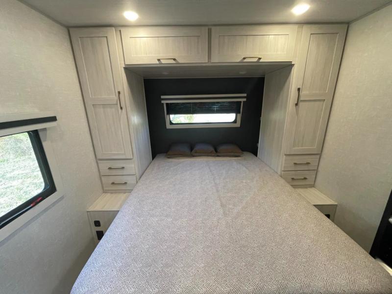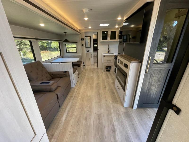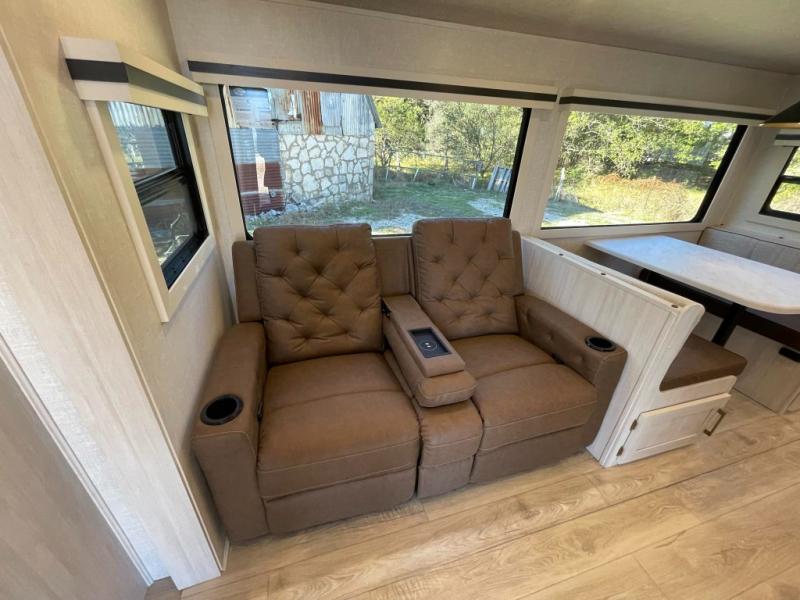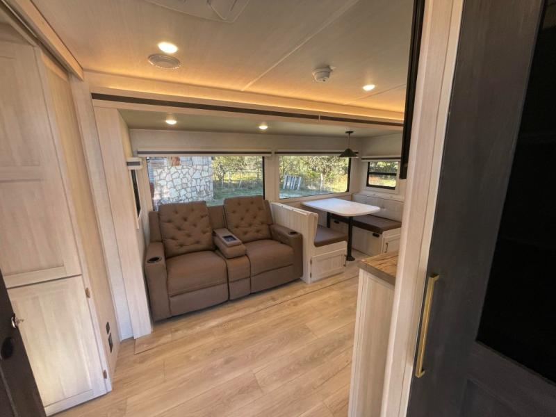 This travel trailer is perfect for larger groups or families since it can sleep up to ten people each night! There is a private bunkhouse with three bunks, a tri-fold sofa, plus storage space and a removable table! The front master bedroom is just as accommodating with its dual bedroom wardrobes, overhead cabinets, and quick access to the walk-through bath. The main living are will be a favorite hangout spot with a tri-fold sofa, a booth dinette, and an HD TV for movies. And a walk-in pantry with washer and dryer prep gives you the option to add these appliances. The chef of your group can cook meals in the fully-equipped kitchen, or head outdoors to cook on the outside kitchen. There is also a 21' electric awning here with LED lights for an inviting outdoor living space.