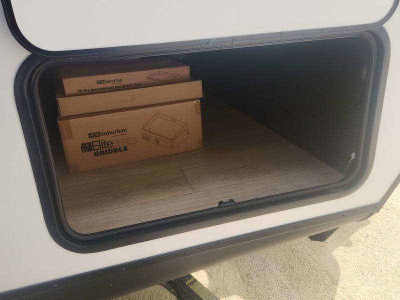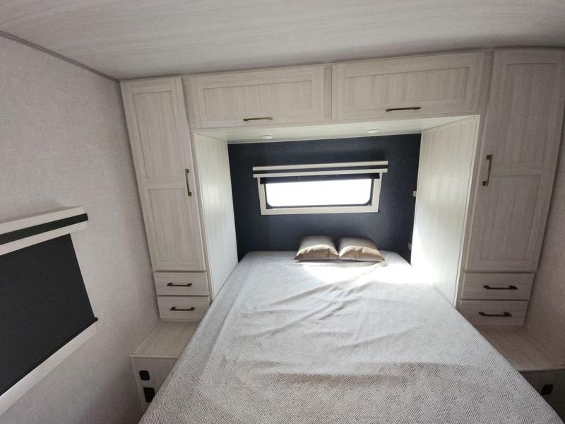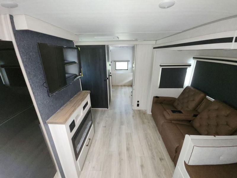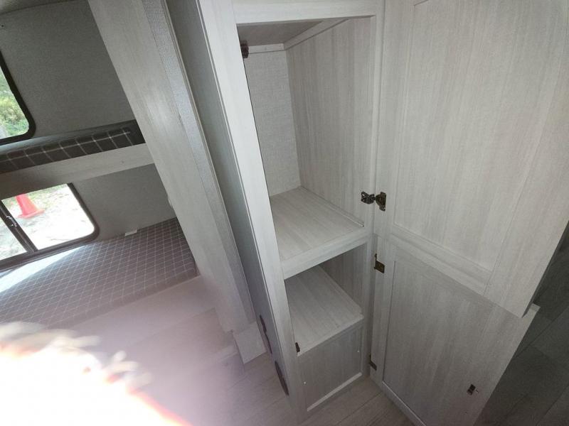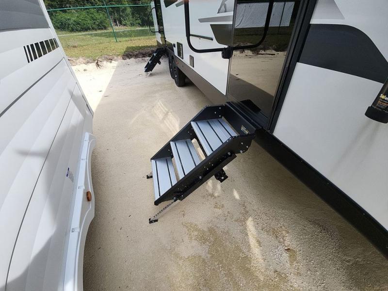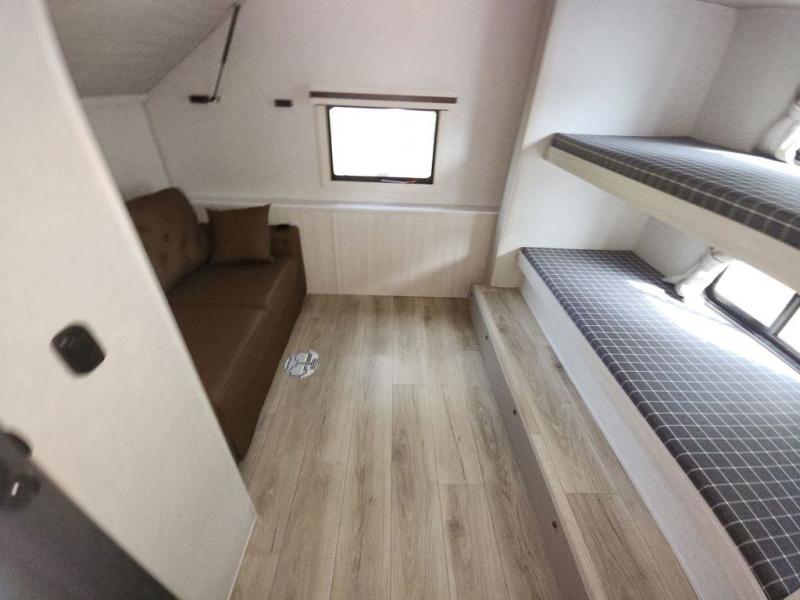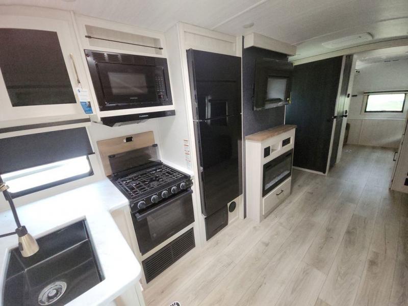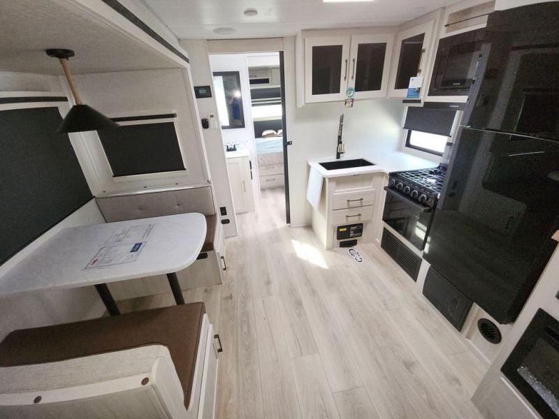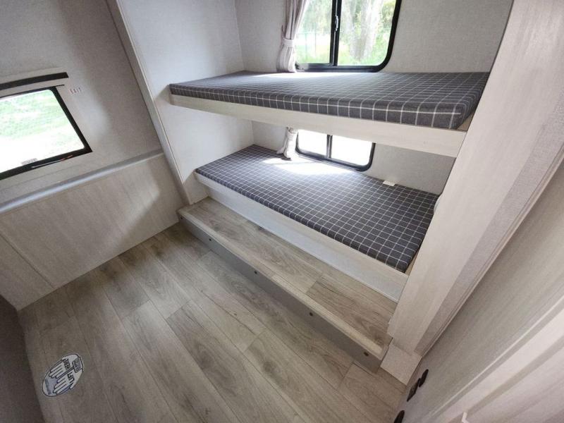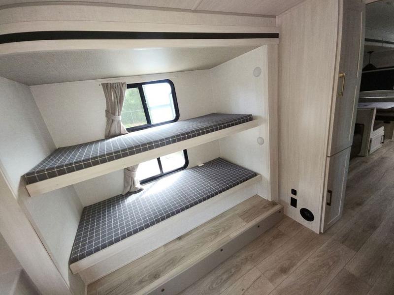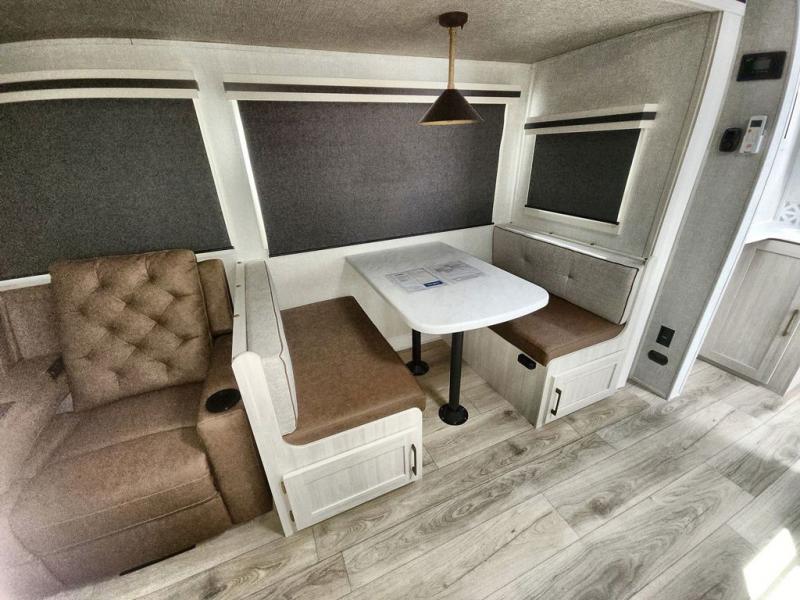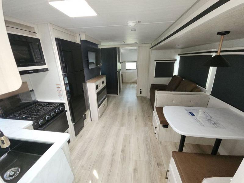 This travel trailer is perfect for larger groups or families since it can sleep up to ten people each night! There is a private bunkhouse with three bunks, a tri-fold sofa, plus storage space and a removable table! The front master bedroom is just as accommodating with its dual bedroom wardrobes, overhead cabinets, and quick access to the walk-through bath. The main living are will be a favorite hangout spot with a tri-fold sofa, a booth dinette, and an HD TV for movies. And a walk-in pantry with washer and dryer prep gives you the option to add these appliances. The chef of your group can cook meals in the fully-equipped kitchen, or head outdoors to cook on the outside kitchen. There is also a 21' electric awning here with LED lights for an inviting outdoor living space.