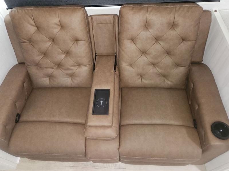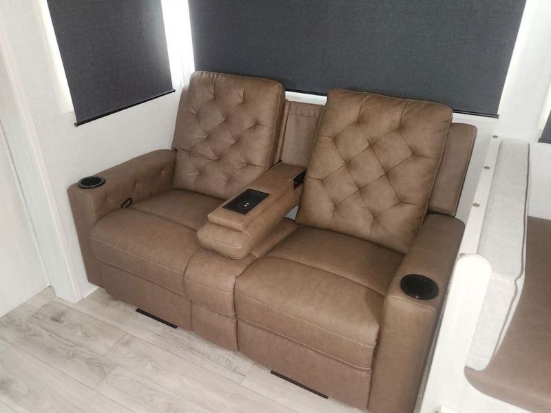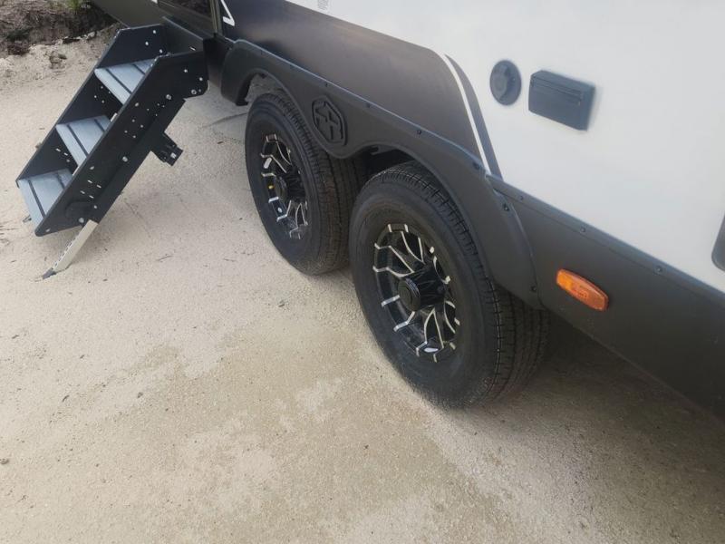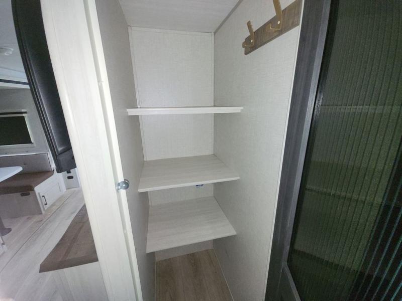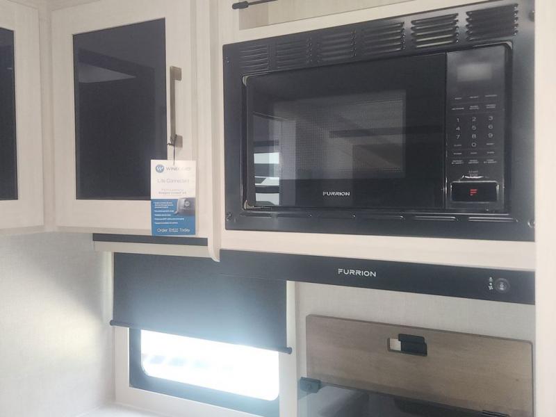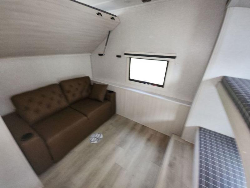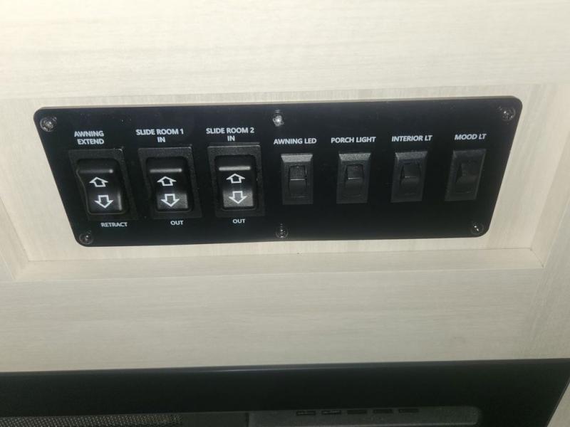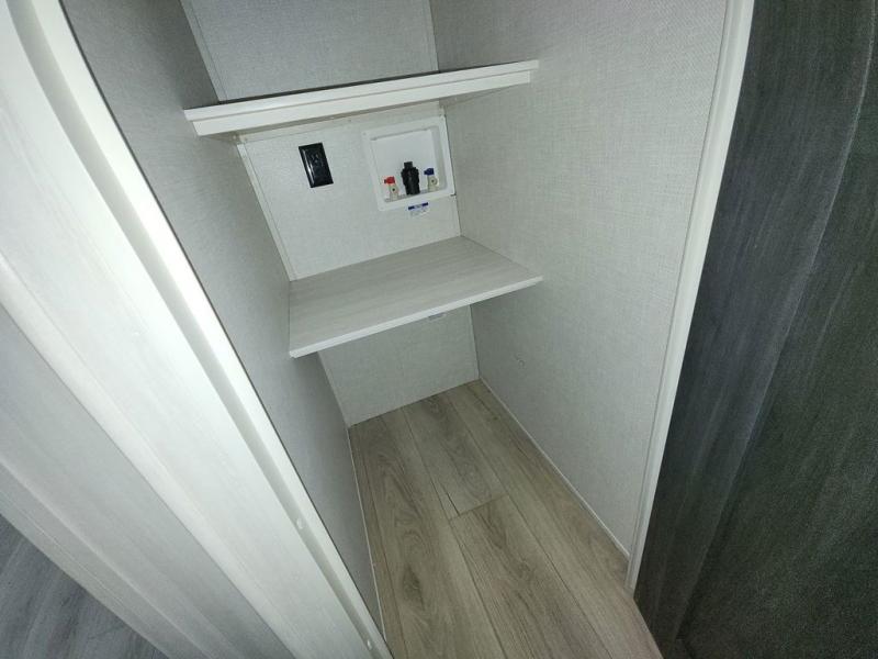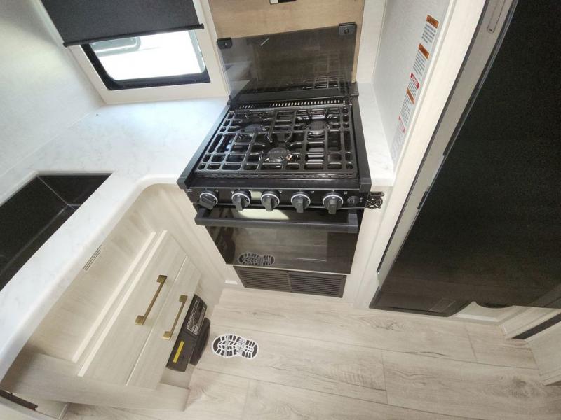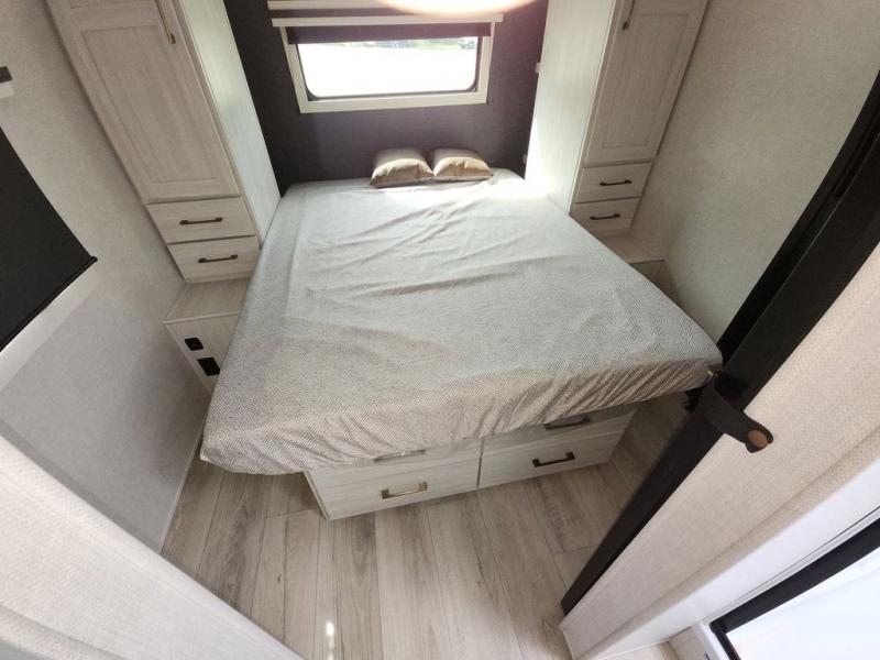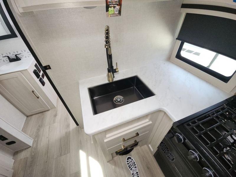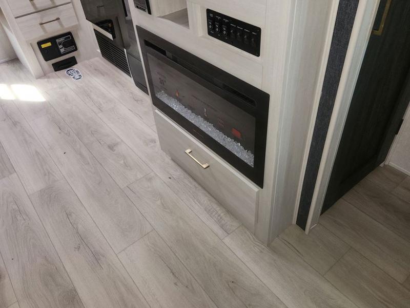 This travel trailer is perfect for larger groups or families since it can sleep up to ten people each night! There is a private bunkhouse with three bunks, a tri-fold sofa, plus storage space and a removable table! The front master bedroom is just as accommodating with its dual bedroom wardrobes, overhead cabinets, and quick access to the walk-through bath. The main living are will be a favorite hangout spot with a tri-fold sofa, a booth dinette, and an HD TV for movies. And a walk-in pantry with washer and dryer prep gives you the option to add these appliances. The chef of your group can cook meals in the fully-equipped kitchen, or head outdoors to cook on the outside kitchen. There is also a 21' electric awning here with LED lights for an inviting outdoor living space.