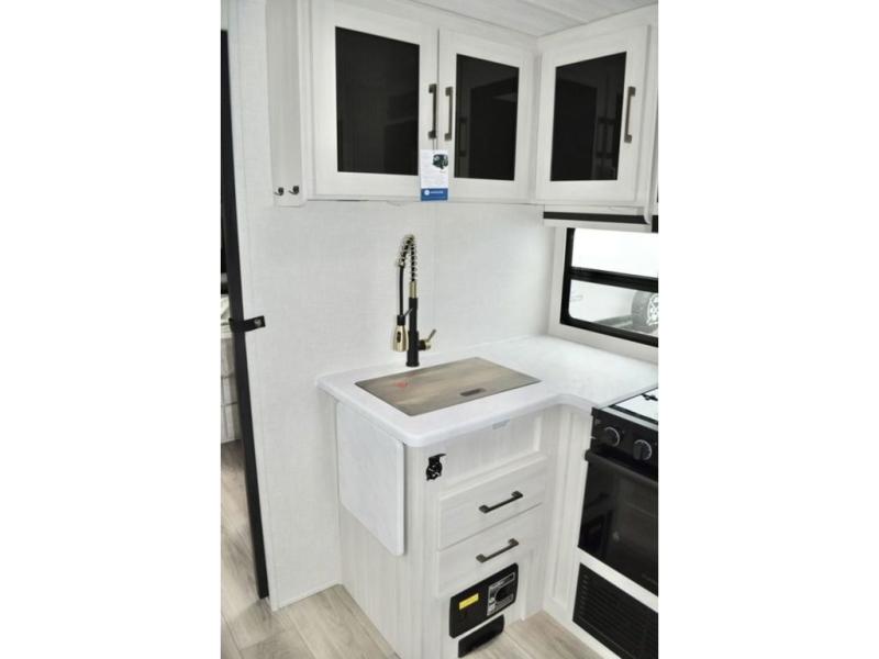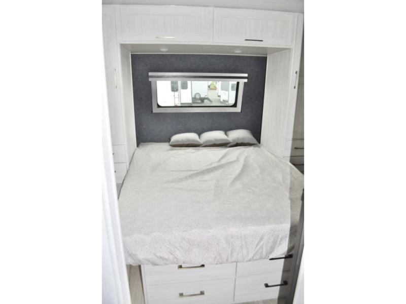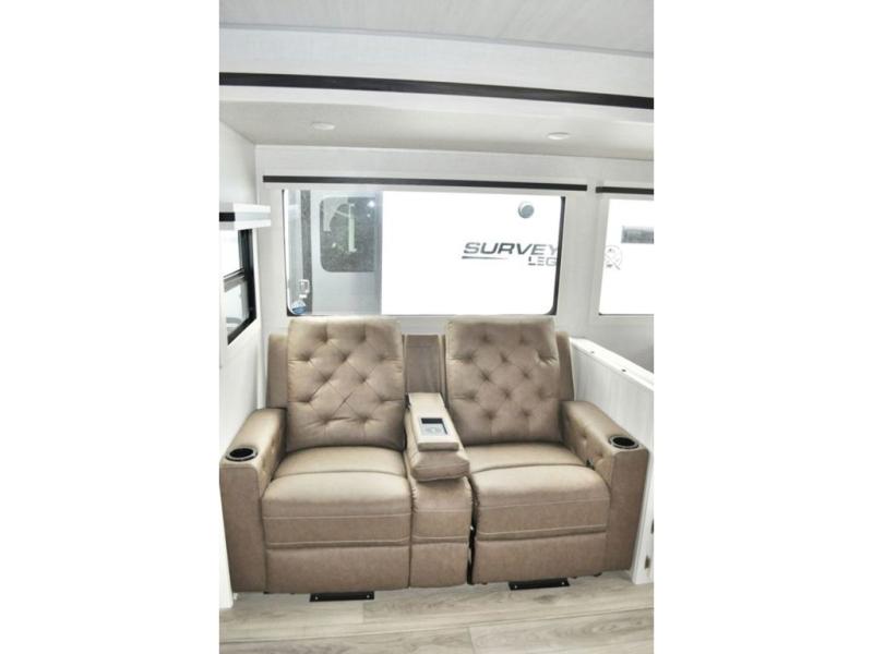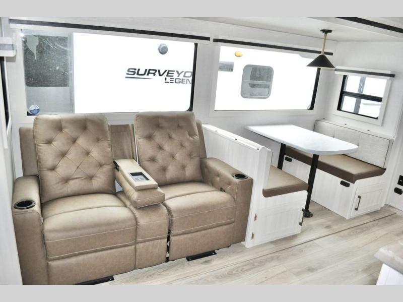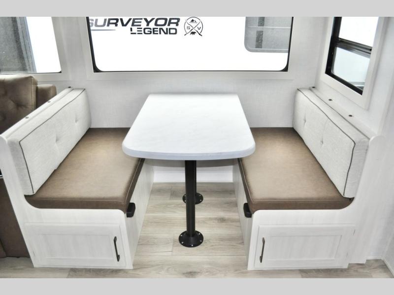 With any Surveyor Legend travel trailer by Forest River you will enjoy quality craftsmanship, convenient amenities, and at-home comforts. The Azdel composite walls provide a longer-lasting trailer, and the power tongue jack with a hitch light will get you back on the road in no-time. There are also Goodyear tires and a tire pressure monitoring system for hassle-free towing. Each model includes the Surveyor Legend Package that comes standard with oversized dinette storage access doors, front slam latch baggage doors, plus an automotive style tinted front windshield. You'll appreciate camping with a tankless water heater for endless hot showers, a 2" accessory hitch to bring bikes along, plus carpet-free interiors and a central vacuum system for easy clean up.