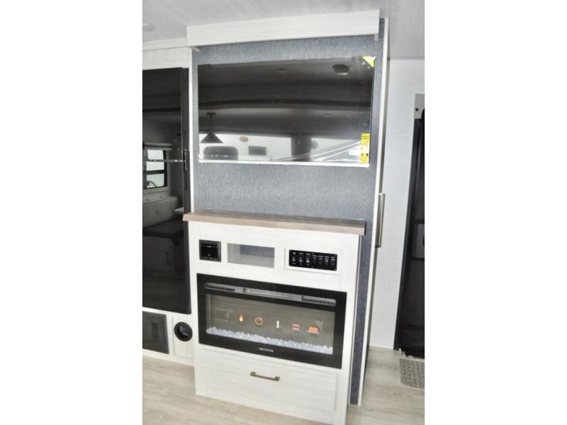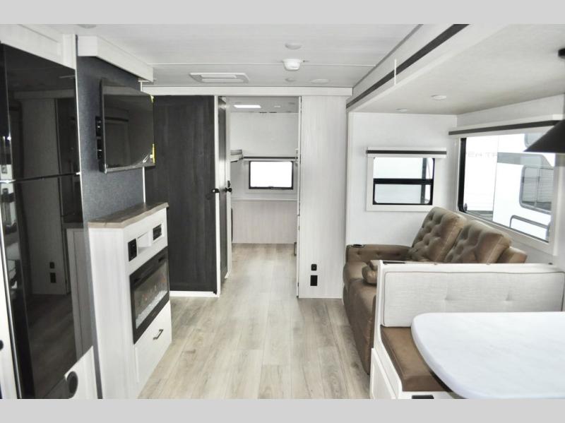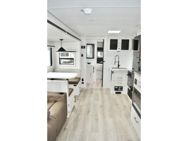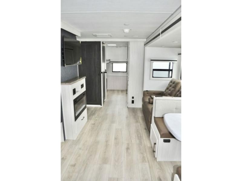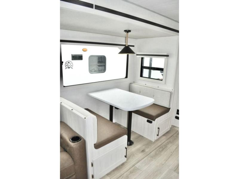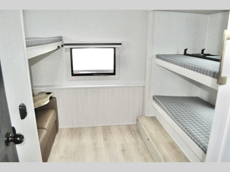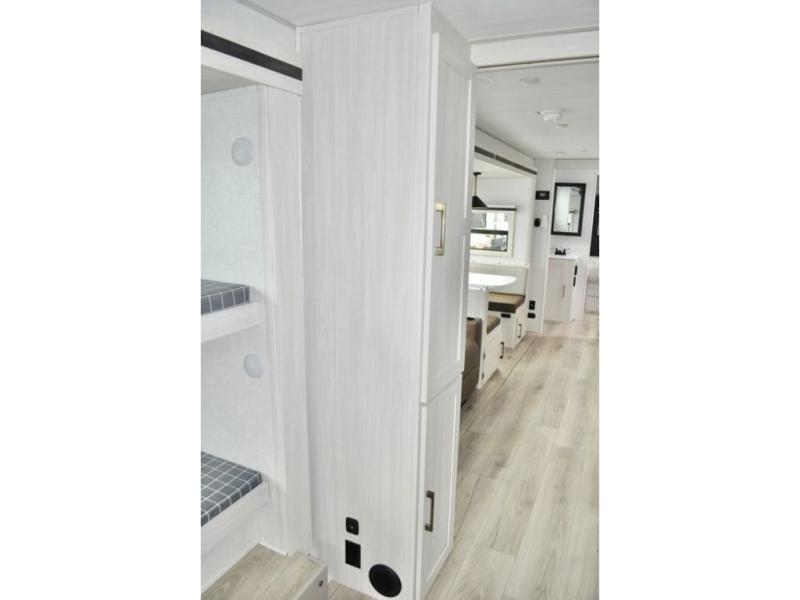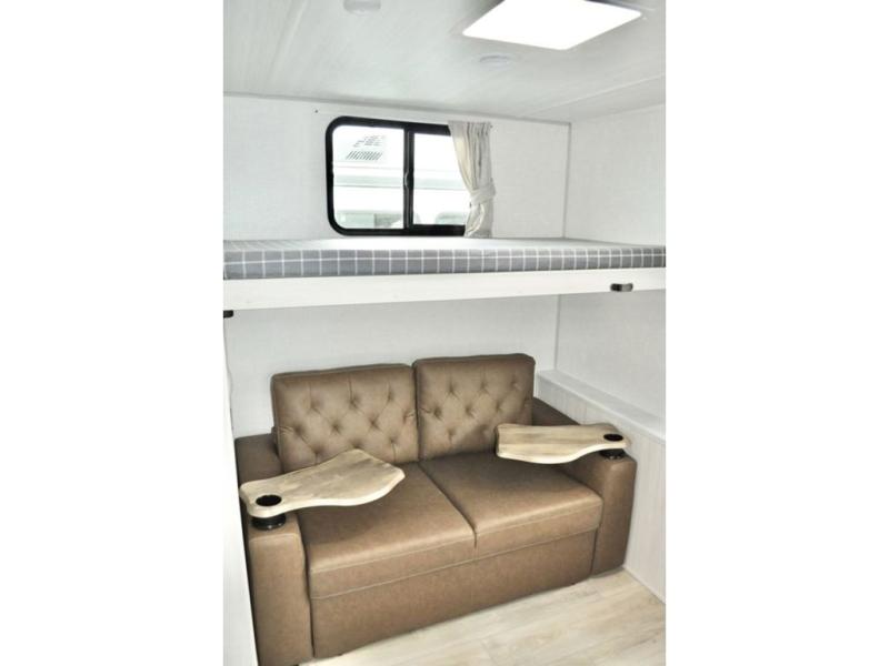 This travel trailer is perfect for larger groups or families since it can sleep up to ten people each night! There is a private bunkhouse with three bunks, a tri-fold sofa, plus storage space and a removable table! The front master bedroom is just as accommodating with its dual bedroom wardrobes, overhead cabinets, and quick access to the walk-through bath. The main living are will be a favorite hangout spot with a tri-fold sofa, a booth dinette, and an HD TV for movies. And a walk-in pantry with washer and dryer prep gives you the option to add these appliances. The chef of your group can cook meals in the fully-equipped kitchen, or head outdoors to cook on the outside kitchen. There is also a 21' electric awning here with LED lights for an inviting outdoor living space.