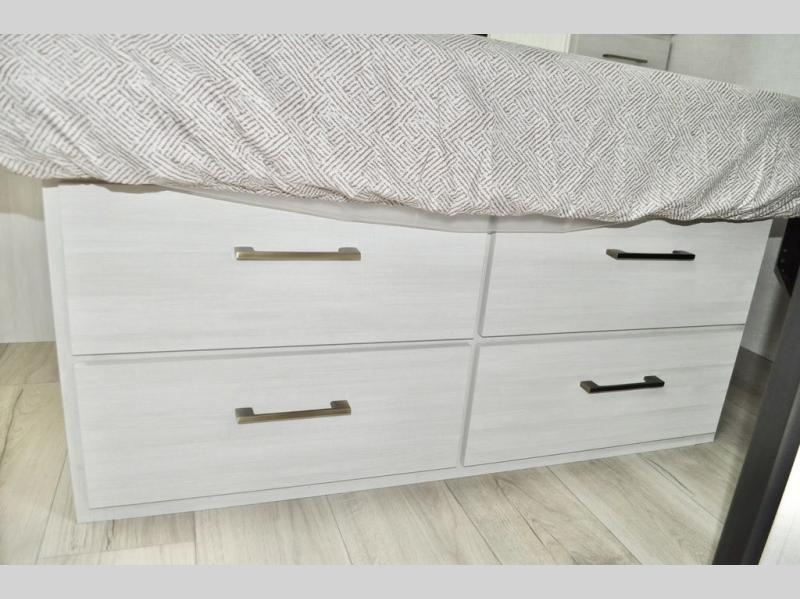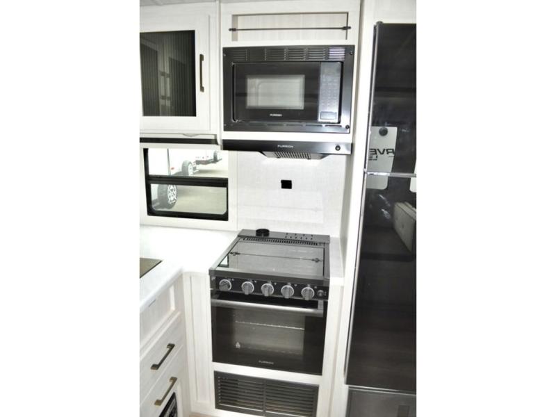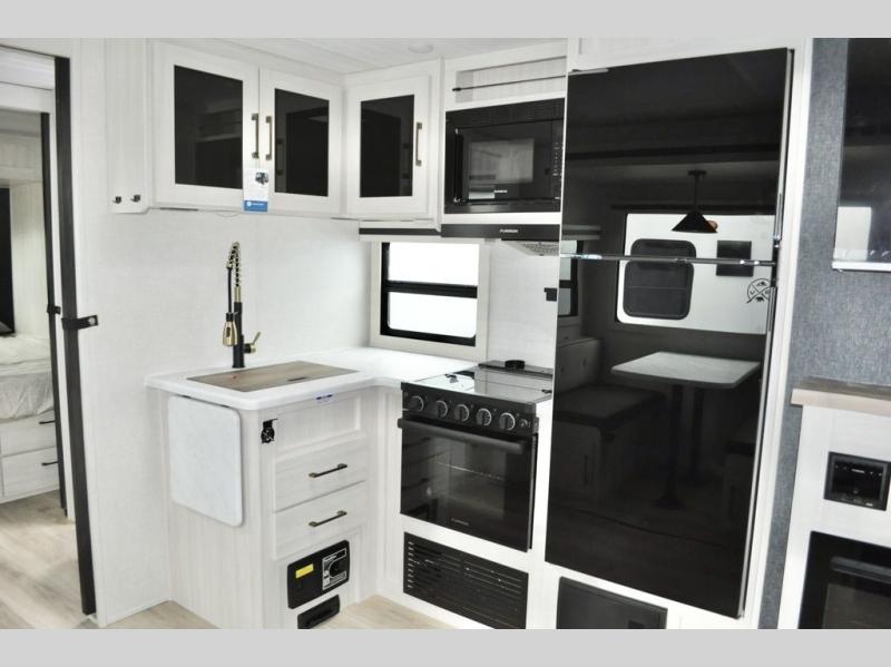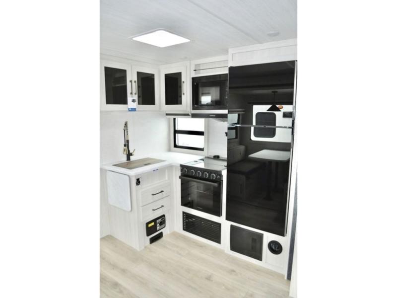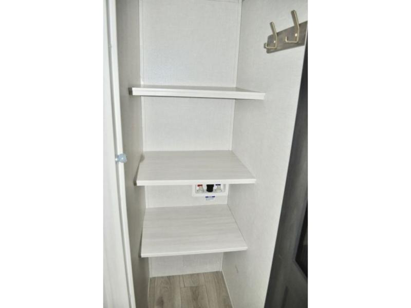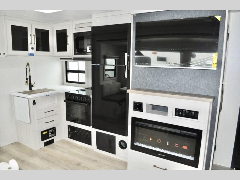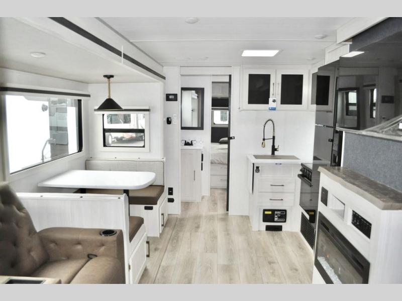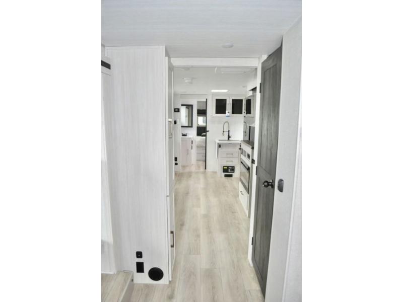 This travel trailer is perfect for larger groups or families since it can sleep up to ten people each night! There is a private bunkhouse with three bunks, a tri-fold sofa, plus storage space and a removable table! The front master bedroom is just as accommodating with its dual bedroom wardrobes, overhead cabinets, and quick access to the walk-through bath. The main living are will be a favorite hangout spot with a tri-fold sofa, a booth dinette, and an HD TV for movies. And a walk-in pantry with washer and dryer prep gives you the option to add these appliances. The chef of your group can cook meals in the fully-equipped kitchen, or head outdoors to cook on the outside kitchen. There is also a 21' electric awning here with LED lights for an inviting outdoor living space.
