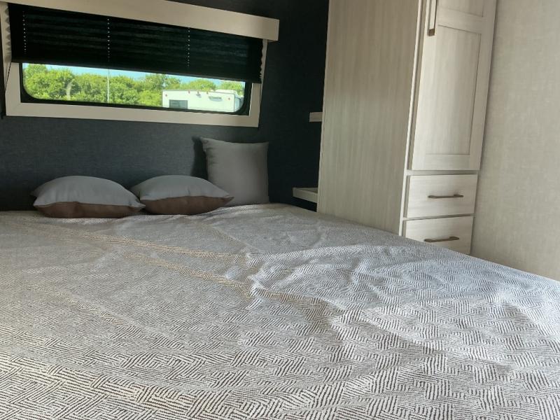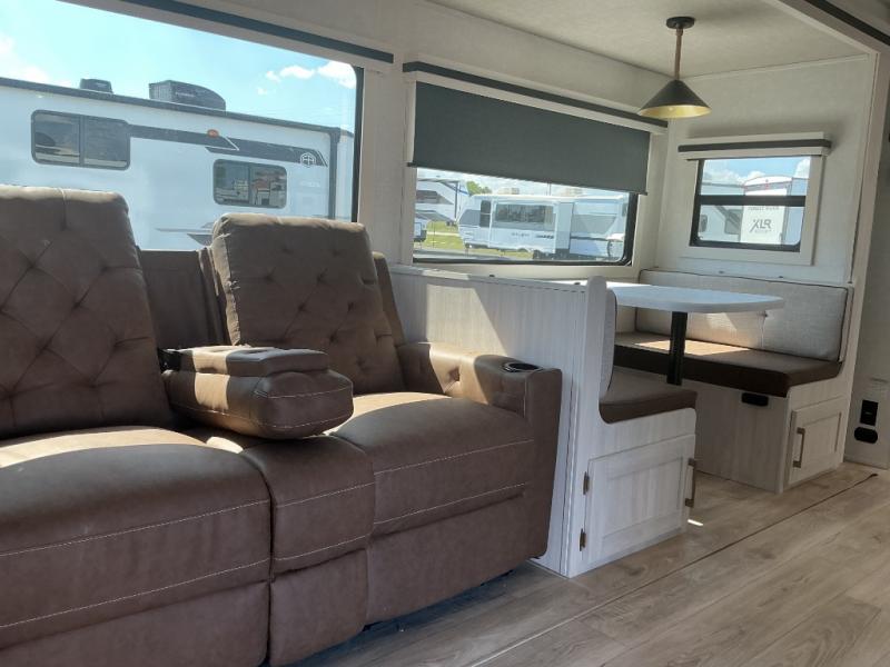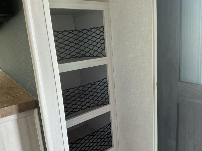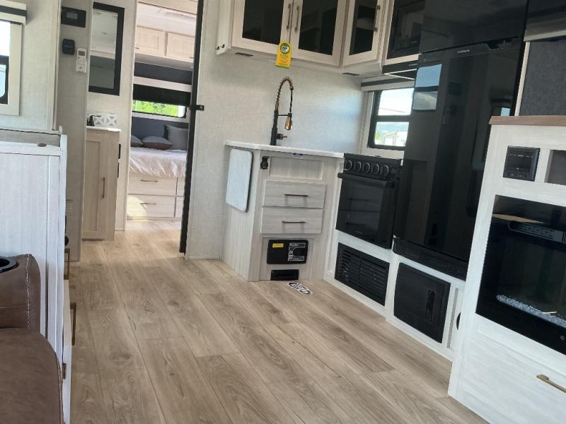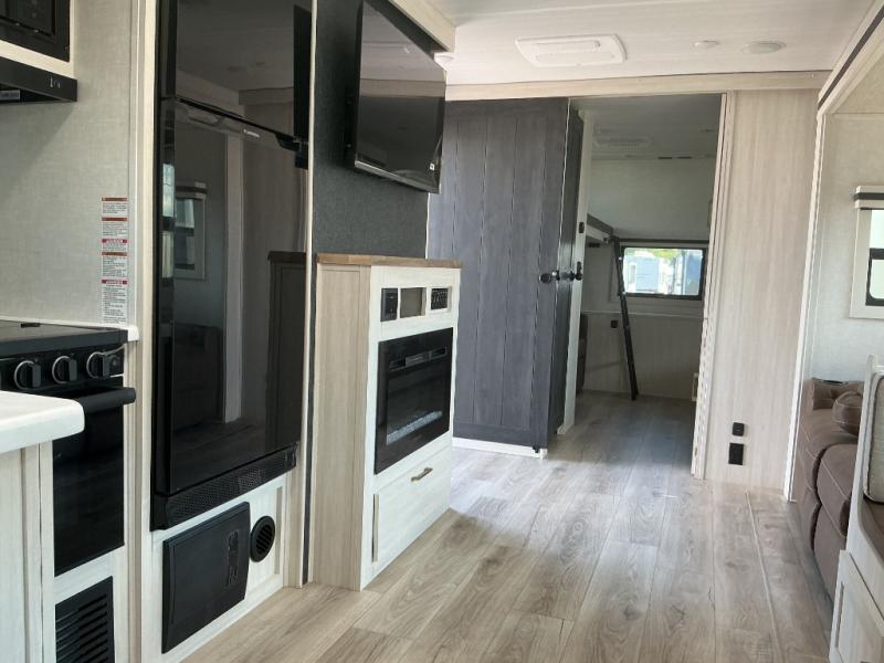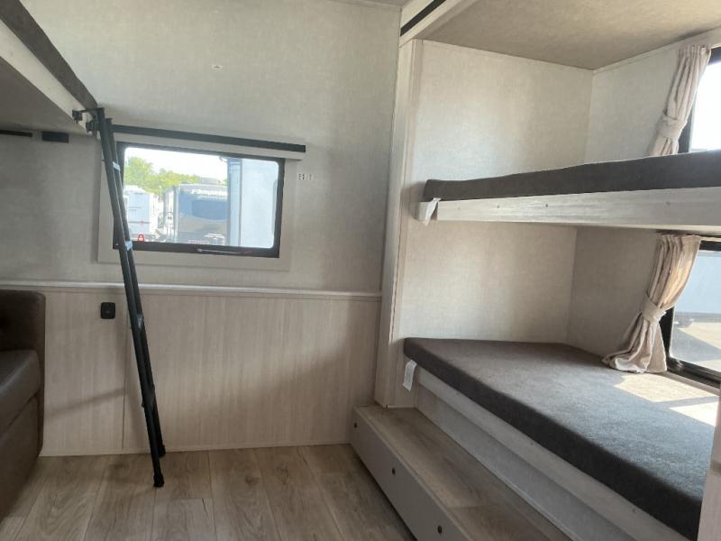 This travel trailer is perfect for larger groups or families since it can sleep up to ten people each night! There is a private bunkhouse with three bunks, a tri-fold sofa, plus storage space and a removable table! The front master bedroom is just as accommodating with its dual bedroom wardrobes, overhead cabinets, and quick access to the walk-through bath. The main living are will be a favorite hangout spot with a tri-fold sofa, a booth dinette, and an HD TV for movies. And a walk-in pantry with washer and dryer prep gives you the option to add these appliances. The chef of your group can cook meals in the fully-equipped kitchen, or head outdoors to cook on the outside kitchen. There is also a 21' electric awning here with LED lights for an inviting outdoor living space.