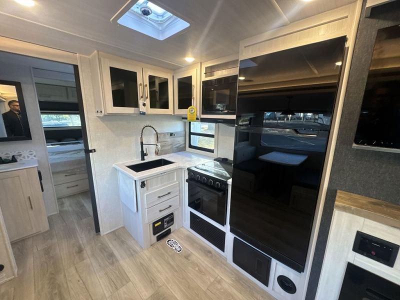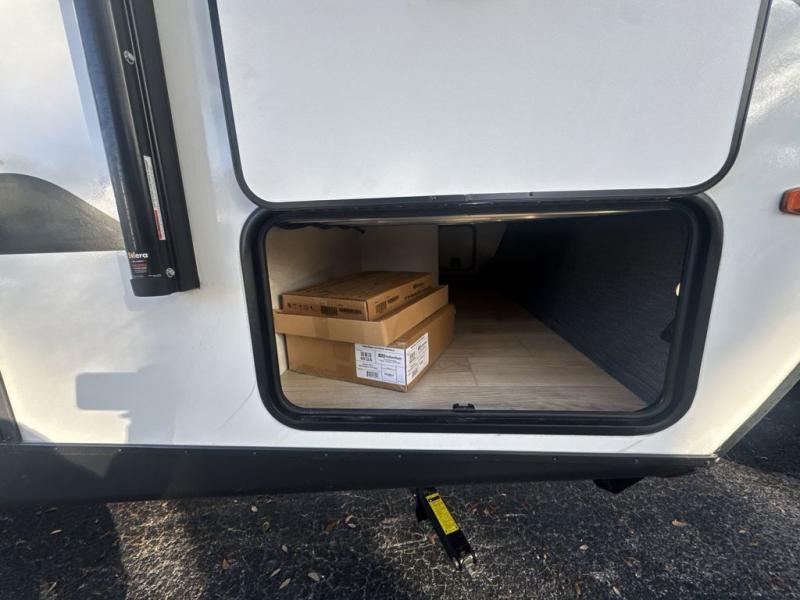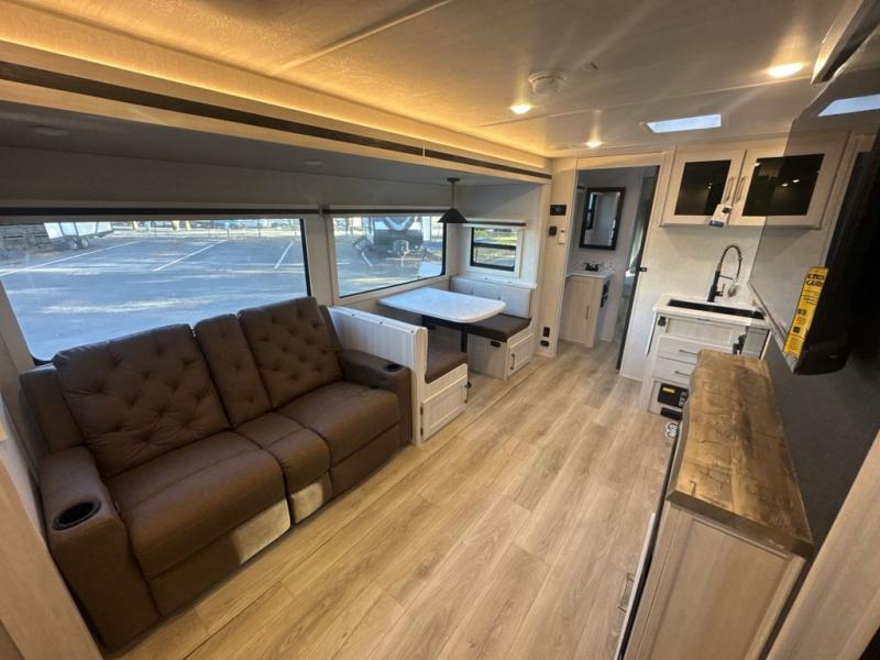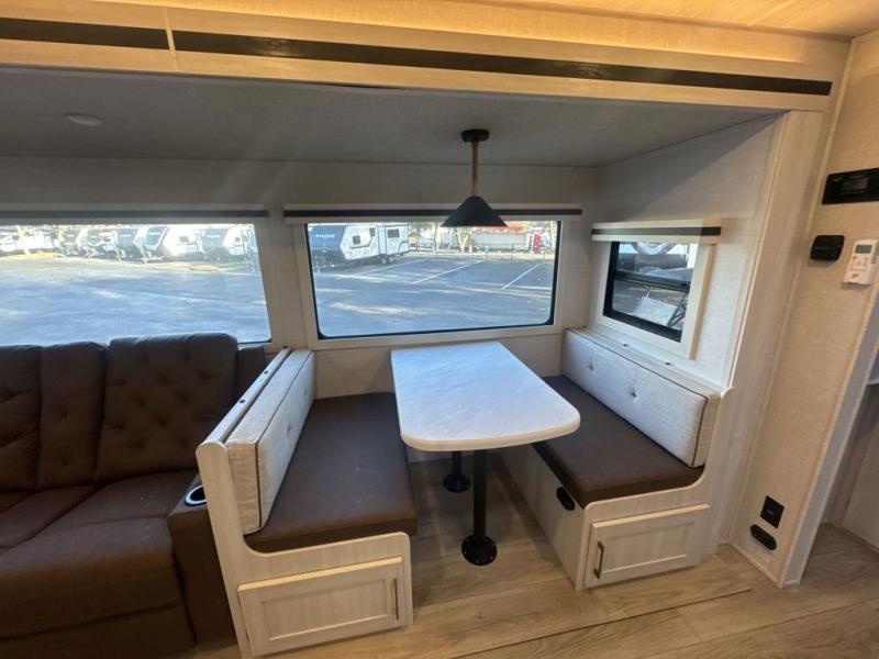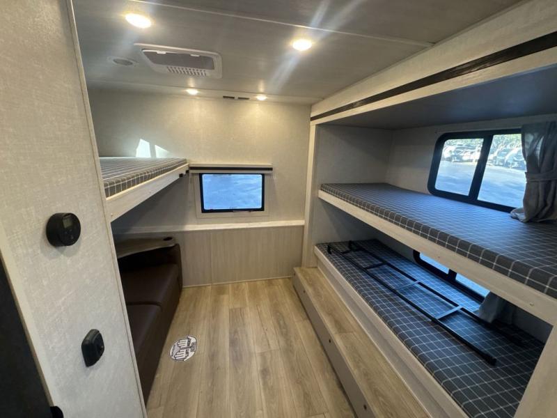 This travel trailer is perfect for larger groups or families since it can sleep up to ten people each night! There is a private bunkhouse with three bunks, a tri-fold sofa, plus storage space and a removable table! The front master bedroom is just as accommodating with its dual bedroom wardrobes, overhead cabinets, and quick access to the walk-through bath. The main living are will be a favorite hangout spot with a tri-fold sofa, a booth dinette, and an HD TV for movies. And a walk-in pantry with washer and dryer prep gives you the option to add these appliances. The chef of your group can cook meals in the fully-equipped kitchen, or head outdoors to cook on the outside kitchen. There is also a 21' electric awning here with LED lights for an inviting outdoor living space.