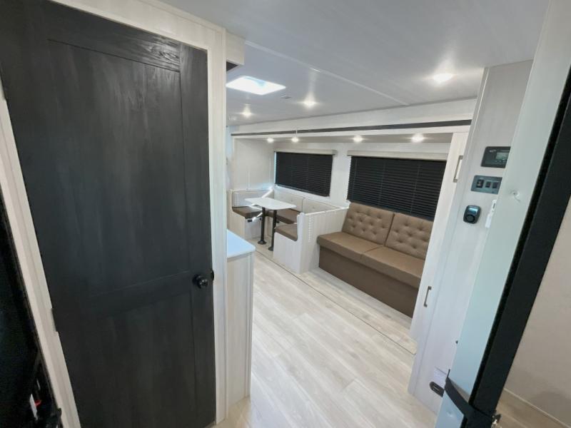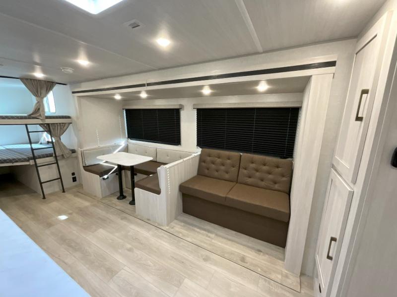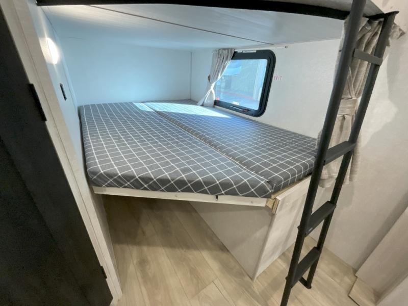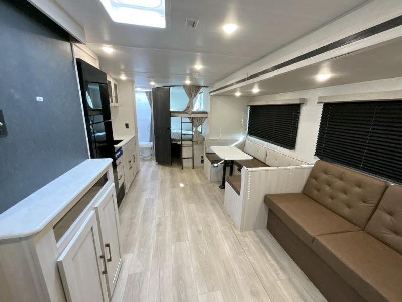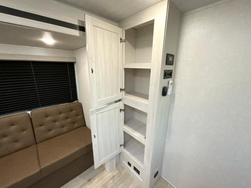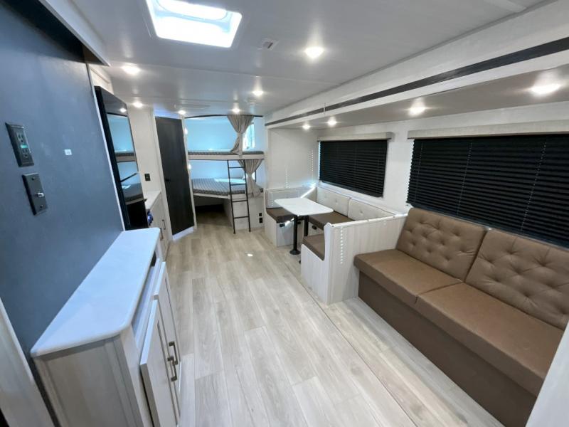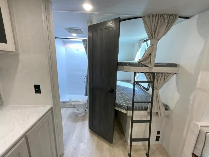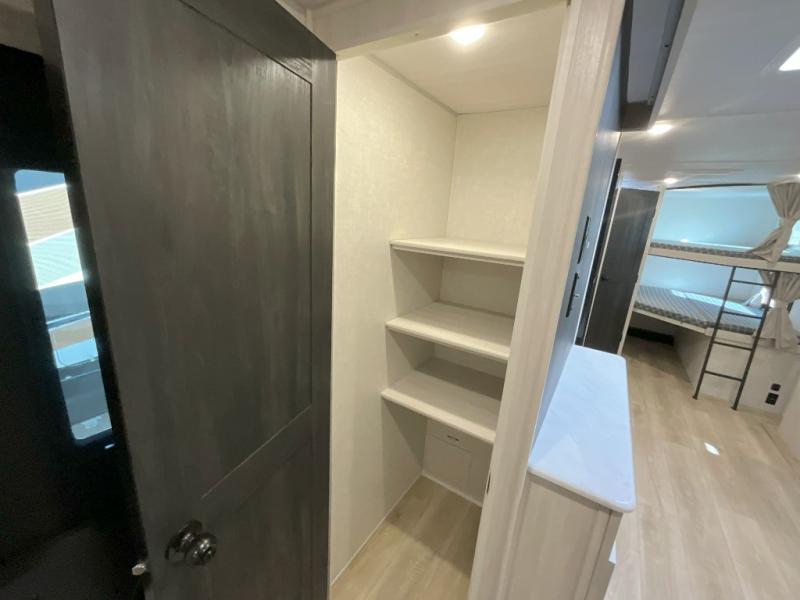 Head to your favorite camping spot with your favorite people in this spacious, dual entry travel trailer! The large slide out houses the U-shaped dinette and sofa where you can relax in the evenings and even let guests sleep over who haven't claimed the double-size bunks. A full bath with its own exterior entry door is convenient for all, and the full kitchen lets you whip up your best meals in the microwave with an air fryer. There is also a walk-in pantry with washer and dryer prep, which gives you the option to add those appliances. When it's time to call it a night, the front private bedroom with a queen bed will provide you with your own space to retreat to, and there are dual bedside wardrobes to keep your clothes organized.