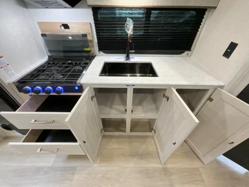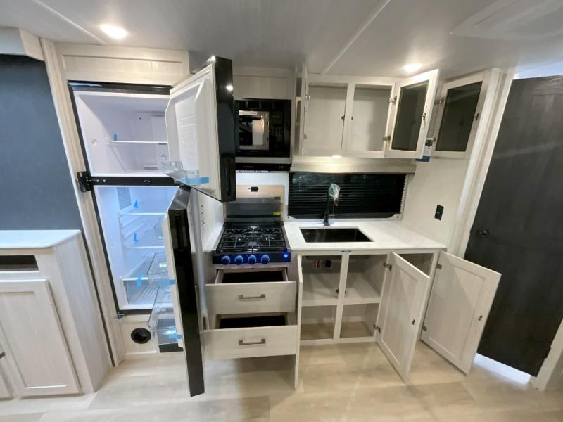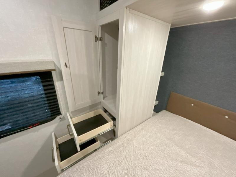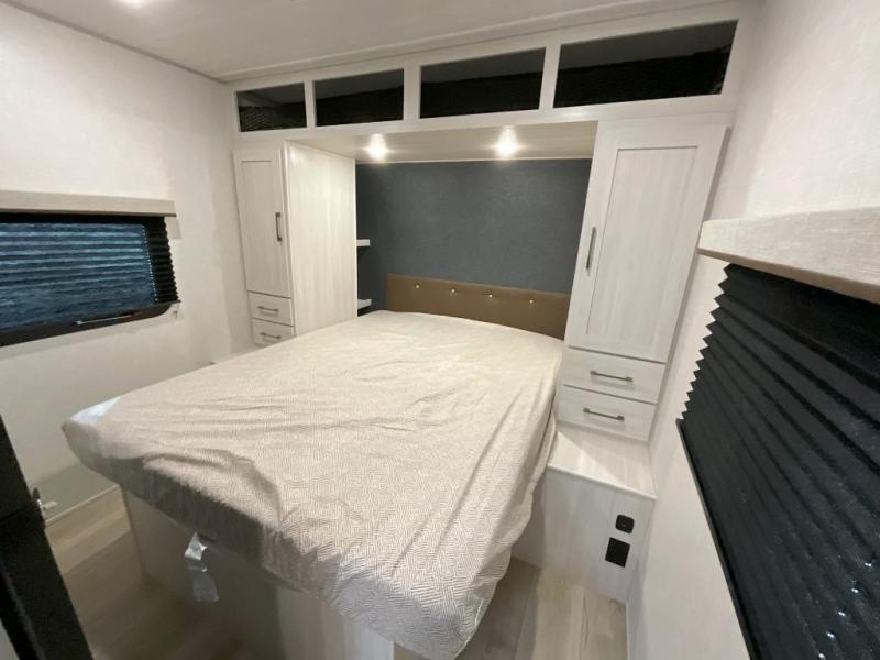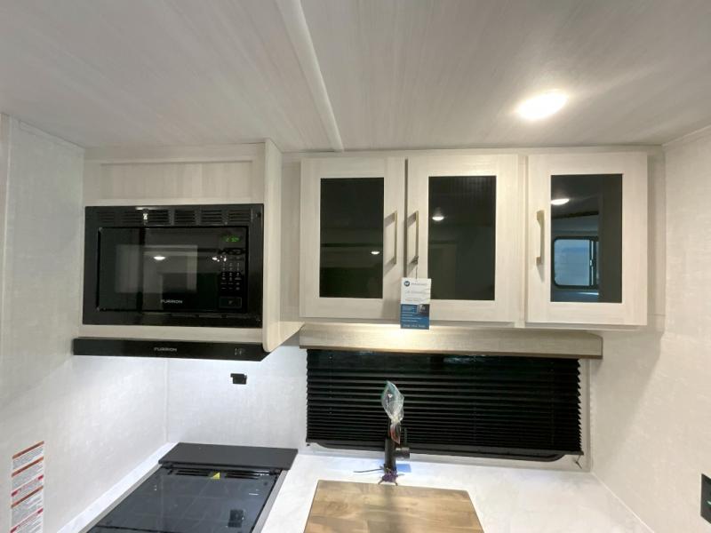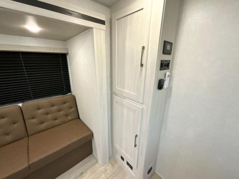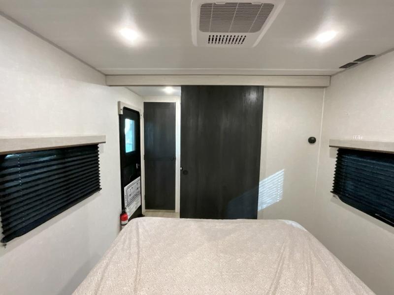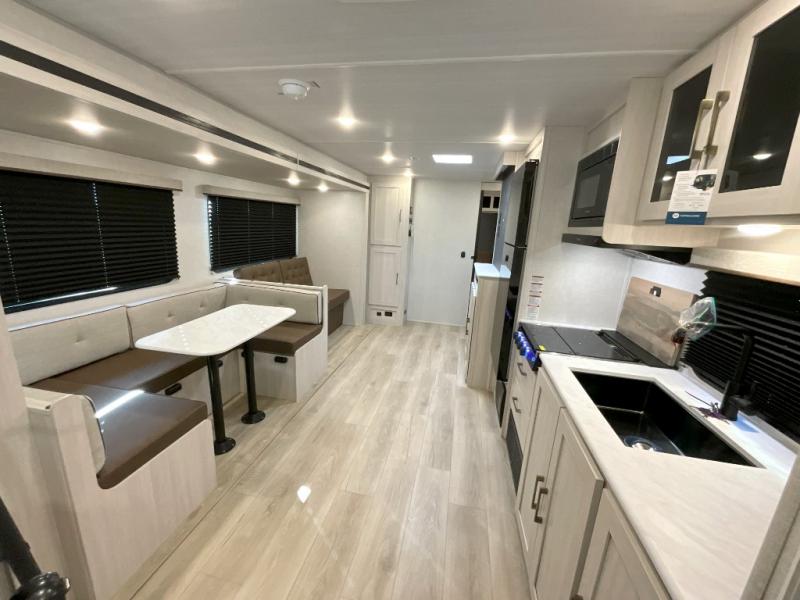 Head to your favorite camping spot with your favorite people in this spacious, dual entry travel trailer! The large slide out houses the U-shaped dinette and sofa where you can relax in the evenings and even let guests sleep over who haven't claimed the double-size bunks. A full bath with its own exterior entry door is convenient for all, and the full kitchen lets you whip up your best meals in the microwave with an air fryer. There is also a walk-in pantry with washer and dryer prep, which gives you the option to add those appliances. When it's time to call it a night, the front private bedroom with a queen bed will provide you with your own space to retreat to, and there are dual bedside wardrobes to keep your clothes organized.