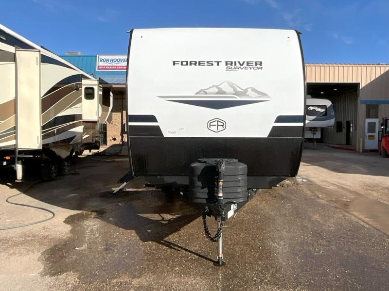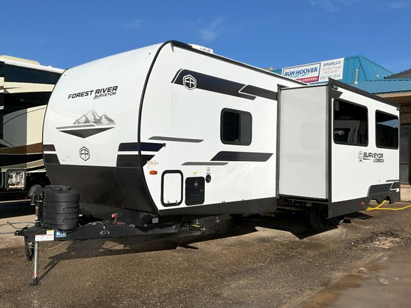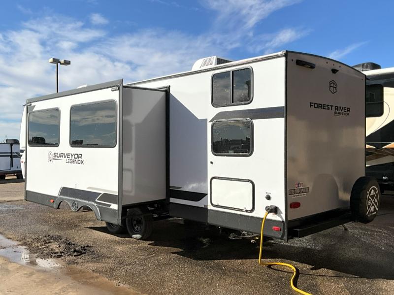 Value and versatility go hand-in-hand with the Surveyor Legend X travel trailers by Forest River. The solid construction includes a 2" aluminum framed floor with block foam insulation and a sealed underbelly with forced heat and radiant foil insulation. A 100-watt roof mounted solar panel will provide some off-grid power, and the power tongue jack will let you easily hitch up and go whenever you're ready. Additional stand-out features include Surf(X) seamless countertops throughout, two A/C units, an electric awning with LED light strip, black glass friction hinge entry door(s), and so much more!