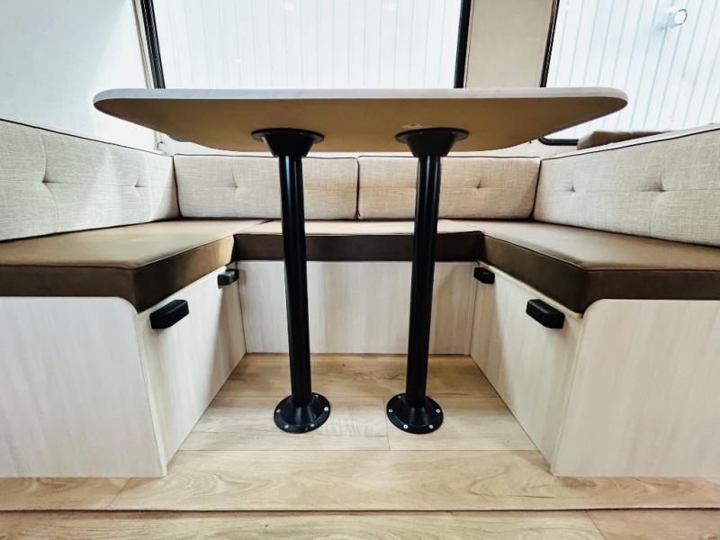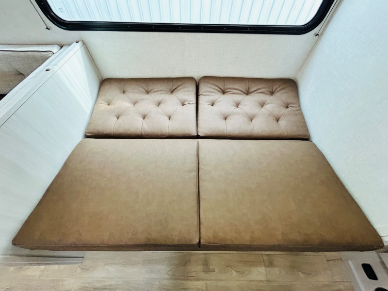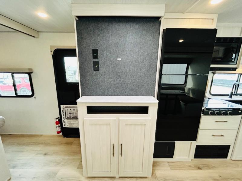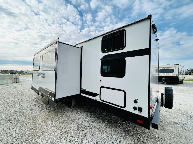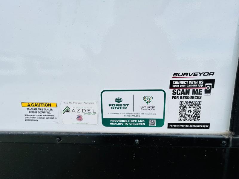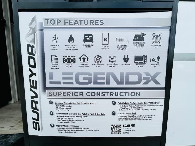 Value and versatility go hand-in-hand with the Surveyor Legend X travel trailers by Forest River. The solid construction includes a 2" aluminum framed floor with block foam insulation and a sealed underbelly with forced heat and radiant foil insulation. A 100-watt roof mounted solar panel will provide some off-grid power, and the power tongue jack will let you easily hitch up and go whenever you're ready. Additional stand-out features include Surf(X) seamless countertops throughout, two A/C units, an electric awning with LED light strip, black glass friction hinge entry door(s), and so much more!
