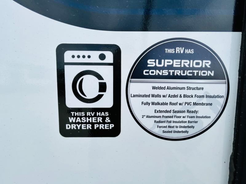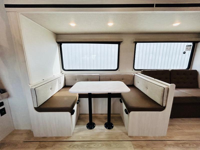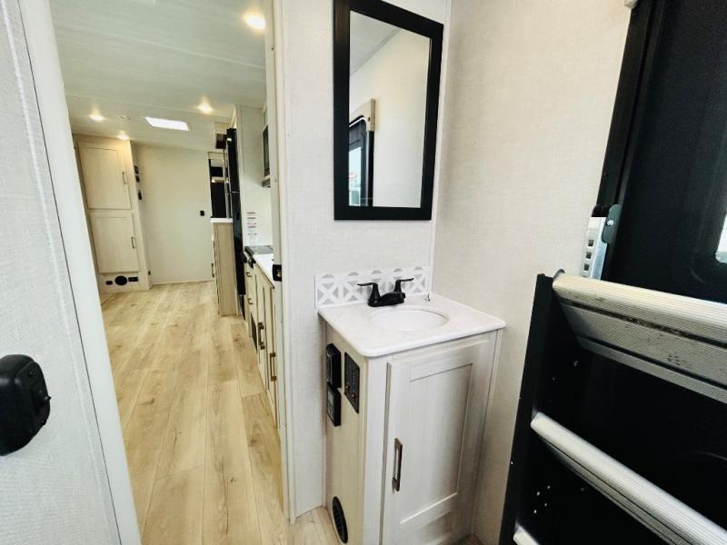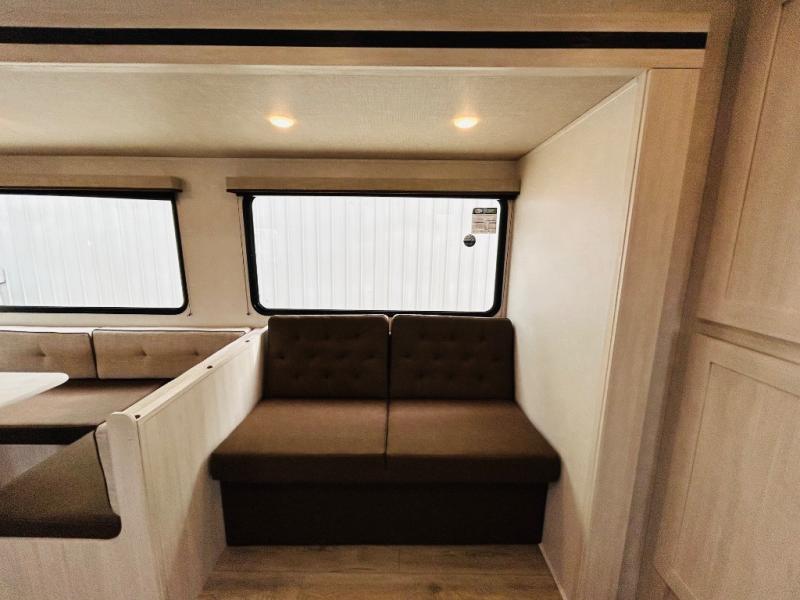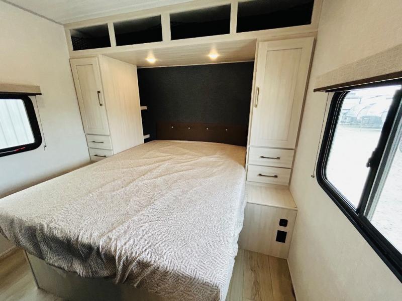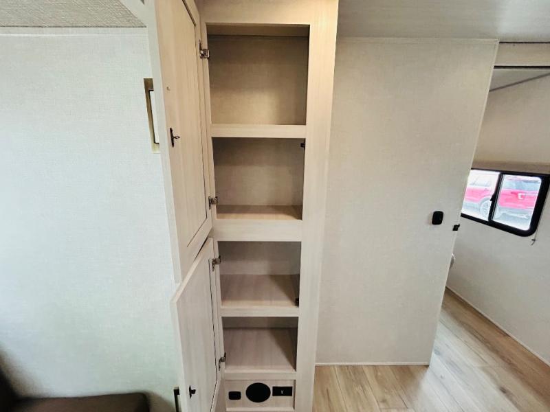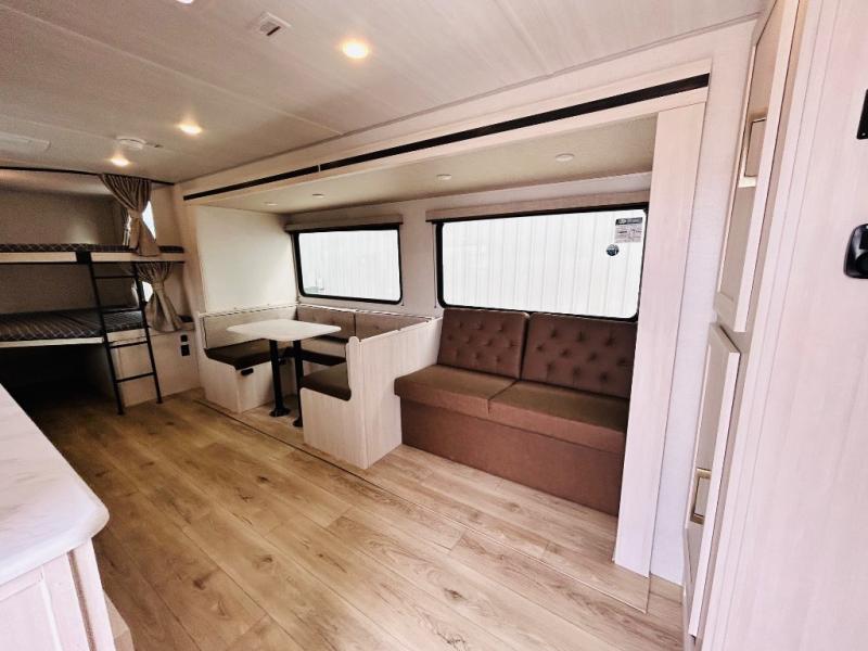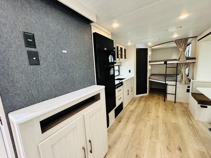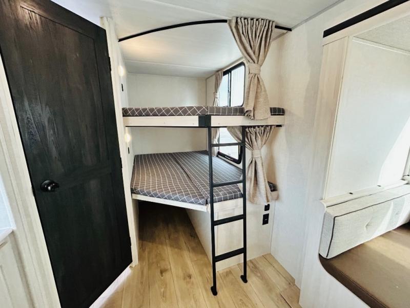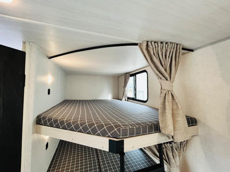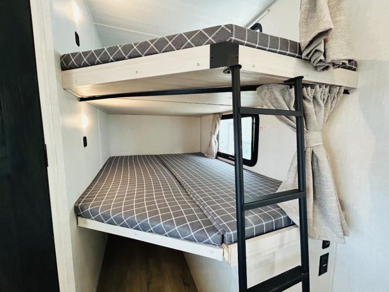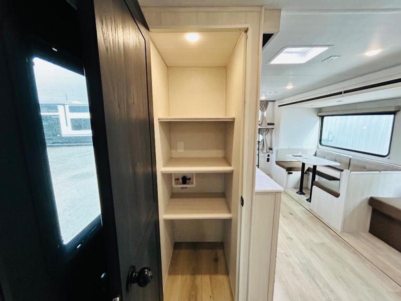 Head to your favorite camping spot with your favorite people in this spacious, dual entry travel trailer! The large slide out houses the U-shaped dinette and sofa where you can relax in the evenings and even let guests sleep over who haven't claimed the double-size bunks. A full bath with its own exterior entry door is convenient for all, and the full kitchen lets you whip up your best meals in the microwave with an air fryer. There is also a walk-in pantry with washer and dryer prep, which gives you the option to add those appliances. When it's time to call it a night, the front private bedroom with a queen bed will provide you with your own space to retreat to, and there are dual bedside wardrobes to keep your clothes organized.