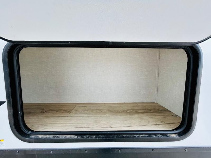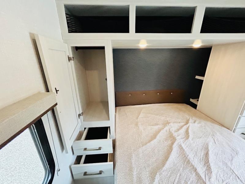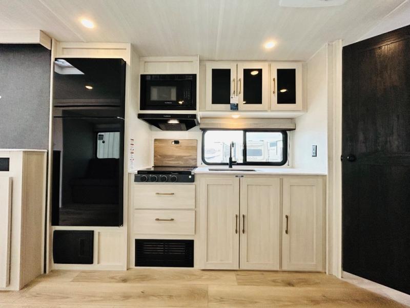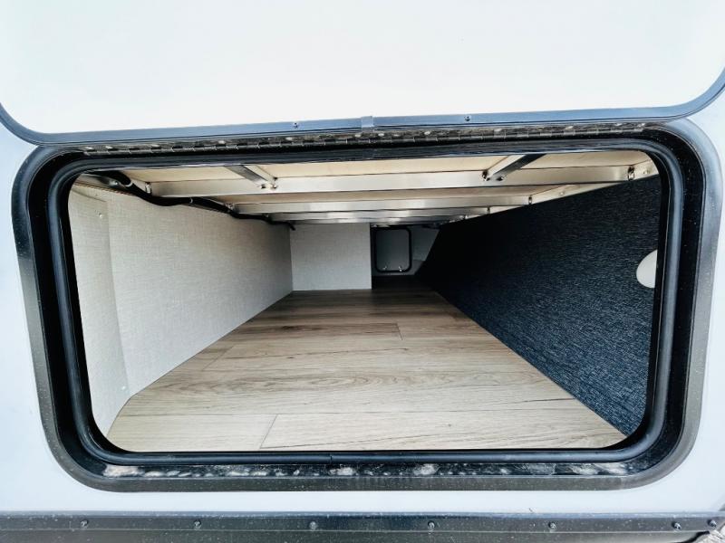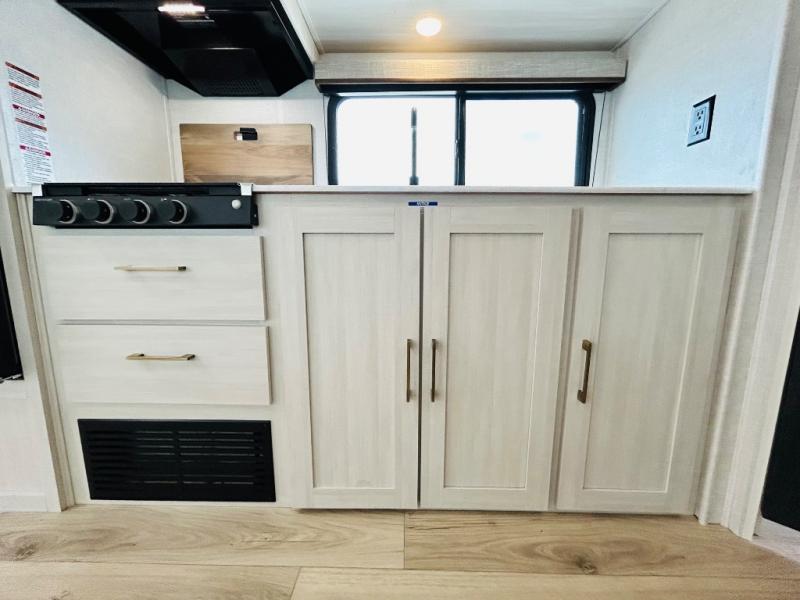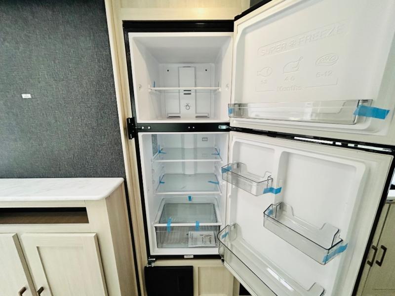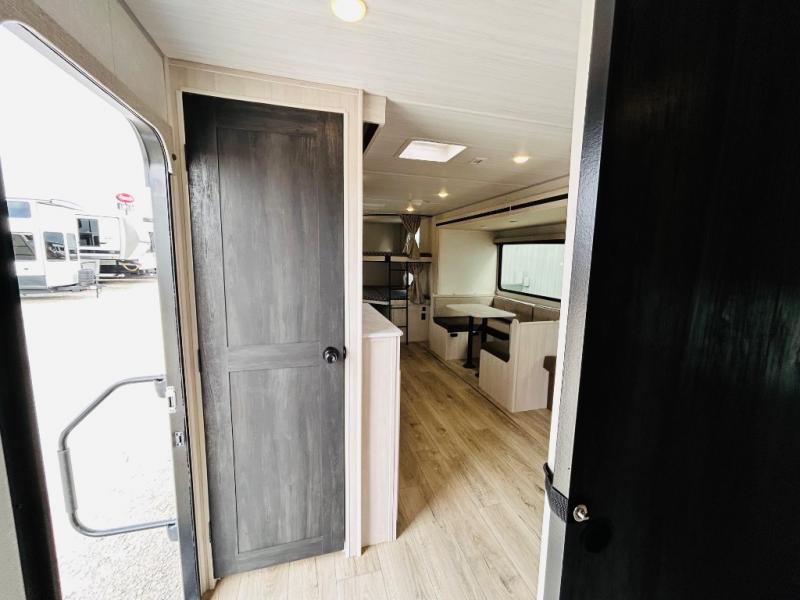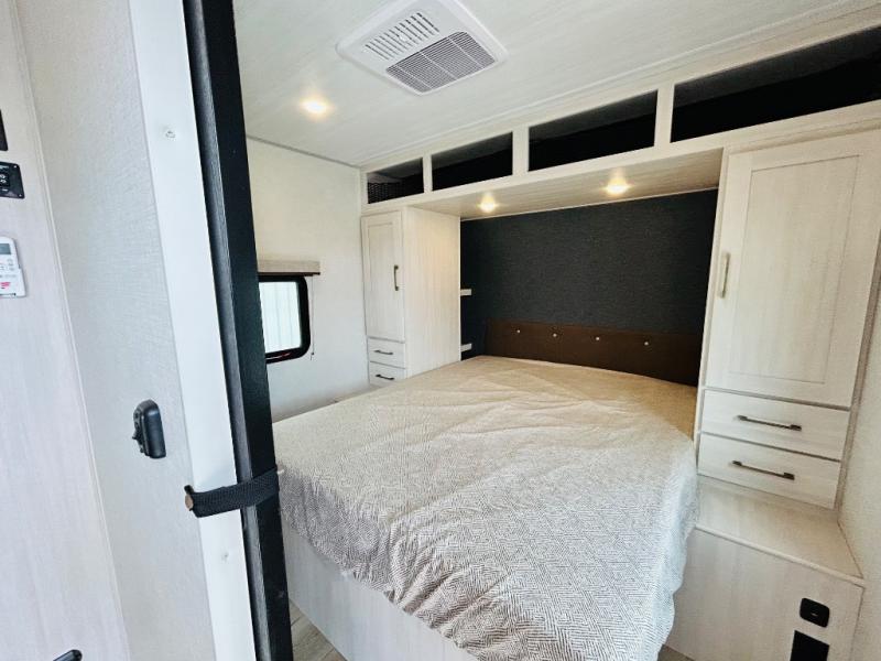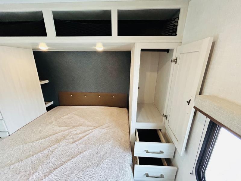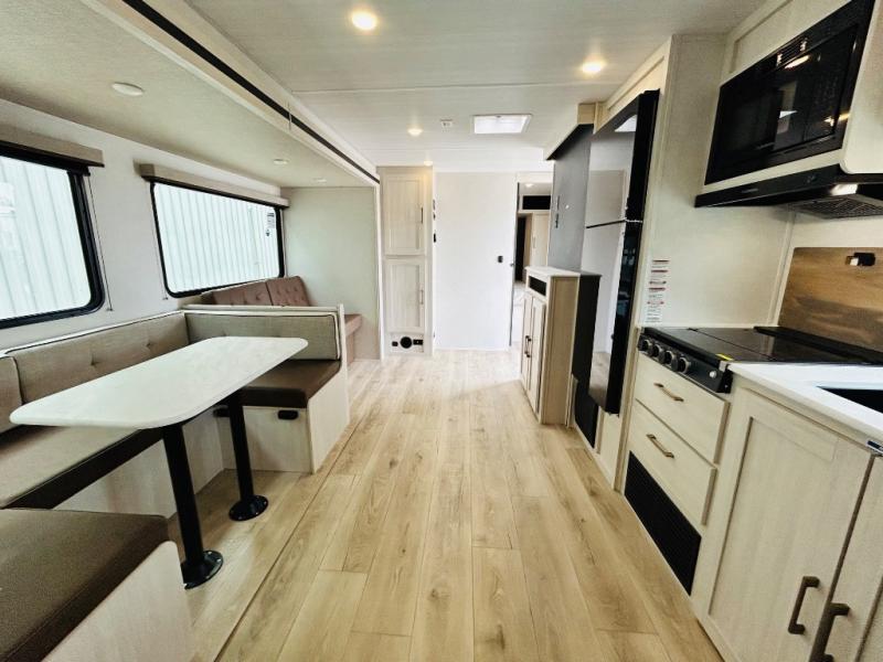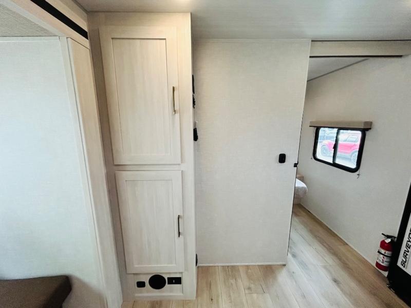 Head to your favorite camping spot with your favorite people in this spacious, dual entry travel trailer! The large slide out houses the U-shaped dinette and sofa where you can relax in the evenings and even let guests sleep over who haven't claimed the double-size bunks. A full bath with its own exterior entry door is convenient for all, and the full kitchen lets you whip up your best meals in the microwave with an air fryer. There is also a walk-in pantry with washer and dryer prep, which gives you the option to add those appliances. When it's time to call it a night, the front private bedroom with a queen bed will provide you with your own space to retreat to, and there are dual bedside wardrobes to keep your clothes organized.