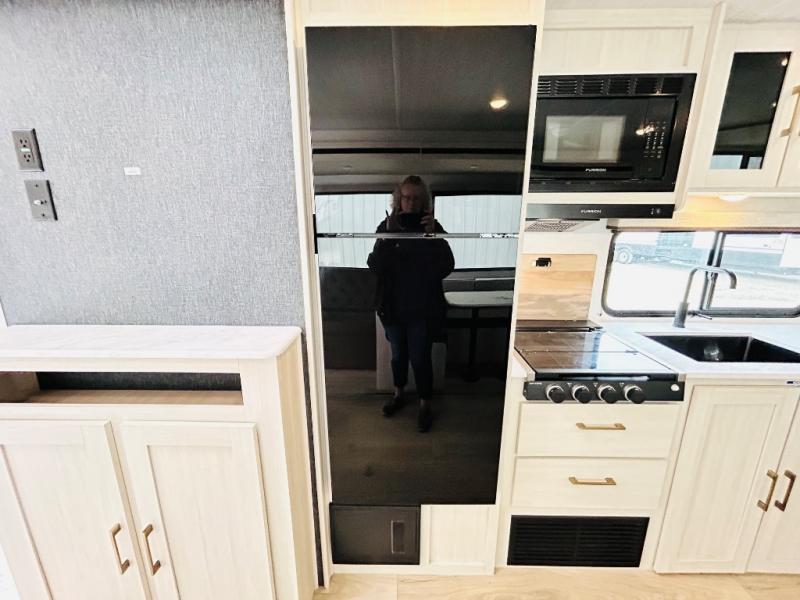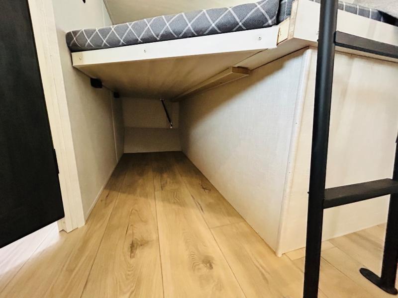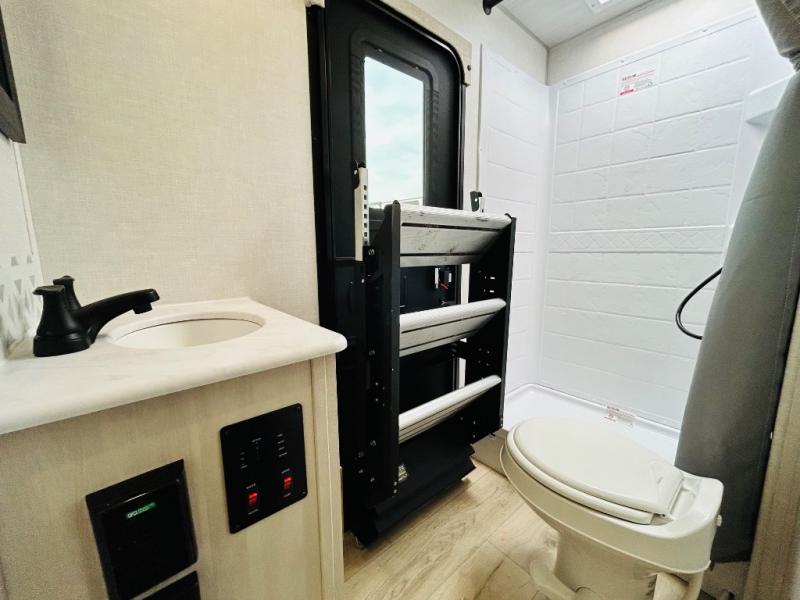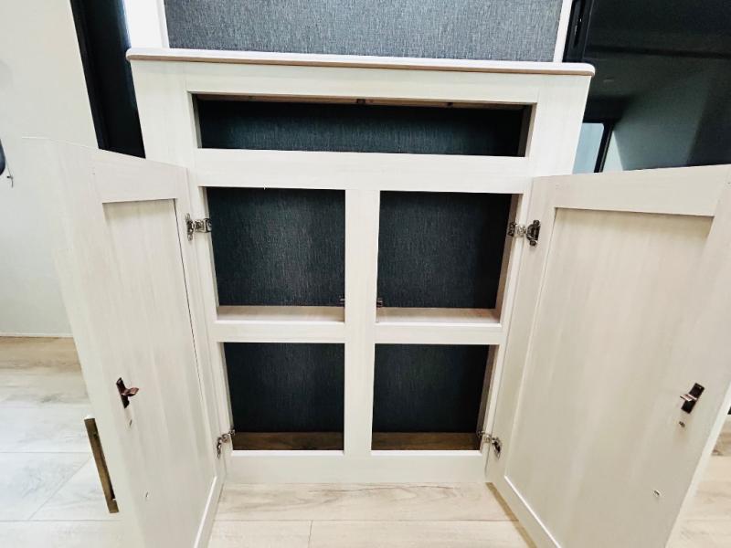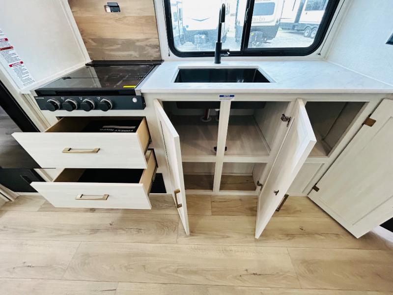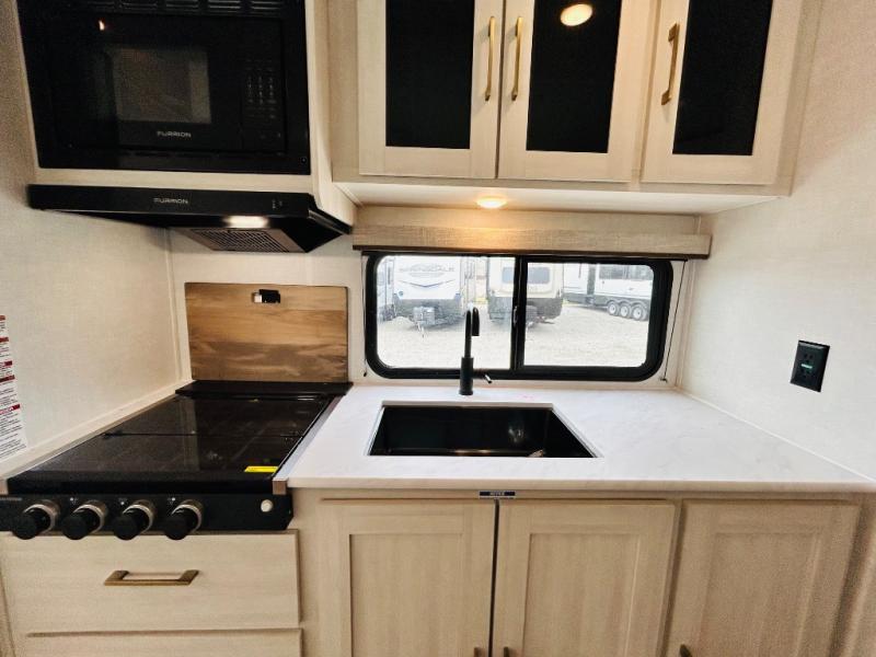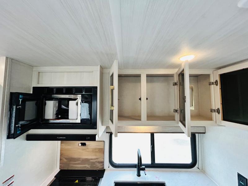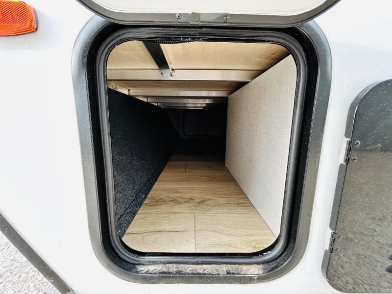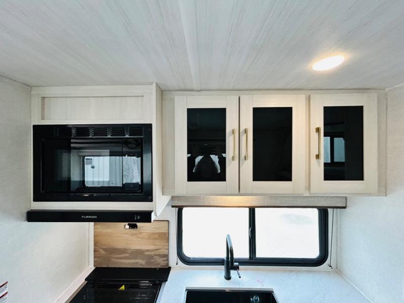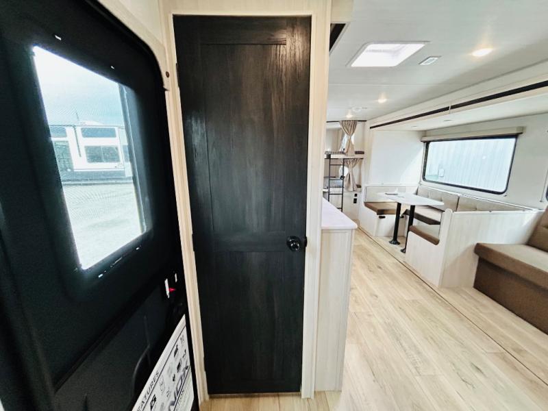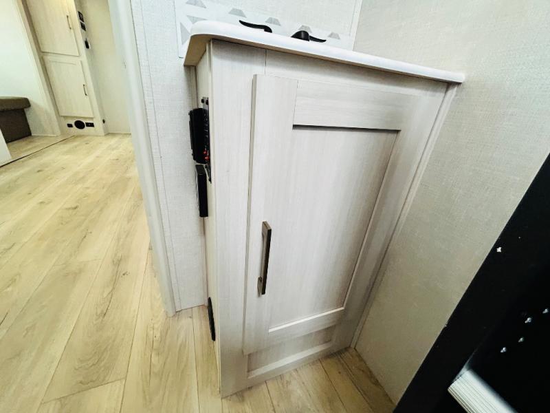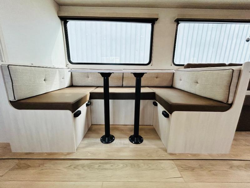 Head to your favorite camping spot with your favorite people in this spacious, dual entry travel trailer! The large slide out houses the U-shaped dinette and sofa where you can relax in the evenings and even let guests sleep over who haven't claimed the double-size bunks. A full bath with its own exterior entry door is convenient for all, and the full kitchen lets you whip up your best meals in the microwave with an air fryer. There is also a walk-in pantry with washer and dryer prep, which gives you the option to add those appliances. When it's time to call it a night, the front private bedroom with a queen bed will provide you with your own space to retreat to, and there are dual bedside wardrobes to keep your clothes organized.
