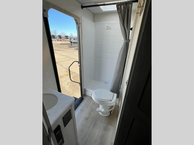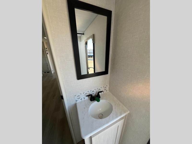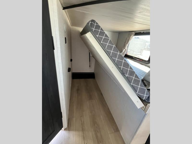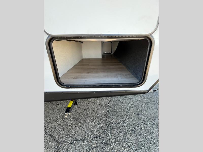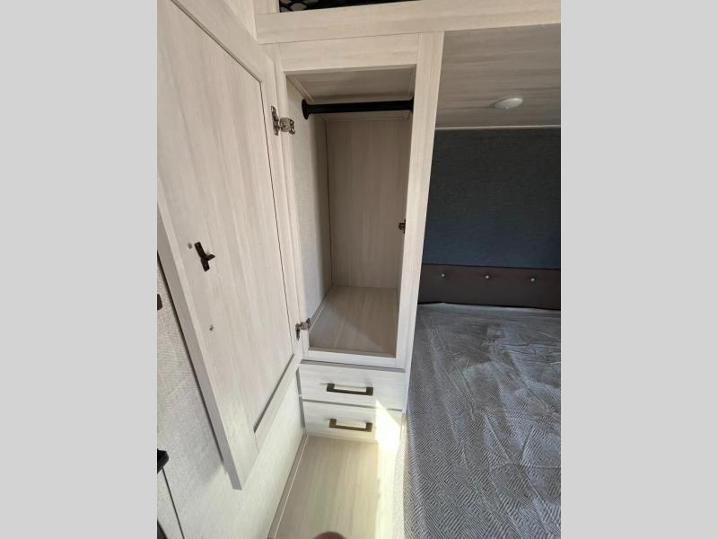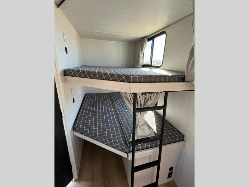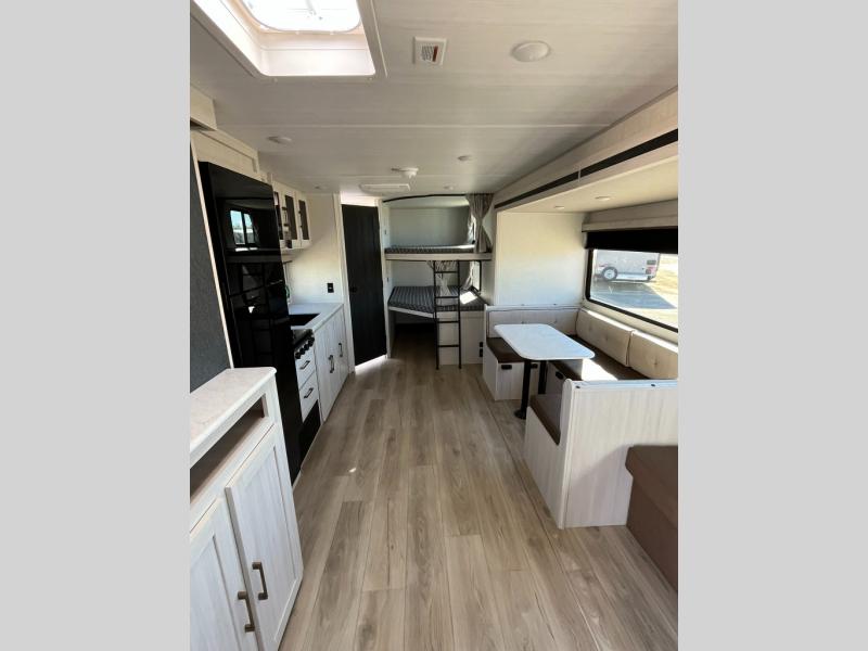 Head to your favorite camping spot with your favorite people in this spacious, dual entry travel trailer! The large slide out houses the U-shaped dinette and sofa where you can relax in the evenings and even let guests sleep over who haven't claimed the double-size bunks. A full bath with its own exterior entry door is convenient for all, and the full kitchen lets you whip up your best meals in the microwave with an air fryer. There is also a walk-in pantry with washer and dryer prep, which gives you the option to add those appliances. When it's time to call it a night, the front private bedroom with a queen bed will provide you with your own space to retreat to, and there are dual bedside wardrobes to keep your clothes organized.