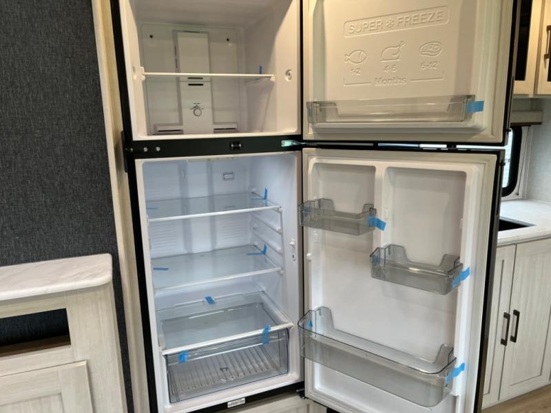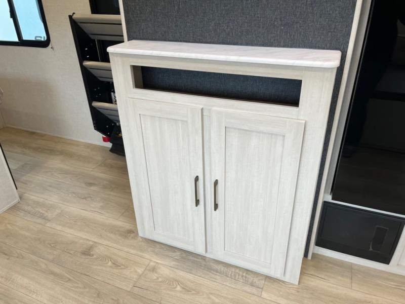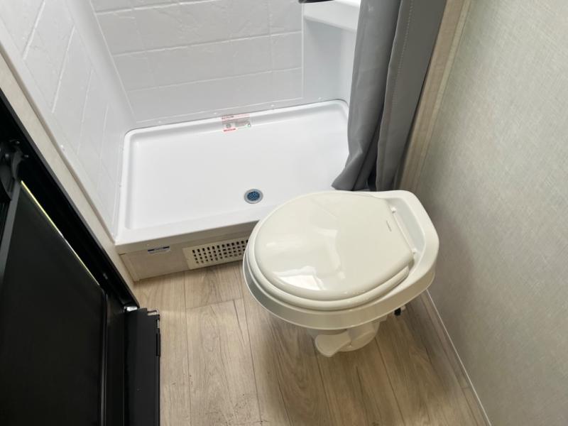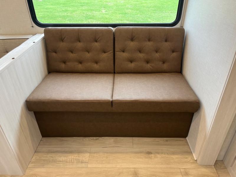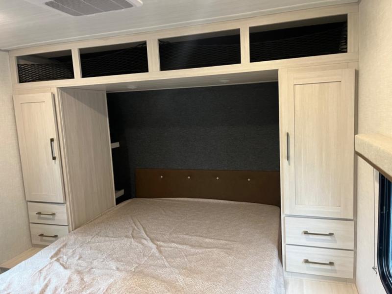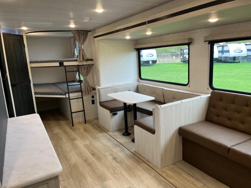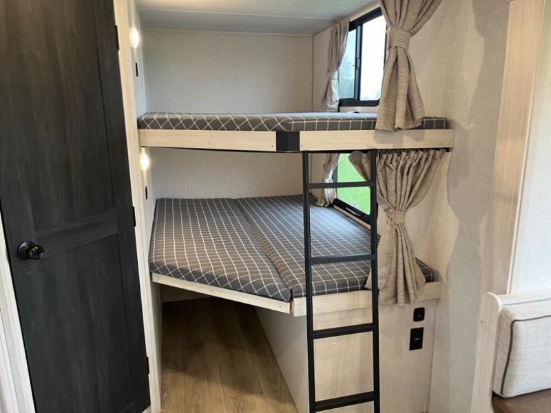 Head to your favorite camping spot with your favorite people in this spacious, dual entry travel trailer! The large slide out houses the U-shaped dinette and sofa where you can relax in the evenings and even let guests sleep over who haven't claimed the double-size bunks. A full bath with its own exterior entry door is convenient for all, and the full kitchen lets you whip up your best meals in the microwave with an air fryer. There is also a walk-in pantry with washer and dryer prep, which gives you the option to add those appliances. When it's time to call it a night, the front private bedroom with a queen bed will provide you with your own space to retreat to, and there are dual bedside wardrobes to keep your clothes organized.