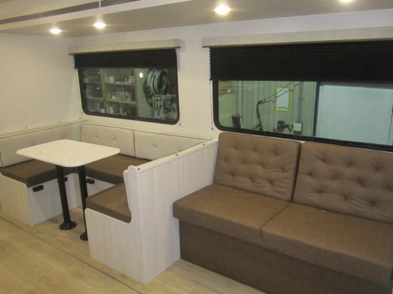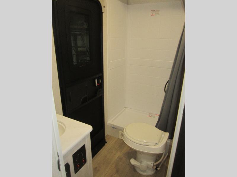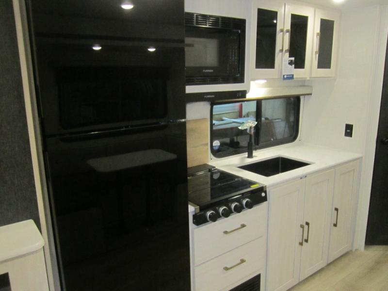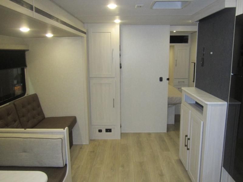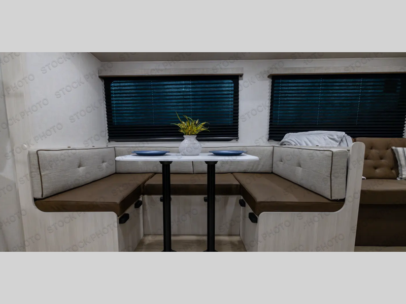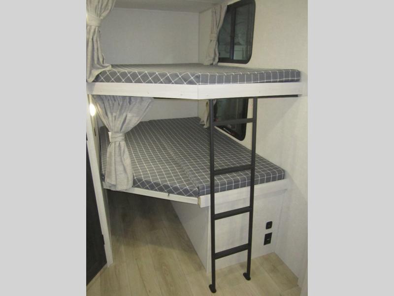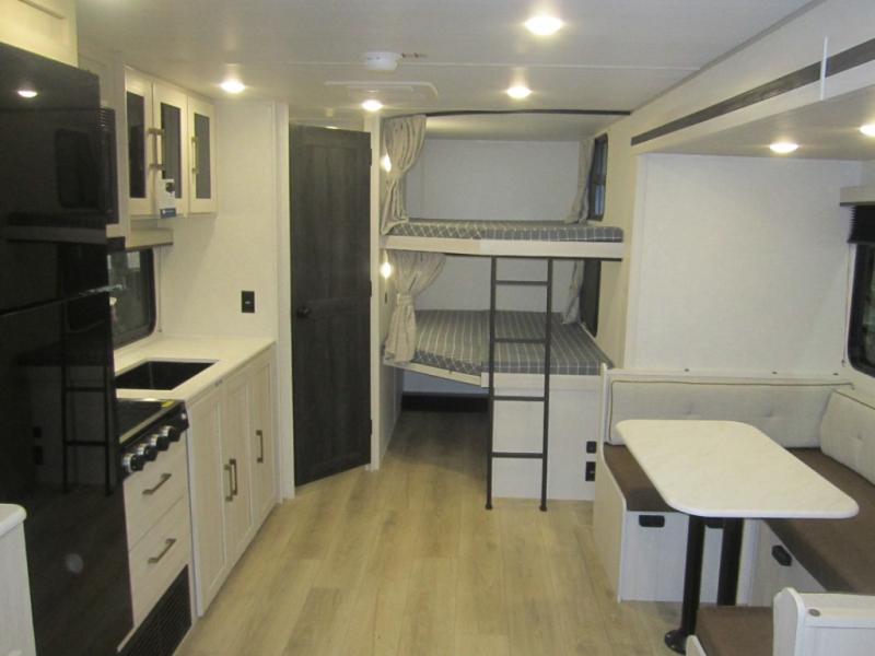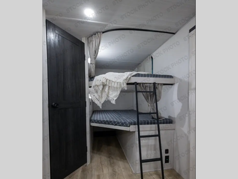Head to your favorite camping spot with your favorite people in this spacious, dual entry travel trailer! The large slide out houses the U-shaped dinette and sofa where you can relax in the evenings and even let guests sleep over who haven't claimed the double-size bunks. A full bath with its own exterior entry door is convenient for all, and the full kitchen lets you whip up your best meals in the microwave with an air fryer. There is also a walk-in pantry with washer and dryer prep, which gives you the option to add those appliances. When it's time to call it a night, the front private bedroom with a queen bed will provide you with your own space to retreat to, and there are dual bedside wardrobes to keep your clothes organized.