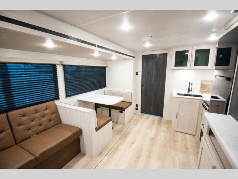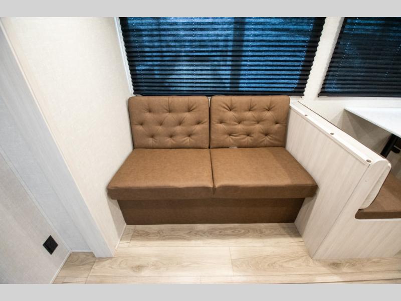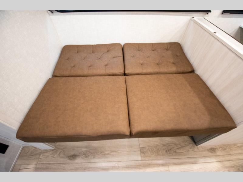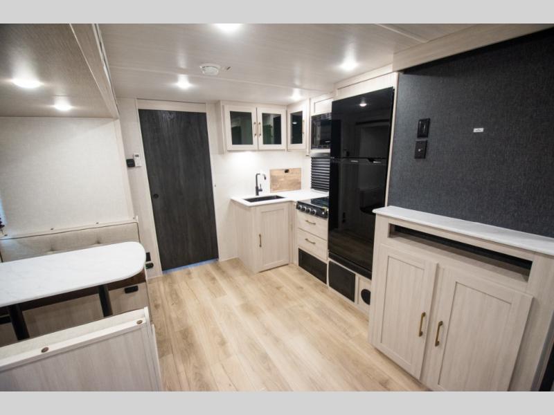 Head to your favorite camping spot with your favorite people in this spacious, dual entry travel trailer! The large slide out houses the booth dinette and sofa where you can relax in the evenings and even let guests sleep over who haven't claimed the quad bunks in the rear bunkhouse. A walk-thru bath is convenient for all, and the full kitchen lets you whip up your best meals in the microwave with an air fryer. And a walk-in pantry with washer and dryer prep makes it easier to go full-time if you choose! When it's time to call it a night, the front master bedroom with a queen bed will provide you with your own space to retreat to, and there are dual bedside wardrobes to keep your clothes organized.