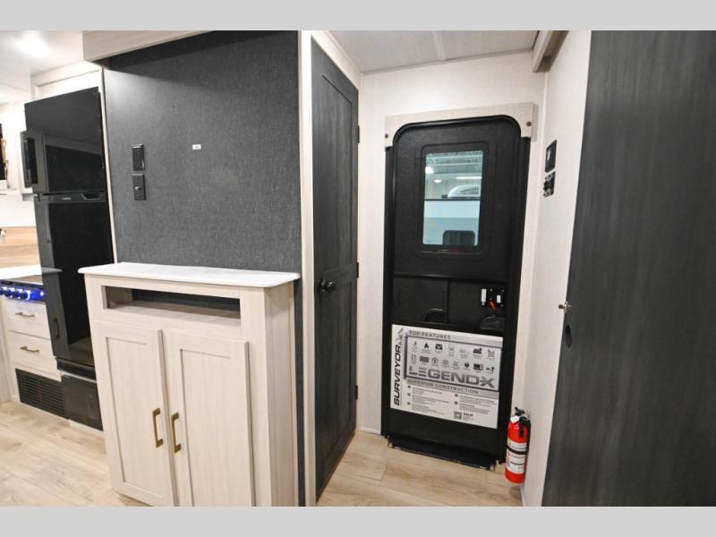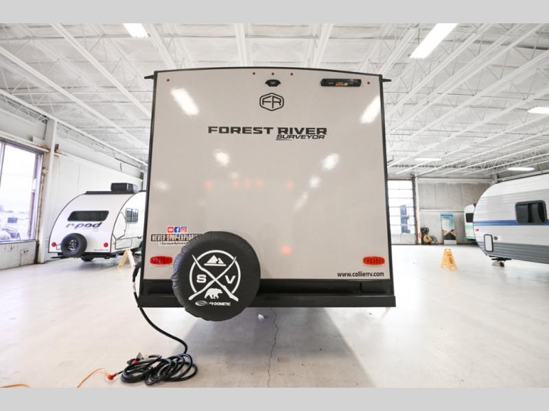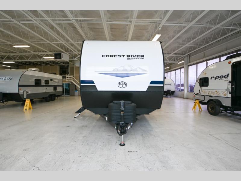 Value and versatility go hand-in-hand with the Surveyor Legend X travel trailers by Forest River. The solid construction includes a 2" aluminum framed floor with block foam insulation and a sealed underbelly with forced heat and radiant foil insulation. A 100-watt roof mounted solar panel will provide some off-grid power, and the power tongue jack will let you easily hitch up and go whenever you're ready. Additional stand-out features include Surf(X) seamless countertops throughout, two A/C units, an electric awning with LED light strip, black glass friction hinge entry door(s), and so much more!