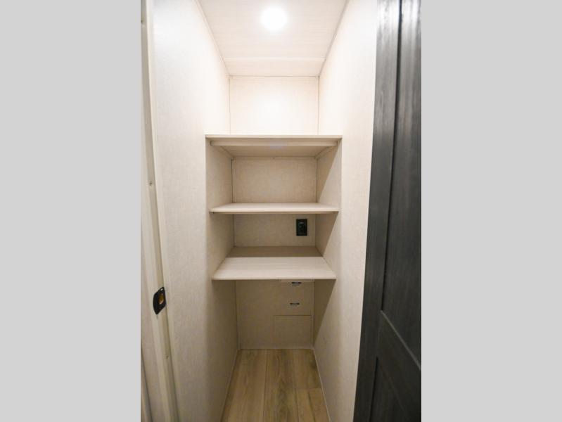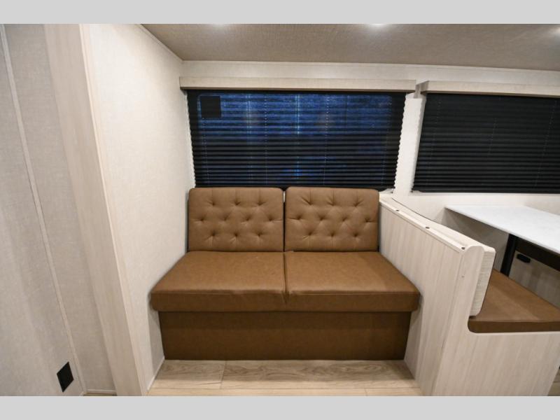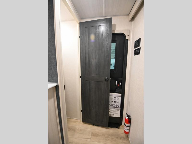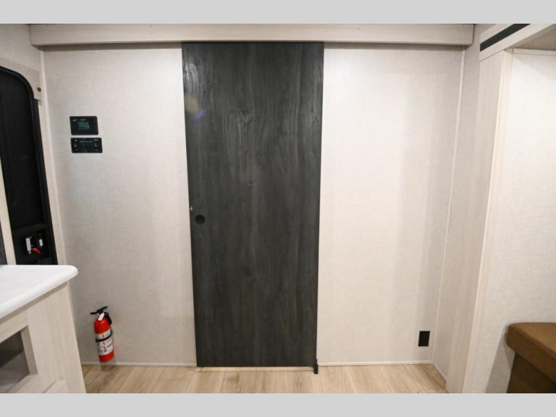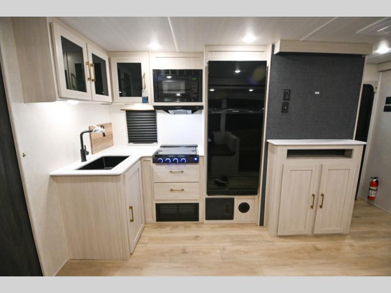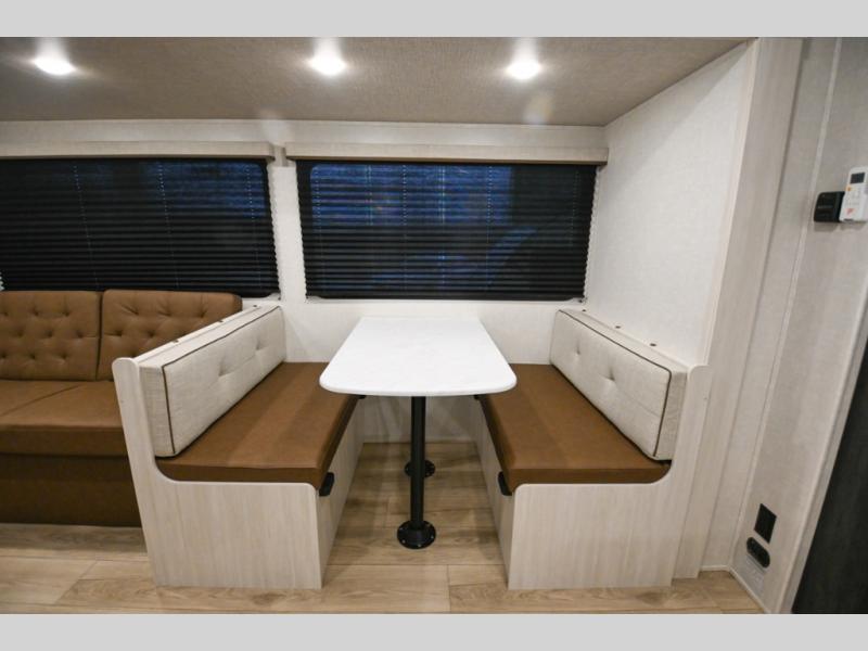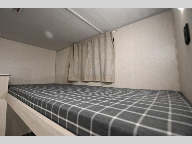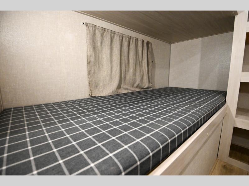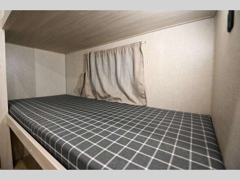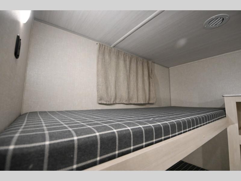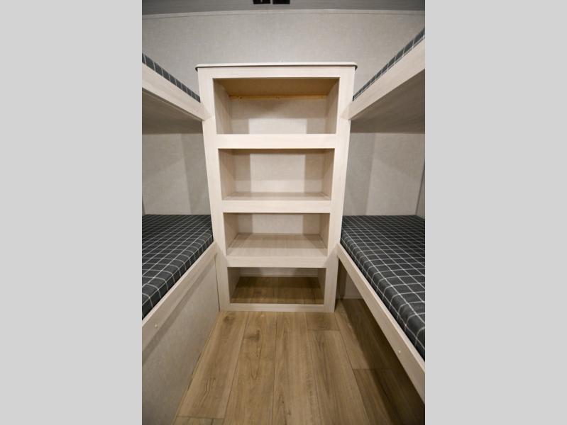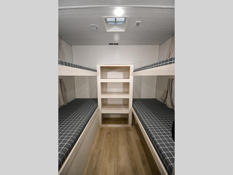 Head to your favorite camping spot with your favorite people in this spacious, dual entry travel trailer! The large slide out houses the booth dinette and sofa where you can relax in the evenings and even let guests sleep over who haven't claimed the quad bunks in the rear bunkhouse. A walk-thru bath is convenient for all, and the full kitchen lets you whip up your best meals in the microwave with an air fryer. And a walk-in pantry with washer and dryer prep makes it easier to go full-time if you choose! When it's time to call it a night, the front master bedroom with a queen bed will provide you with your own space to retreat to, and there are dual bedside wardrobes to keep your clothes organized.