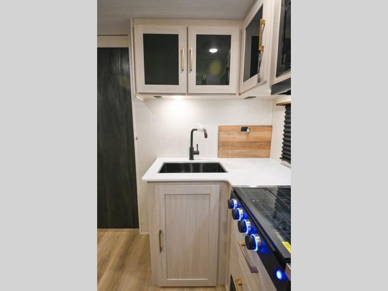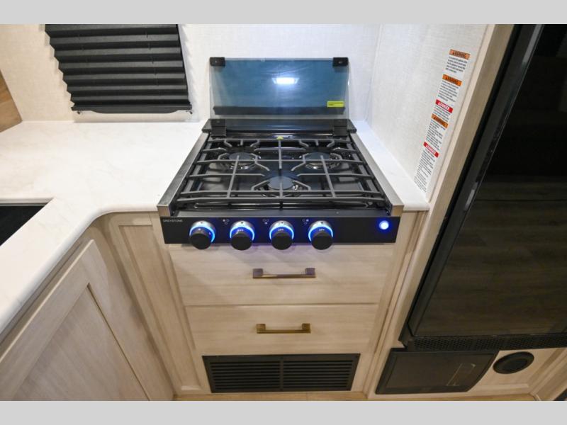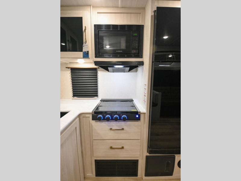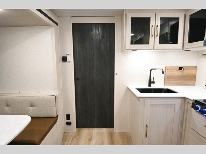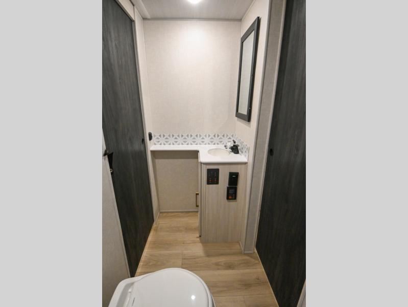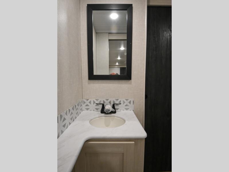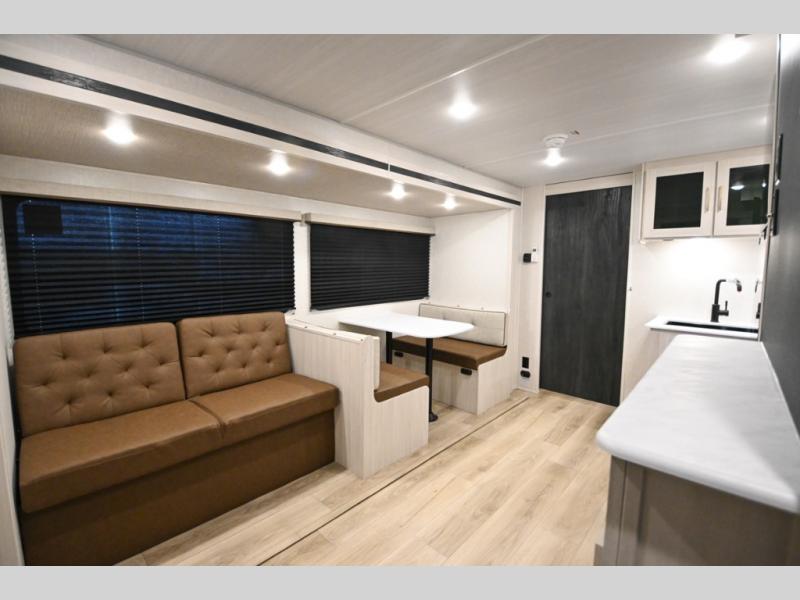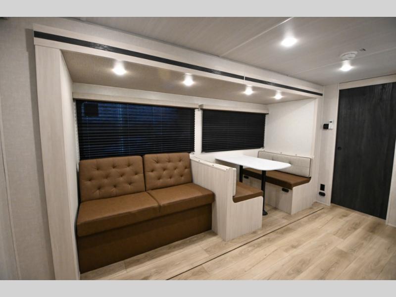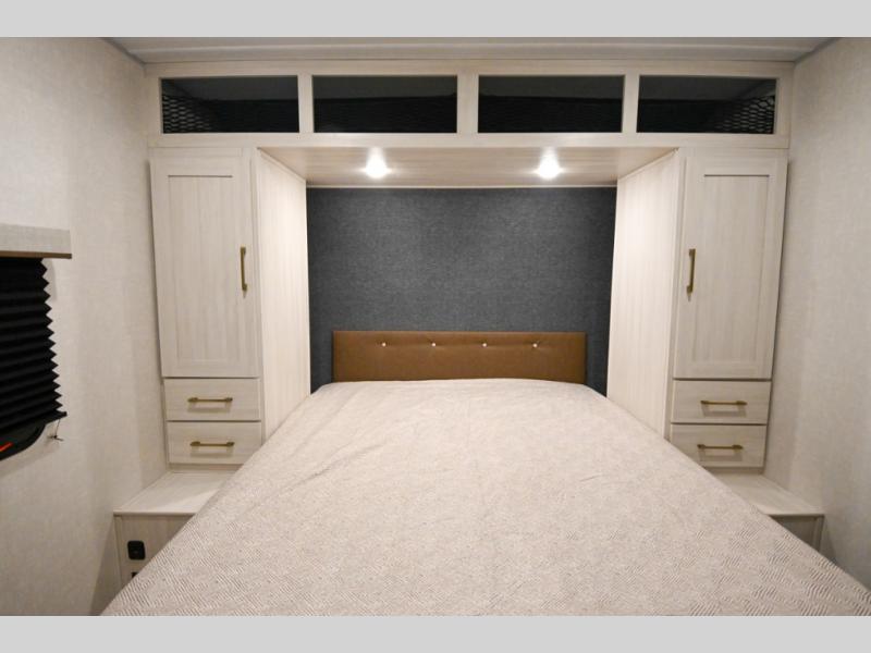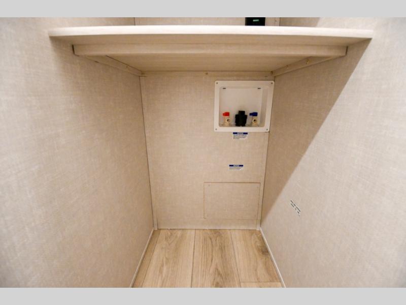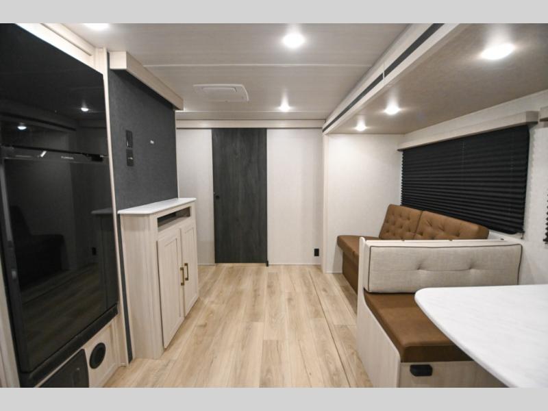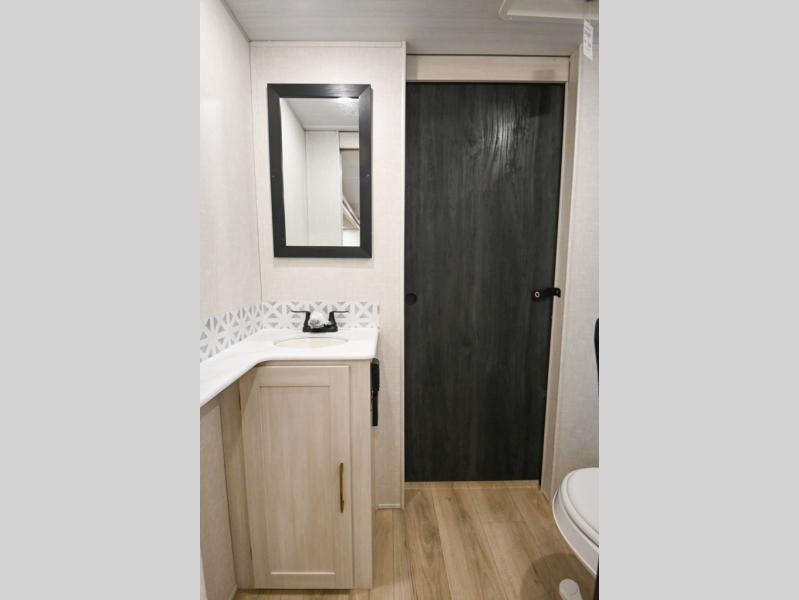 Head to your favorite camping spot with your favorite people in this spacious, dual entry travel trailer! The large slide out houses the booth dinette and sofa where you can relax in the evenings and even let guests sleep over who haven't claimed the quad bunks in the rear bunkhouse. A walk-thru bath is convenient for all, and the full kitchen lets you whip up your best meals in the microwave with an air fryer. And a walk-in pantry with washer and dryer prep makes it easier to go full-time if you choose! When it's time to call it a night, the front master bedroom with a queen bed will provide you with your own space to retreat to, and there are dual bedside wardrobes to keep your clothes organized.