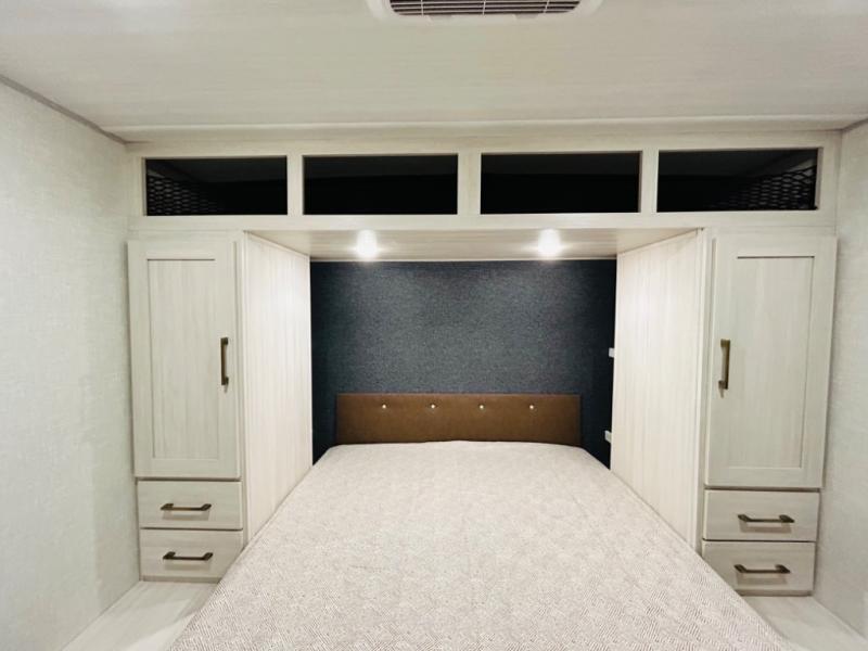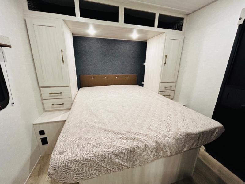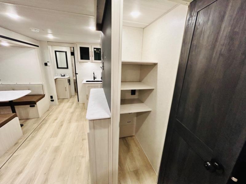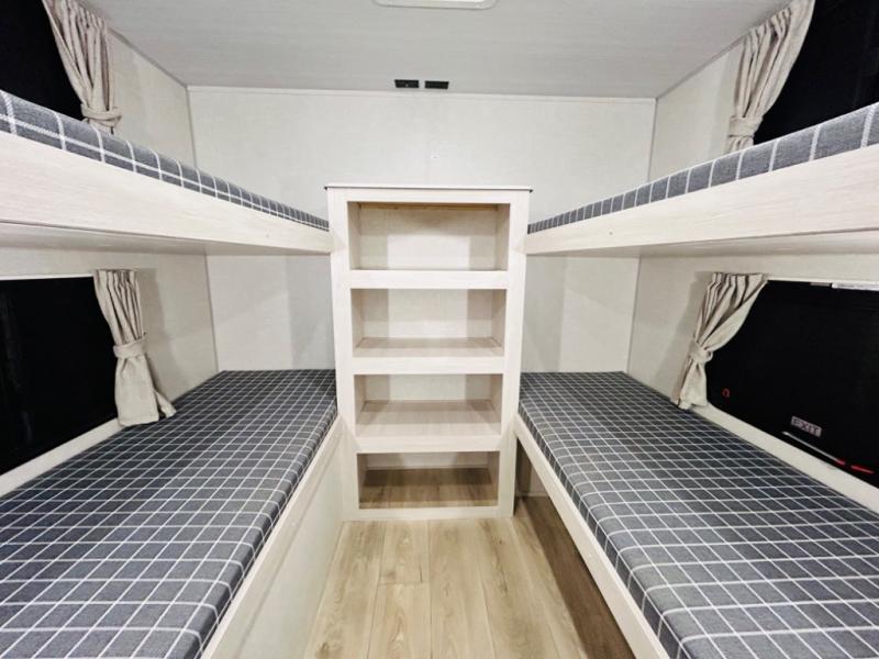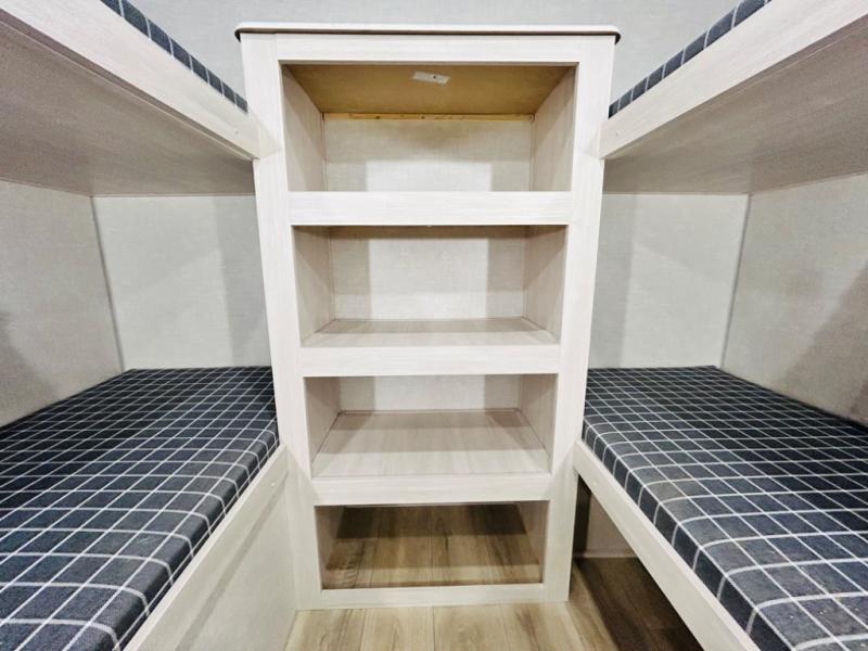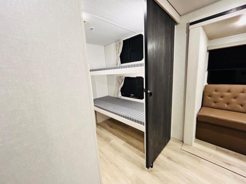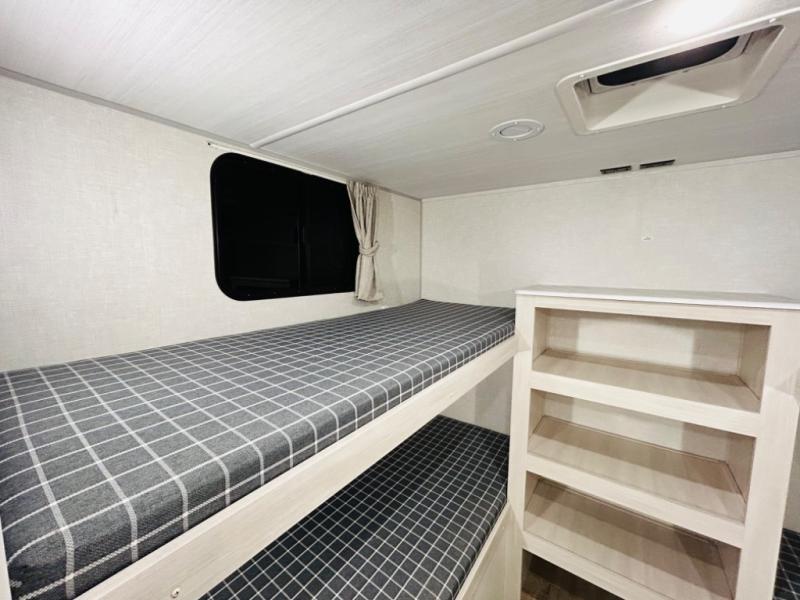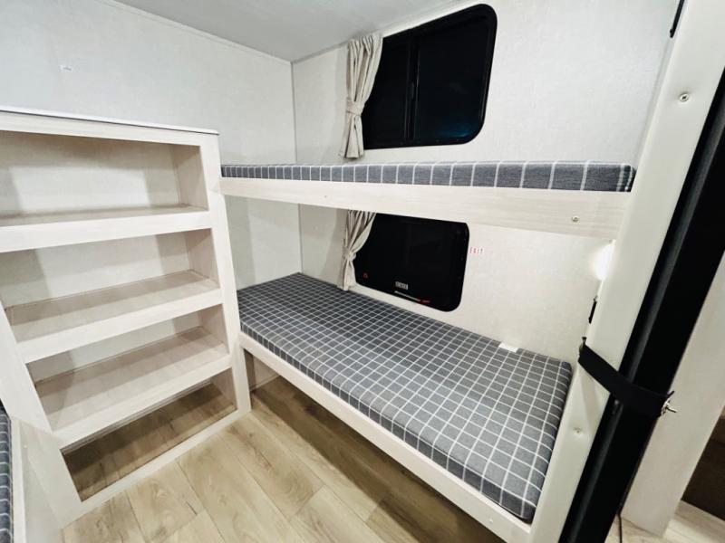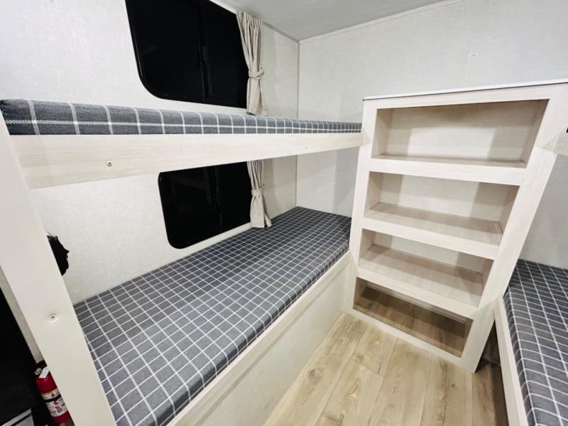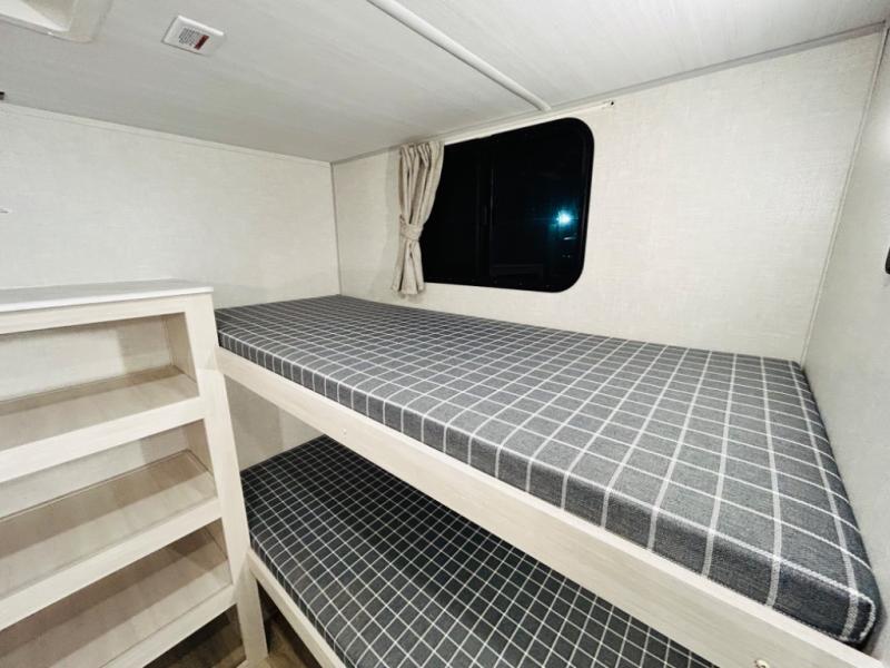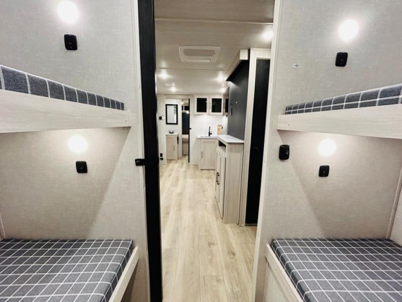 Head to your favorite camping spot with your favorite people in this spacious, dual entry travel trailer! The large slide out houses the booth dinette and sofa where you can relax in the evenings and even let guests sleep over who haven't claimed the quad bunks in the rear bunkhouse. A walk-thru bath is convenient for all, and the full kitchen lets you whip up your best meals in the microwave with an air fryer. And a walk-in pantry with washer and dryer prep makes it easier to go full-time if you choose! When it's time to call it a night, the front master bedroom with a queen bed will provide you with your own space to retreat to, and there are dual bedside wardrobes to keep your clothes organized.