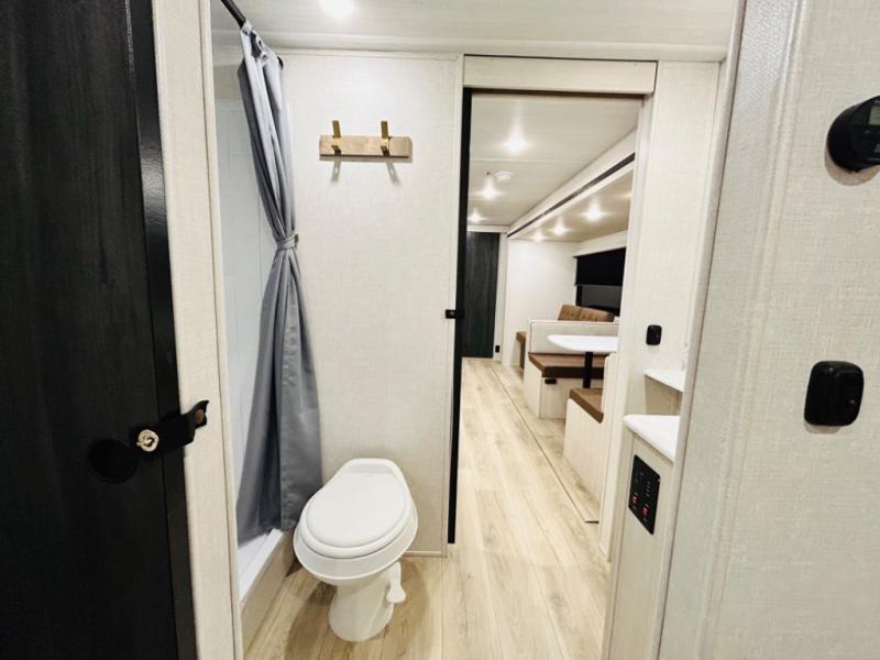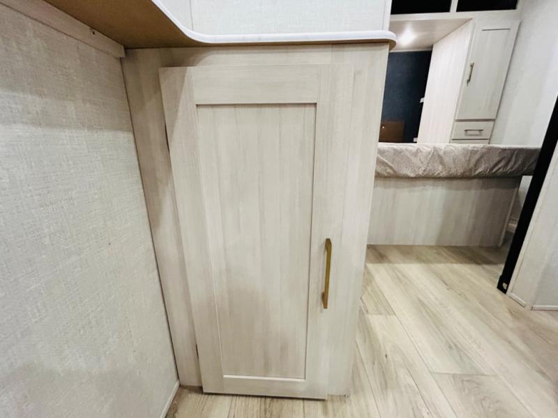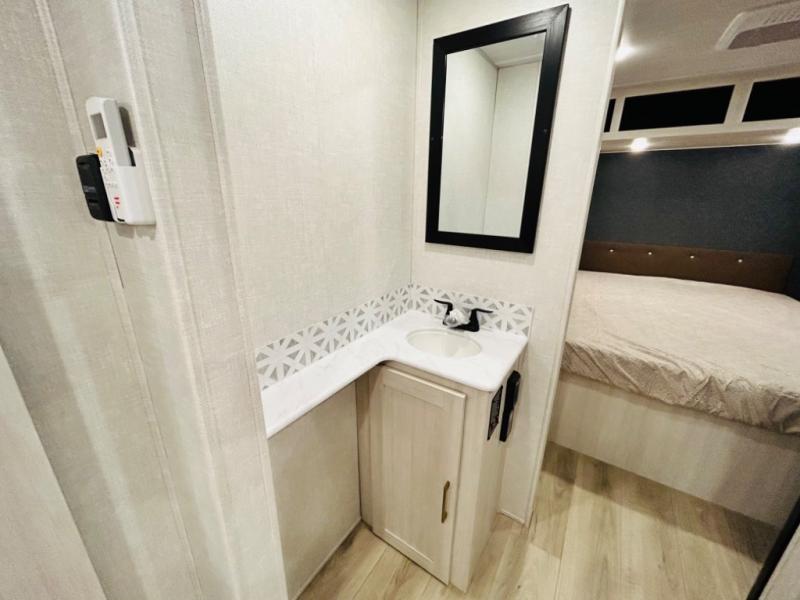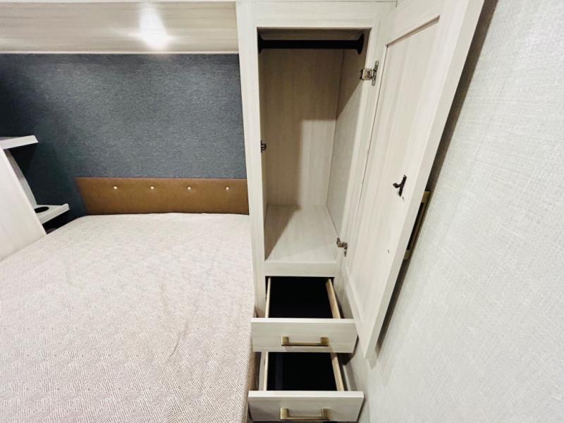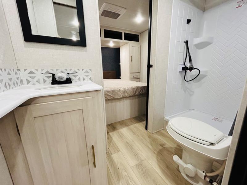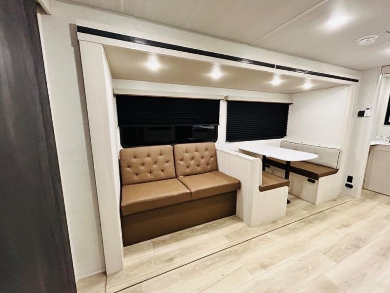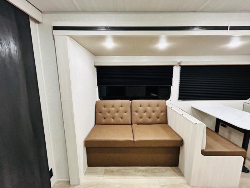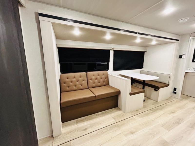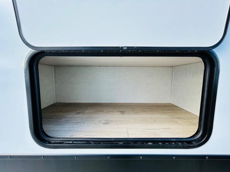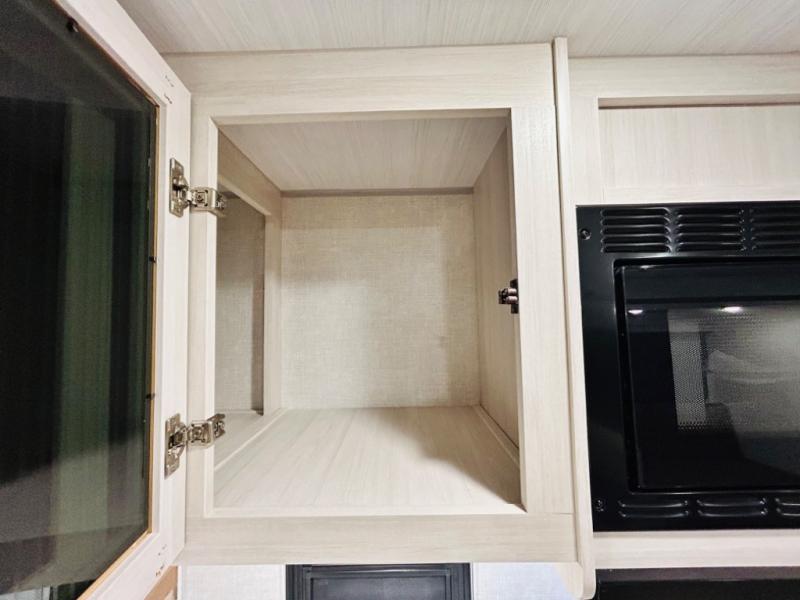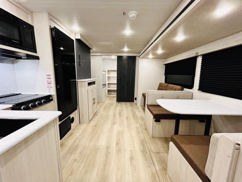 Head to your favorite camping spot with your favorite people in this spacious, dual entry travel trailer! The large slide out houses the booth dinette and sofa where you can relax in the evenings and even let guests sleep over who haven't claimed the quad bunks in the rear bunkhouse. A walk-thru bath is convenient for all, and the full kitchen lets you whip up your best meals in the microwave with an air fryer. And a walk-in pantry with washer and dryer prep makes it easier to go full-time if you choose! When it's time to call it a night, the front master bedroom with a queen bed will provide you with your own space to retreat to, and there are dual bedside wardrobes to keep your clothes organized.