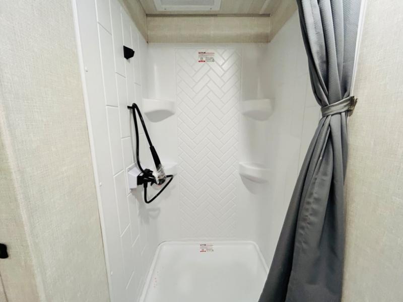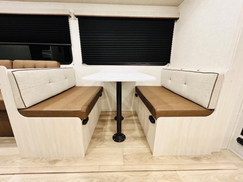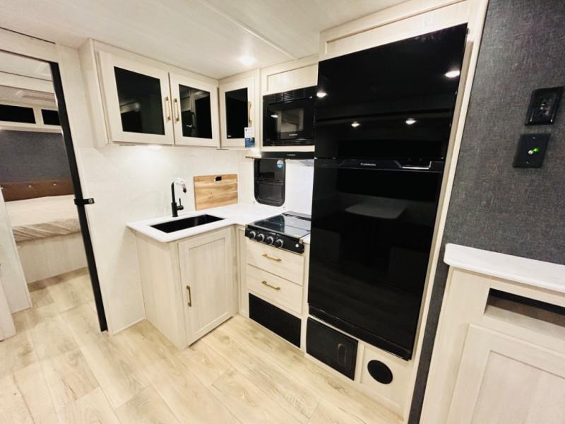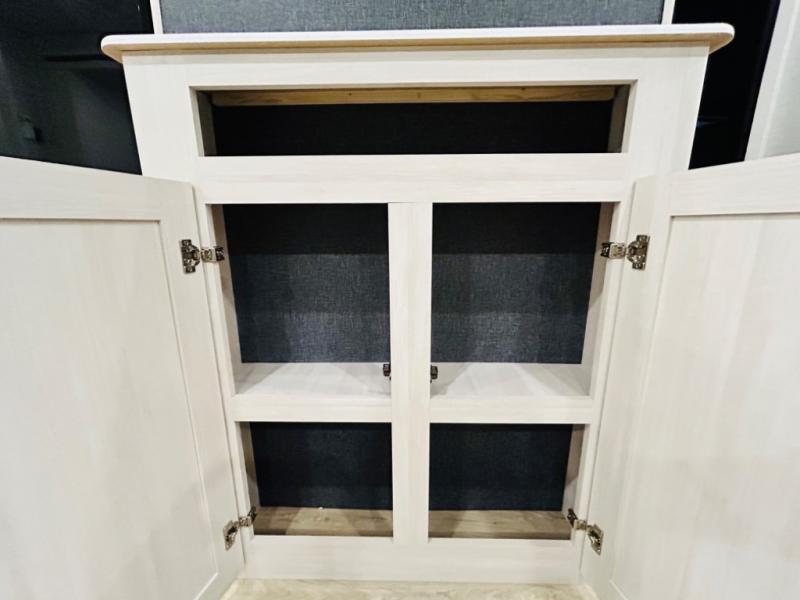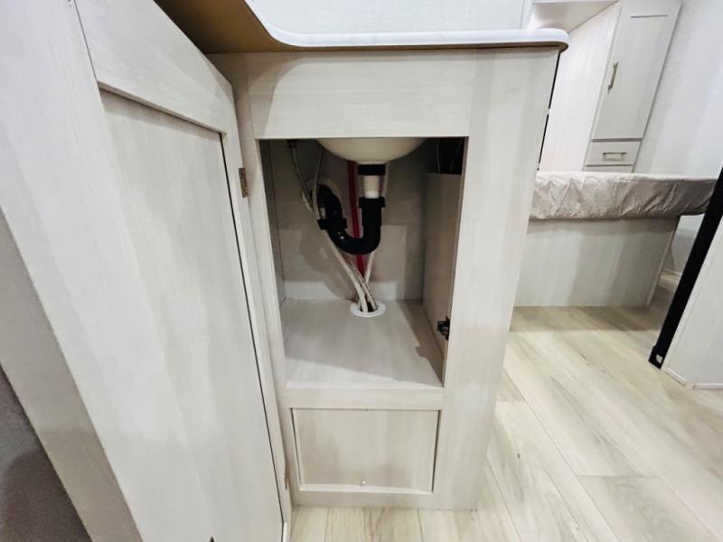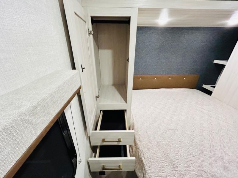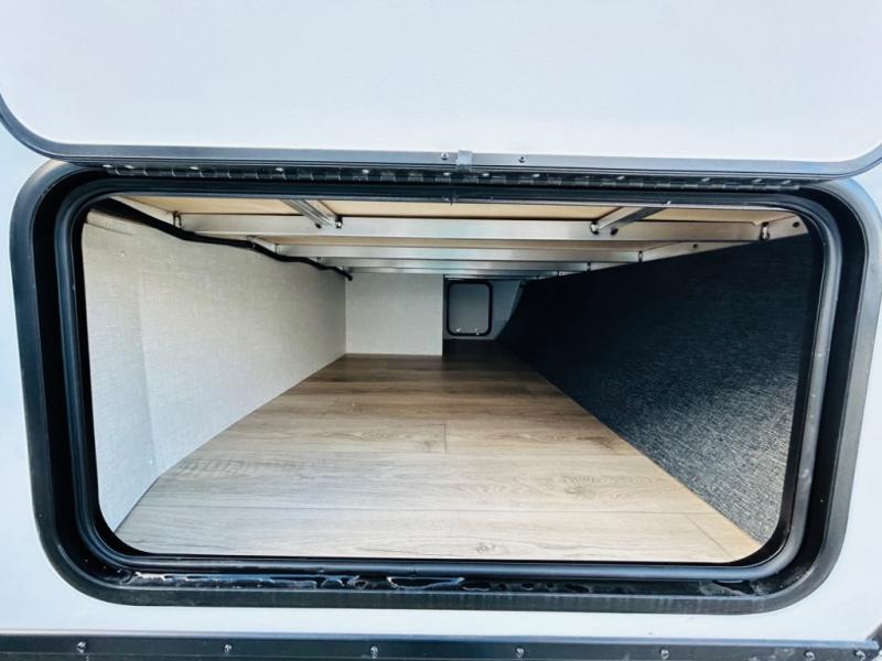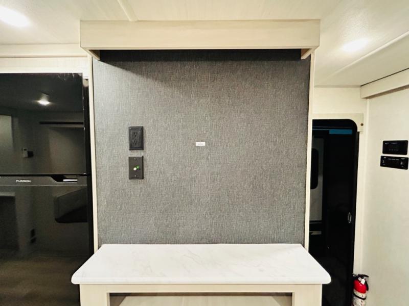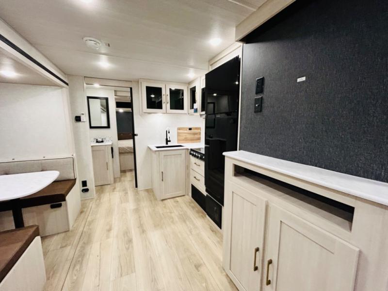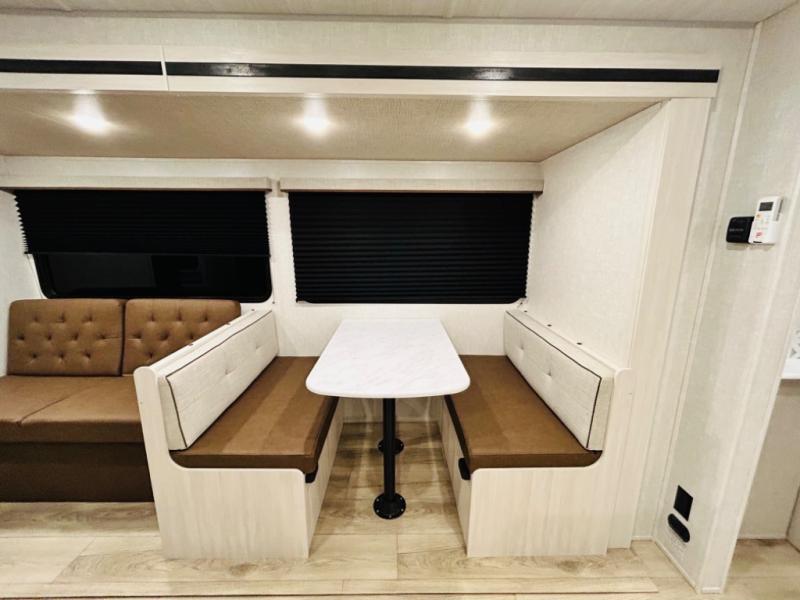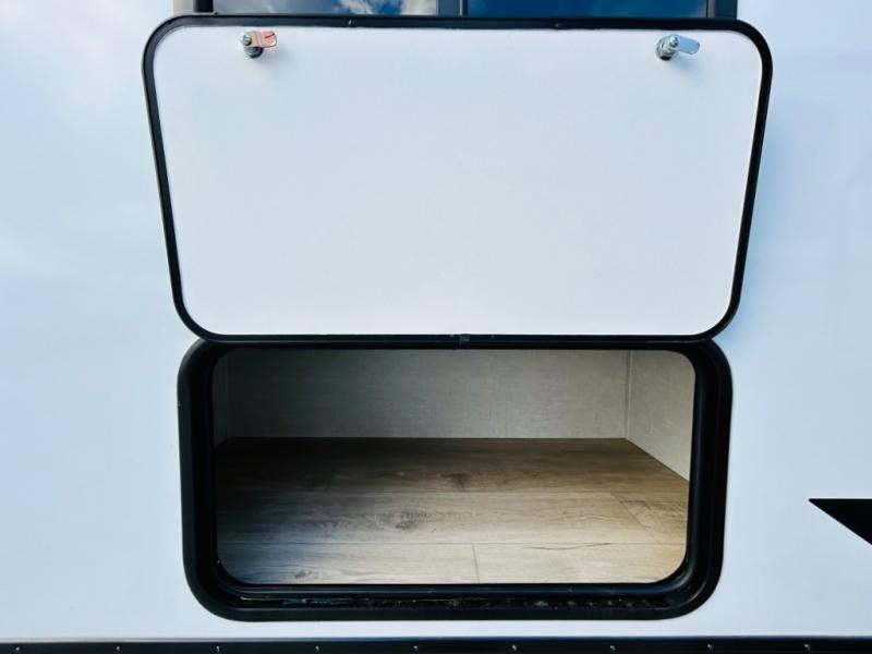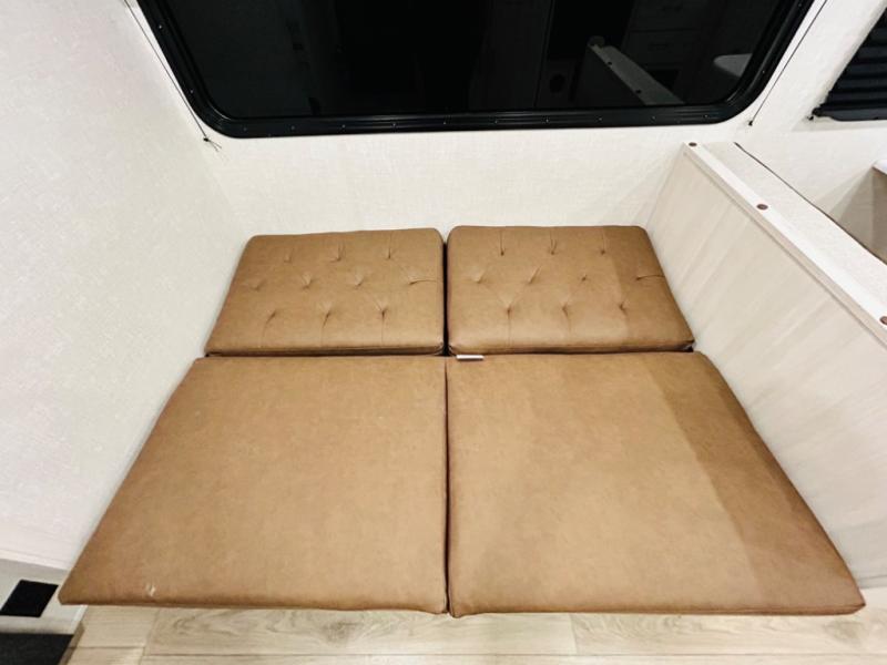 Head to your favorite camping spot with your favorite people in this spacious, dual entry travel trailer! The large slide out houses the booth dinette and sofa where you can relax in the evenings and even let guests sleep over who haven't claimed the quad bunks in the rear bunkhouse. A walk-thru bath is convenient for all, and the full kitchen lets you whip up your best meals in the microwave with an air fryer. And a walk-in pantry with washer and dryer prep makes it easier to go full-time if you choose! When it's time to call it a night, the front master bedroom with a queen bed will provide you with your own space to retreat to, and there are dual bedside wardrobes to keep your clothes organized.