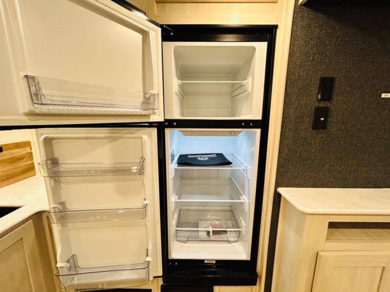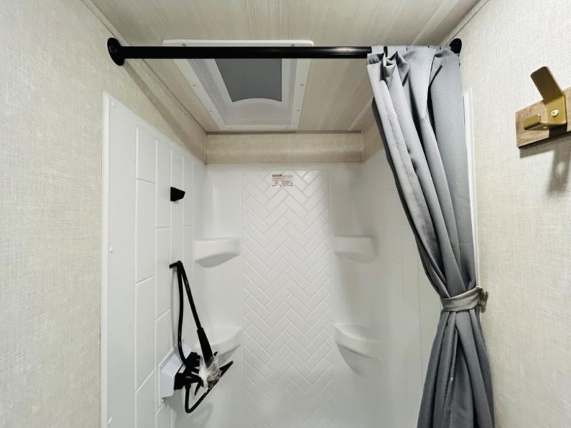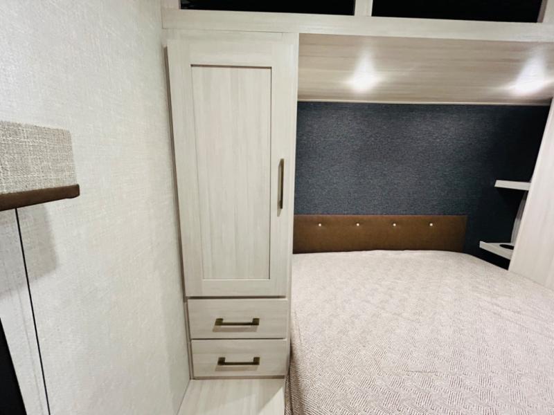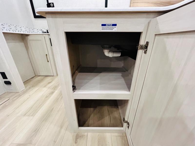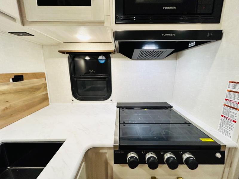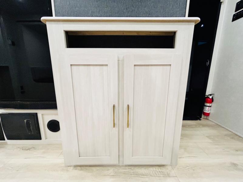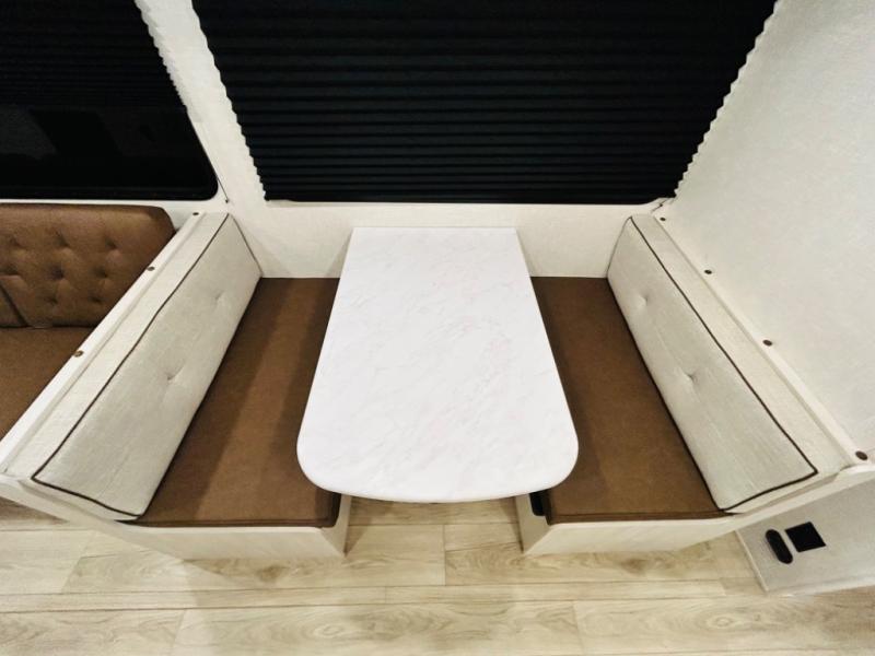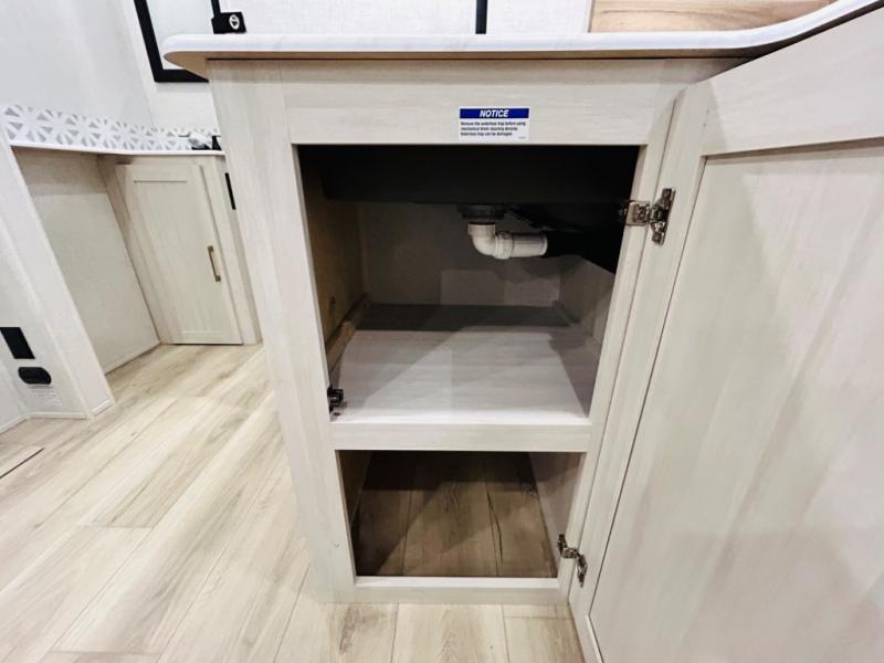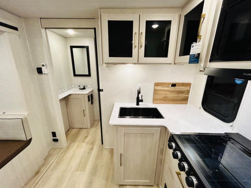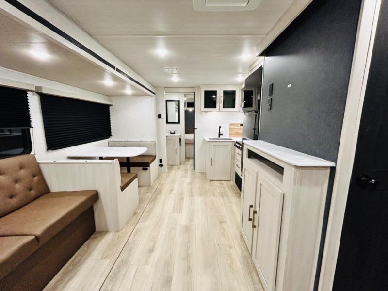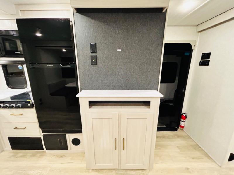 Head to your favorite camping spot with your favorite people in this spacious, dual entry travel trailer! The large slide out houses the booth dinette and sofa where you can relax in the evenings and even let guests sleep over who haven't claimed the quad bunks in the rear bunkhouse. A walk-thru bath is convenient for all, and the full kitchen lets you whip up your best meals in the microwave with an air fryer. And a walk-in pantry with washer and dryer prep makes it easier to go full-time if you choose! When it's time to call it a night, the front master bedroom with a queen bed will provide you with your own space to retreat to, and there are dual bedside wardrobes to keep your clothes organized.