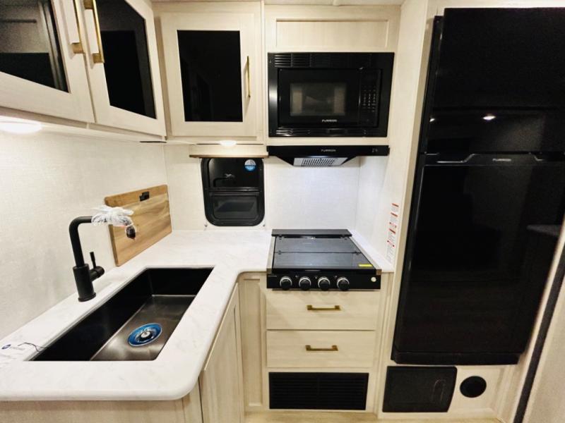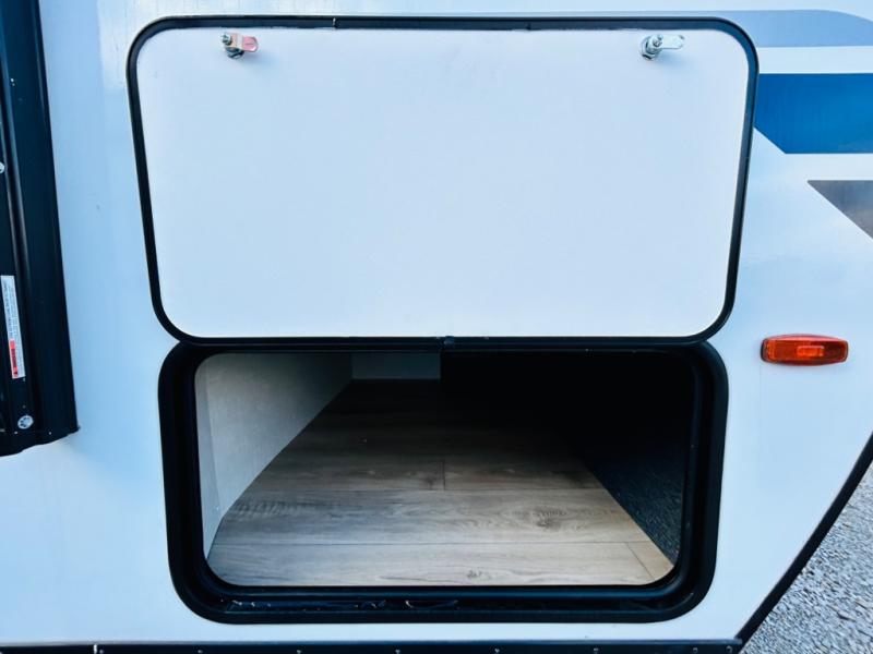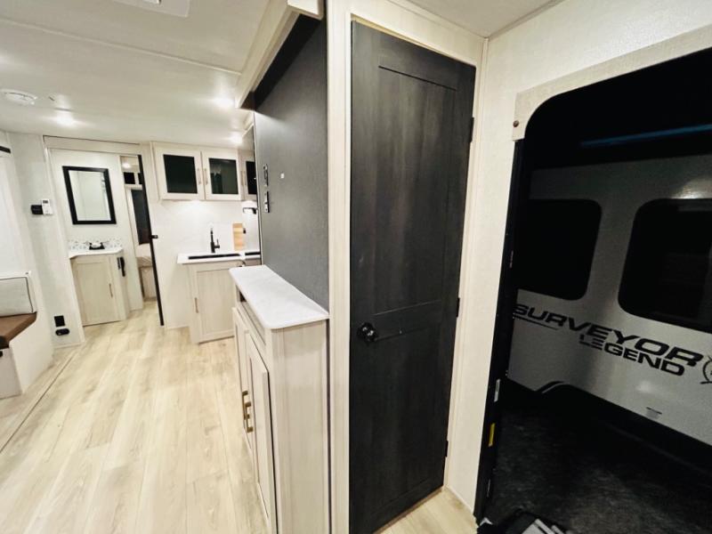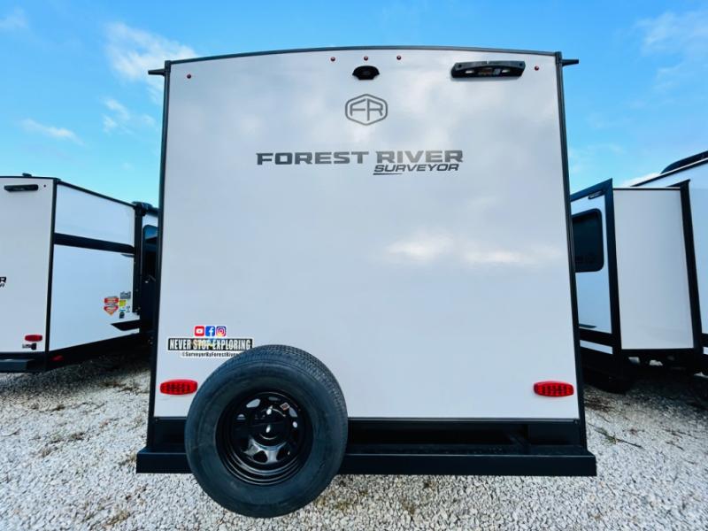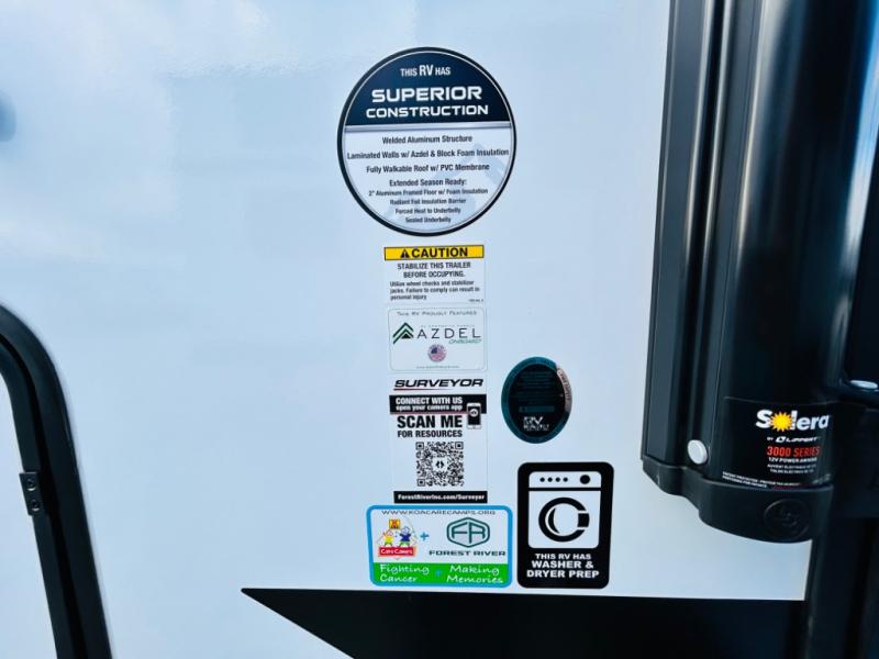 Value and versatility go hand-in-hand with the Surveyor Legend X travel trailers by Forest River. The solid construction includes a 2" aluminum framed floor with block foam insulation and a sealed underbelly with forced heat and radiant foil insulation. A 100-watt roof mounted solar panel will provide some off-grid power, and the power tongue jack will let you easily hitch up and go whenever you're ready. Additional stand-out features include Surf(X) seamless countertops throughout, two A/C units, an electric awning with LED light strip, black glass friction hinge entry door(s), and so much more!
