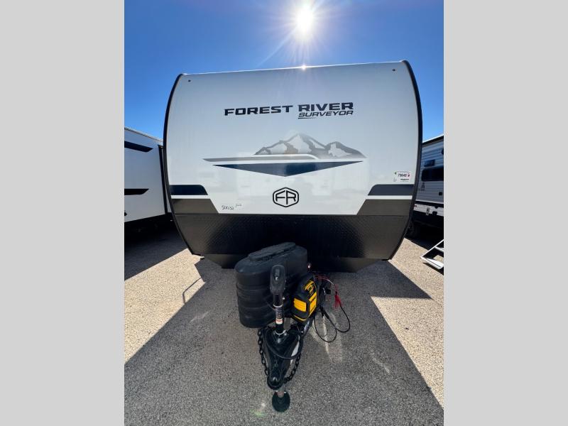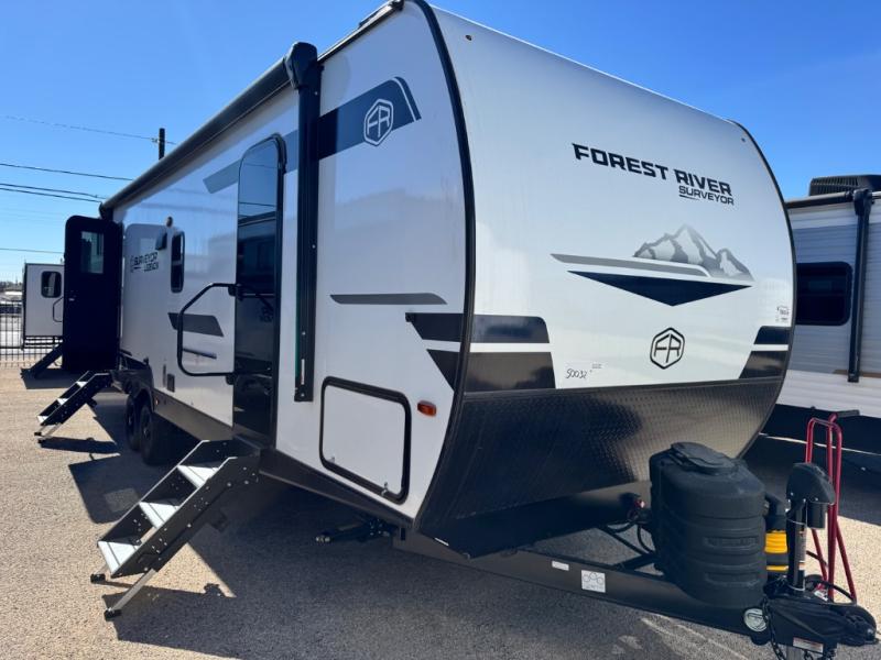 Value and versatility go hand-in-hand with the Surveyor Legend X travel trailers by Forest River. The solid construction includes a 2" aluminum framed floor with block foam insulation and a sealed underbelly with forced heat and radiant foil insulation. A 100-watt roof mounted solar panel will provide some off-grid power, and the power tongue jack will let you easily hitch up and go whenever you're ready. Additional stand-out features include Surf(X) seamless countertops throughout, two A/C units, an electric awning with LED light strip, black glass friction hinge entry door(s), and so much more!