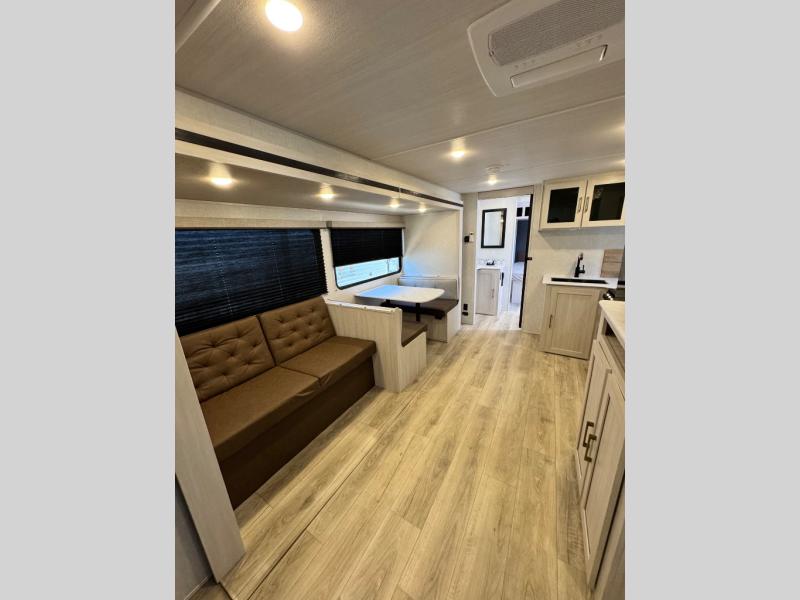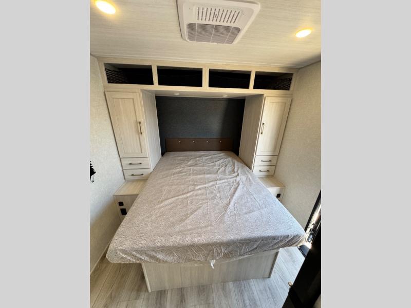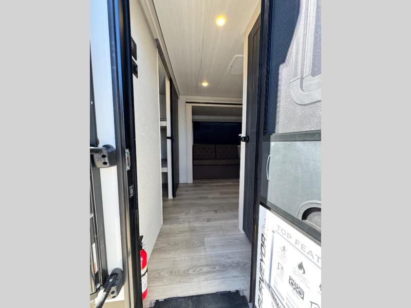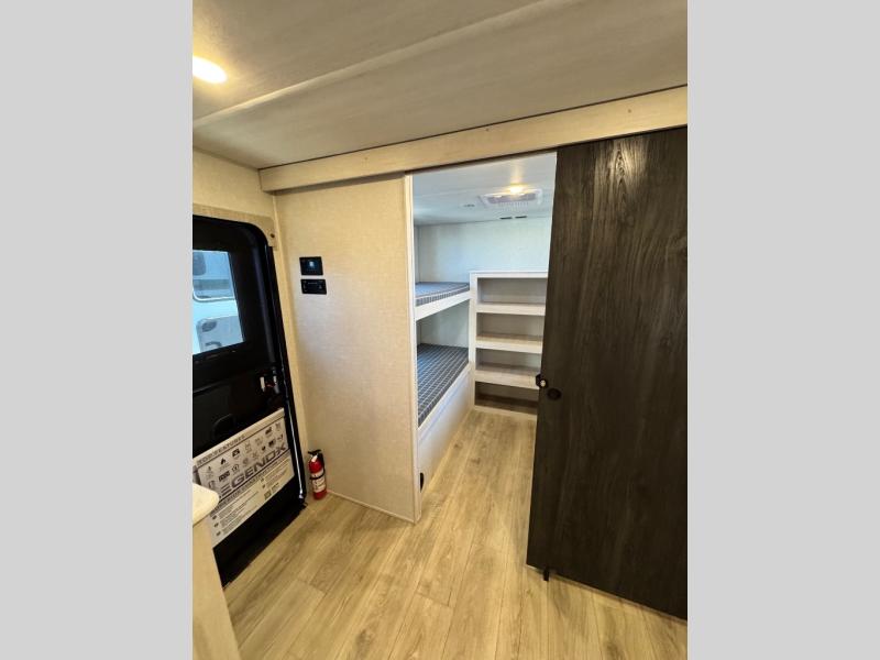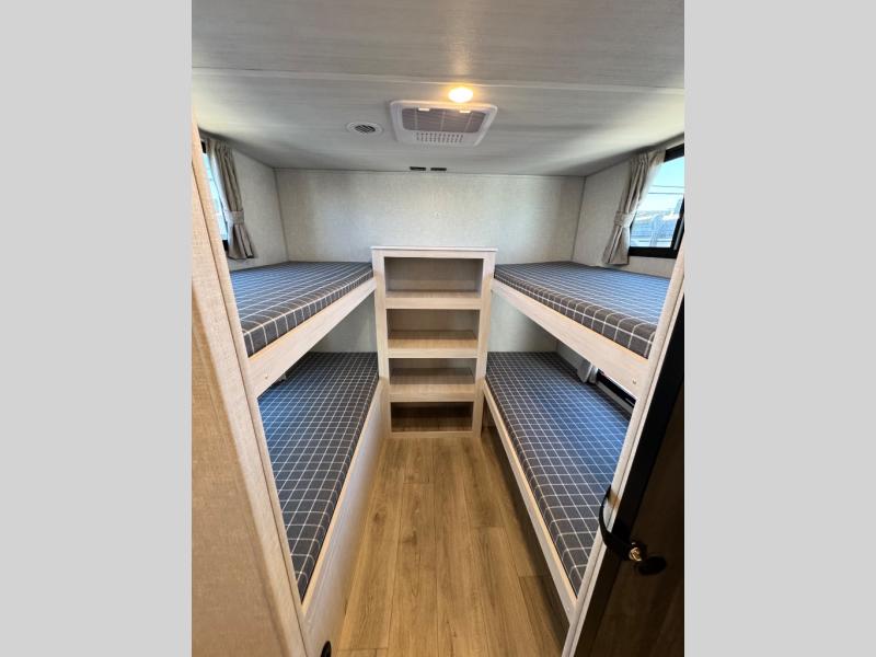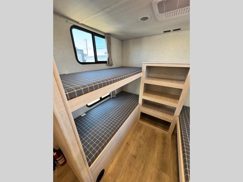 Head to your favorite camping spot with your favorite people in this spacious, dual entry travel trailer! The large slide out houses the booth dinette and sofa where you can relax in the evenings and even let guests sleep over who haven't claimed the quad bunks in the rear bunkhouse. A walk-thru bath is convenient for all, and the full kitchen lets you whip up your best meals in the microwave with an air fryer. And a walk-in pantry with washer and dryer prep makes it easier to go full-time if you choose! When it's time to call it a night, the front master bedroom with a queen bed will provide you with your own space to retreat to, and there are dual bedside wardrobes to keep your clothes organized.